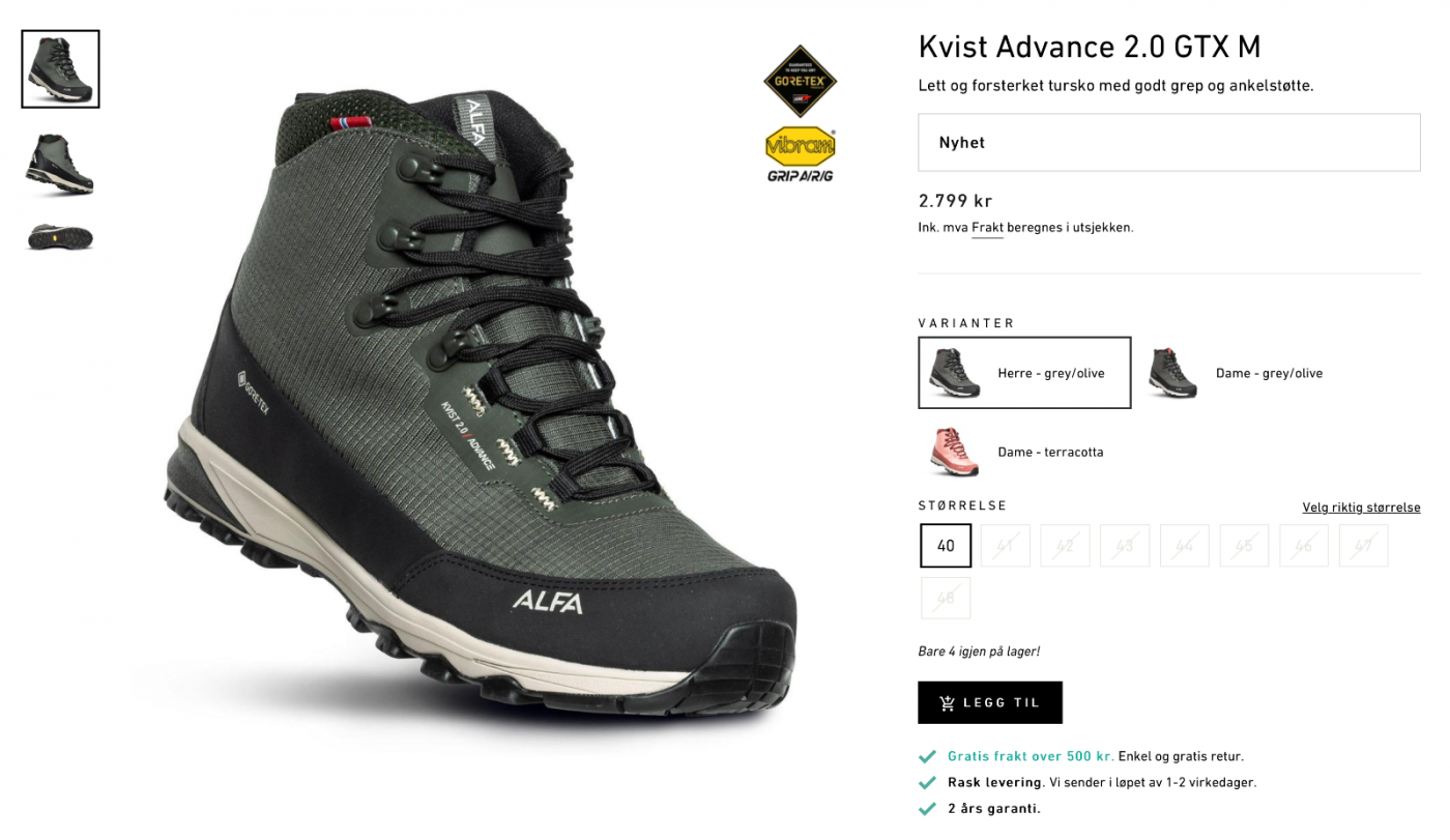 Takk for svar. Jeg fikk de til 2300,- hos Outnorth, så jeg la inn en bestilling og siden de har åpent kjøp får jeg prøvd de godt på foten før jeg eventuelt bestemmer meg. Jeg har prøvd en rekke forskjellige sko, men få jeg har vært like fornøyd med som Alfa skoene mine. Jeg er derimot ikke veldig fornøyd med grepet på sålen i mine Bever Pro... de er til tider ekstremt lunefull på våte berg/steiner/røtter. Noe m/77 skoene mine og en del lave joggesko fikser uten problem. Jeg antar at dette går mer på stivheten i sålen enn selve grepet i gummien, siden det er vibrant såle på begge. Gode sko er et et absolutt for meg, prisen bryr jeg meg lite om da jeg bruker det såpass mye. Crispi passer ikke foten min like godt som Alfa. Salomon skoene jeg har er veldig trang i størrelse å i motsetning til andre sko, må jeg opp i 49 ⅓ for at de skal passe. Mot 47-48 hos alfa 🤣