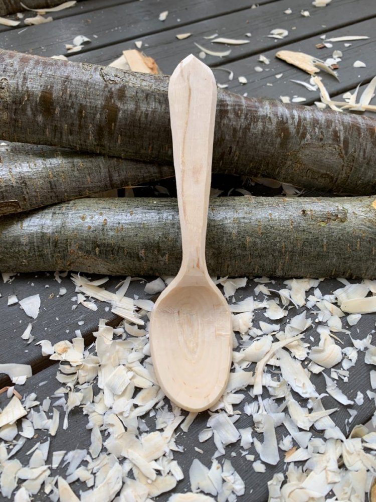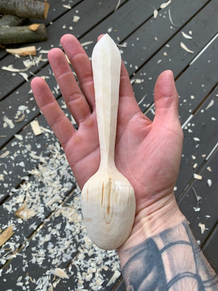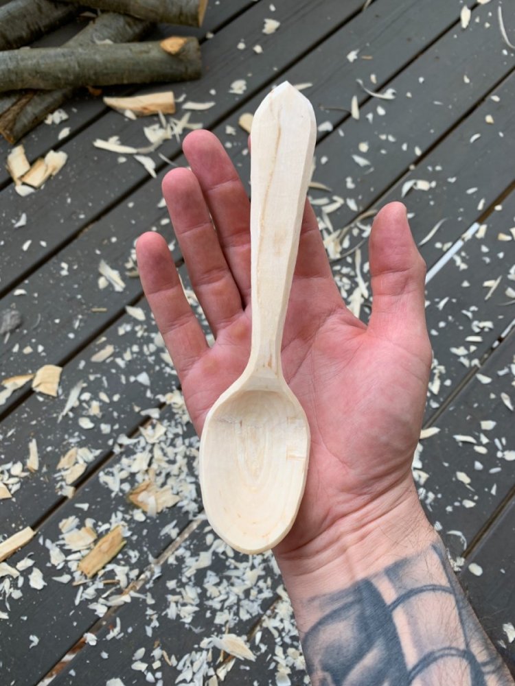 Ble litt ivrig med øksen i dag og trodde jeg hadde ødelagt emnet. Men tenkte jeg kunne prøve litt annen form siden skjeen allerede var ødelagt. merker at frykter for å ødelegge holder meg litt igjen! Ga litt F og ble veldig fornøyd med resultatet, selv om den har noen små skjønnhetsfeil. begynner å få til jevne kutt nå, så blir ikke å pusse de med sandpapir framover. Liker litt den røffe overflaten