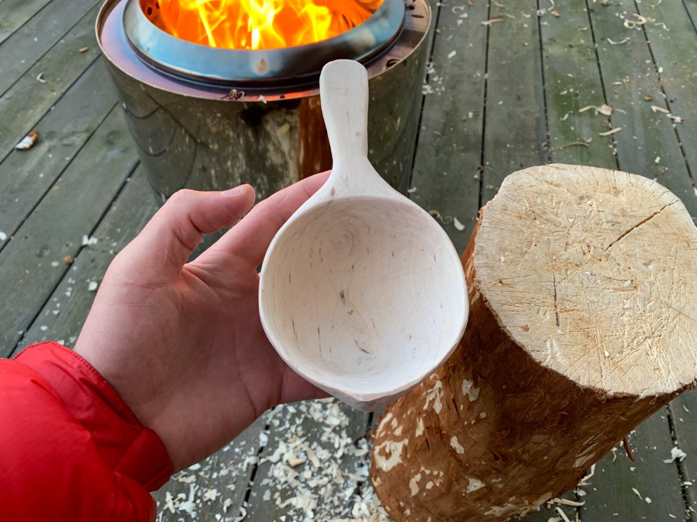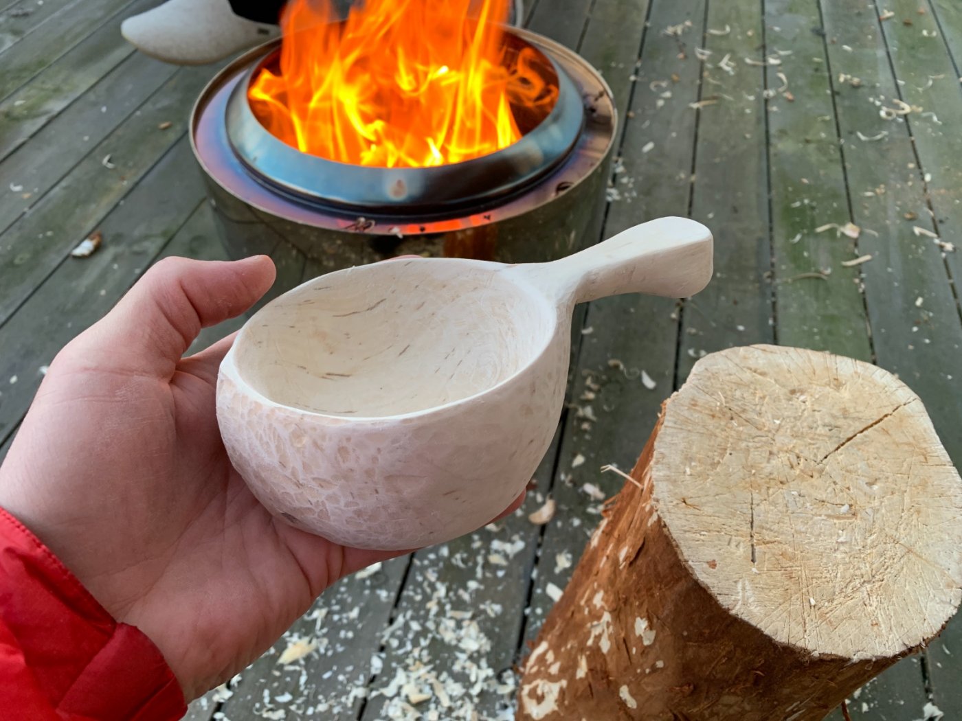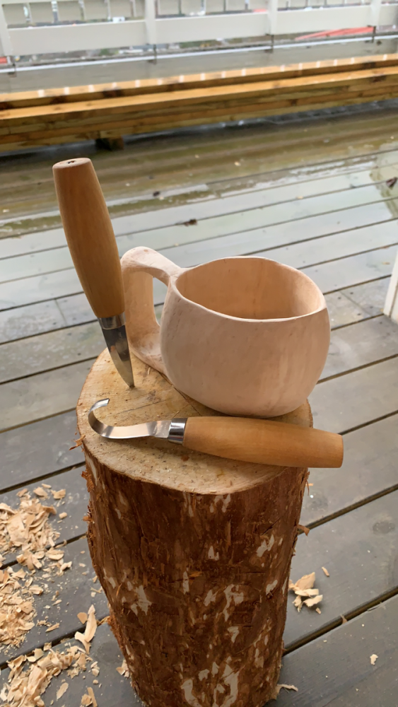1. Dæven, de koppene der likte jeg utførelsen på 👏🏻 Fantastisk hygge å bare sitte ute med bålpanne, litt spikking og sine egne tanker 😊 tipper de koppene er ferdig tørka 👏🏻 15 år er ganske lenge. Holdt på litt i ungdommen selv, men alt annet tok opp tiden! Nå har jeg funnet tilbake til de små gledene, kanskje vi kan takke covid for dette? jeg begynner å nærme meg ferdig med koppen, siden jeg skal prøve å lage litt mønster på den velger jeg å pusse den litt med sandpapir før jeg setter den inn i olje.