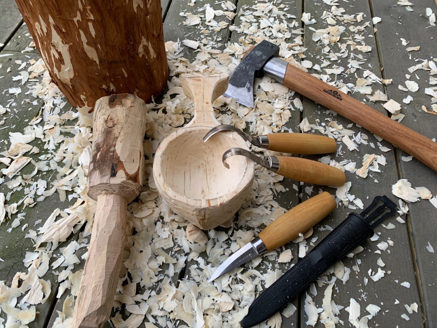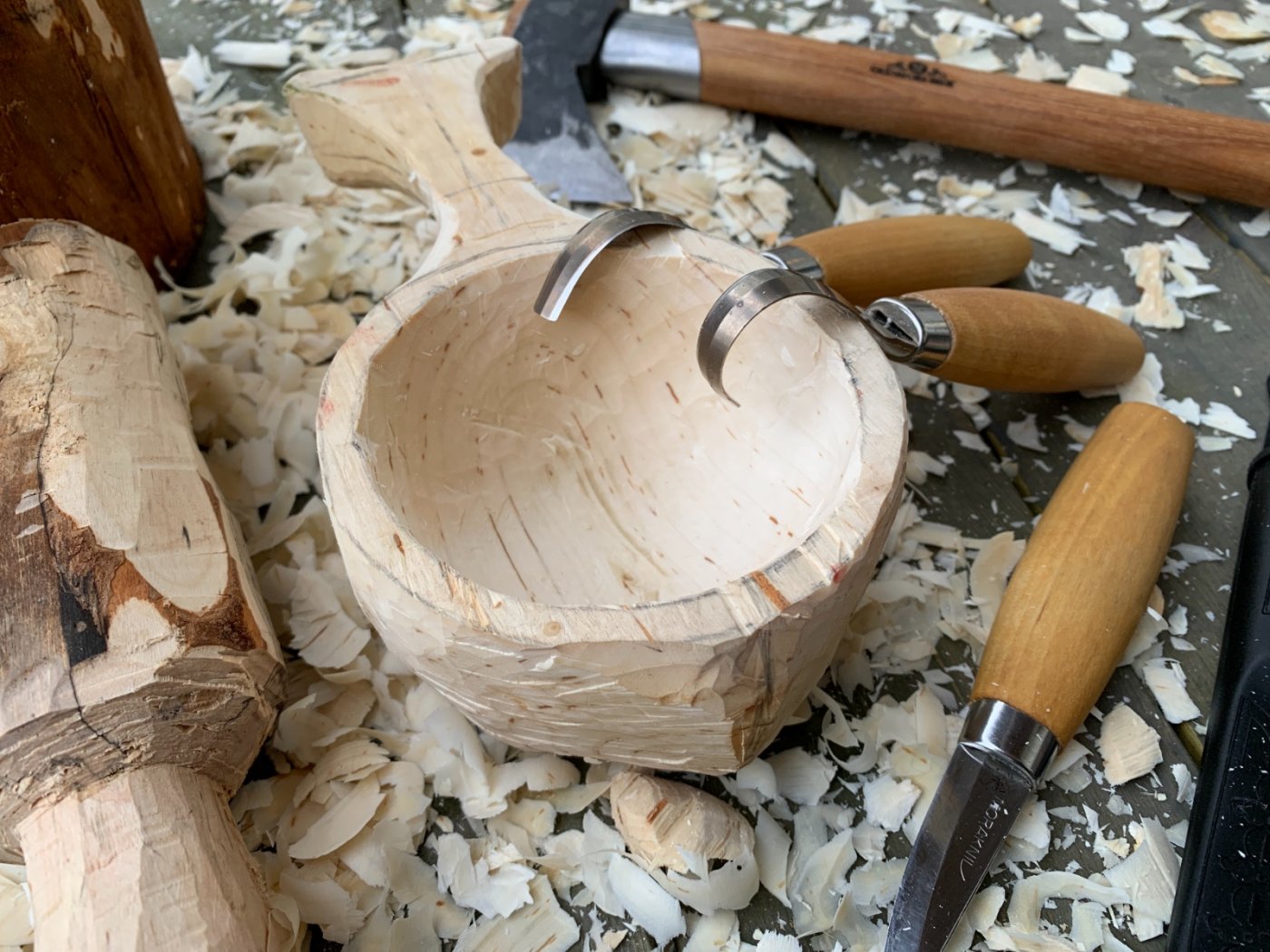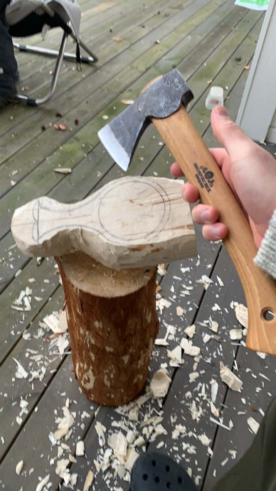 3. Litt fin hugging og justering på selve koppen gikk som en drøm med den nye outdoor øksen! Jeg ser de som driver med dette bruker en egen øks med veldig stort blad, men jeg fant den litt smalere bladet fra outdoor øksen langt mer presist for fin hugging av ytterkant og grad (bue) av koppen nedover 🤔 Begynner å nærme seg farlig nært finpussen igjen! Det er rett og slett terapi å skave ut av bollen med skarpe kniver 🤩 skulle komme pakke fra verktoyas.no i dag, med nytt huggjern, men de sendte bare oljen... så spørs om de ikke var tom på lager! Jaja! Jeg får kontakte de over nyttår å legge til litt ekstra knask på forsendelsen 😂