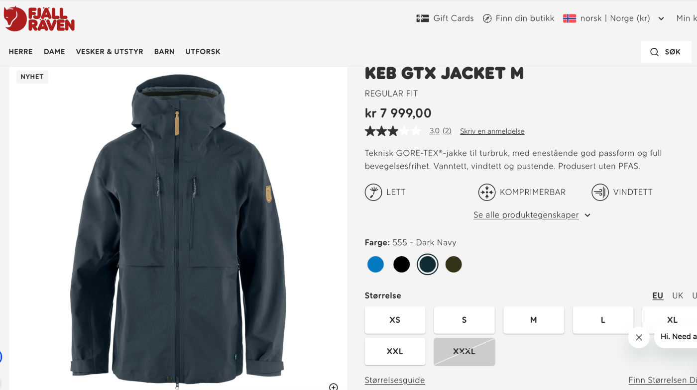 https://www.fjallraven.com/no/no/herre/jakker/skalljakker/keb-gtx-jacket-m/ Jeg er også at en bruker er litt oppgitt over størrelsen på jakkene, at dette er en jakke som passer høye slanke personer best. Jeg må si jeg er litt spent på hvordan denne jakken er. Jeg er ekstremt fornøyd med alt annet fra Fjellreven, bortsett fra prisen 🙈