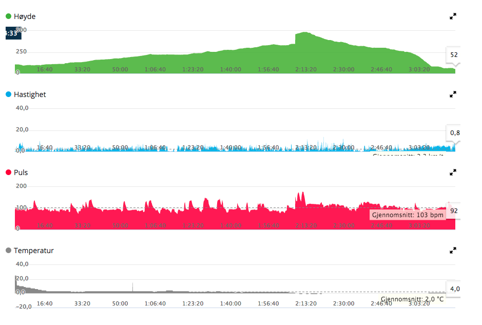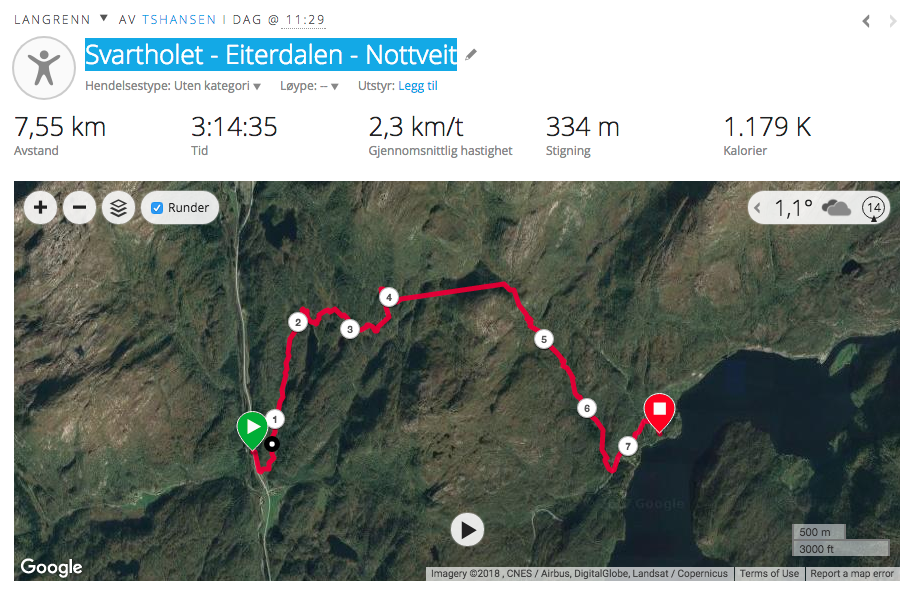 Etter noen timer i løypa i går, med de splitter nye fjellskiene mine... tok eventyrlysten tak i meg på kveldingen. Kart, gps og sondering av snøforhold gjorde at jeg planla en litt lengre fjelltur i til tider krevende terreng. Værmeldingene skulle være bra store deler av dagen, men det ble sendt ut obs varsel for kvelden i dag. Siden jeg planla å gå store deler i lavlandet og daler lot jeg ikke værmeldingene stoppe meg. Lekte meg litt med papirkart og navigasjons muligheten på Fenix 5x klokken la med frokosten. Satt inn et par veipunkt jeg kunne ha som referanse om mobildekning skulle være utilgjengelig. Greit å tørr trene litt sånn du kan det godt den dagen du virkelig har behov for det. Startet turen fra hovedveien og de første 100 meterene var rimelig vanskelig tilkomst og gjorde at jeg holdt på å avbryte hele turen. Men sta som jeg er og etter et par klumsete fall, åpnet terregnet seg litt å gjorde turen langt mer hyggelig. Det var ikke mye glid å snakke om, men man gikk veldig fint oppå snøen som bar preg av skare og bløt under. Jeg gikk opp Langedalen til Svartholet før jeg fortsatte turen videre til Eiterdalen. Jeg husker å ha gått her en gang når jeg var guttunge, men det var på sommer å jeg hadde ikke anelse på hvor stien gikk. Det var godt med is på vannet her, men ikke noe jeg sjanset på å bevege meg utpå. Har stor respekt for islagte vann. Solen gløttet gjennom skydekket noen timer å gå god påskestemning. Virkelig flott i fjellet i dag. Her måtte jeg ha en liten stopp å sjekke kartet grundig. Jeg fikk ikke topografien til å stemme med kartet. Det var rett og slett ingen "dal" ut herfra. Å hvertfall ikke den veien ruten ville ha meg. Så jeg måtte gå en liten omvei og gjennom veldig bratt terreng med mye skog. Her var det bare å knekke innpå litt "bensin" før man kom seg opp til neste elv som skulle føre meg inn mot Eiterdalen. Jeg måtte sjekke kart flere ganger på plasser jeg var "sikker" på hvor jeg var og klarte omsider å finne en smal passasje som tok meg over en rygg, slik at jeg kunne renne ned til Gårdshuset i Eiterdalen. Jeg hadde planer om å nyte en bedre middag og en kaffekopp eller to. Men været snudde fort. Det skyet til, ble flatt lys og vinden tok seg opp.... Faen! Skulle været slå til før tiden? Jeg må være ærlig å si at jeg ble småbekymret en liten stund. Heldigvis er det ikke mange høydemetrene opp fra Eiterdalen før jeg begynner på "nedfarten" mot hytten igjen. Så middag utgikk, å valgte å gå så raskt ned som mulig. Ville helst slippe å bli plaget av sterk vind og dårlig sikt på vei ned. Jeg begynte å bli godt mør i bena og gledet meg stort til å renne ned igjen. Bare sjarmøretappen igjen Men helt så enkelt var det definitivt ikke. Jeg krumma nakken og satte utfor bakken. Det lugget godt under skiene og jeg stupte på trynet i første bakken Hoho! Jeg slo meg ikke, men det gikk brått opp for meg at turen ned kom til å bli veldig slitsom....!!! Det var sjanseløst å renne på fornuftig måte. Å siden dalen var relativt smal med en stor elv i midten ble det mye banning og lite gøy. Kom heldigvis over et hjortetråkk, så jeg kunne ta av skiene å gå relativt greit ned på føttene siste kilometeren Alt i alt en super dag i fjellet. Det fristet veldig til gjentagelse og det blir nok ikke lenge til jeg blir å finne nye fjell å tråkke i