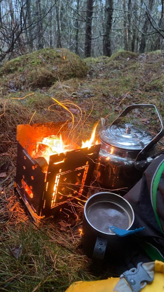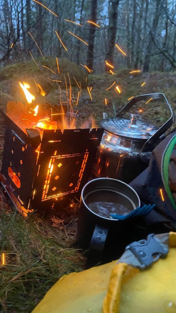 Poenget her var å teste Firebox’n under ekstreme forhold og jeg vil på det sterkeste fraråde alle å gjenta bedriften. Turen i seg selv var vesentlig mer utfordrende en kaffekoke-biten. Litt ustabil krabbing på flat mark -type- ALT for høy promille i pensko på ishålka hjem fra julebord, ymse John Cleese bevegelser og litt for god medvind nedover der nedslaga ikke hadde fått god stilkarakter. Jeg hadde grei kontroll på vinden nede i gropa mi, en elv like nedenfor som stadig kranglet med regelen om tyngdekraft pluss et par åpne Nalgeneflasker med 96% forfriskende væske, litt barnåler, kongler og anna som følte at Gyda ikke var våt nok fra før. I tillegg hadde jeg tidenes regnvær på rundt 150-200 millimeter i en mosegrodd åpen småskog ulykkelig dyvåt etter 1-2 ukers vanning. Under forsøket brukte jeg 3 stk ferdig oppskåret bjørkebiter for bedre krisehåndtering ved prosessfeil, av erfaring vet jeg at «ting bare skjer lissom». Utfordringen lå mest i å i det hele tatt få fyr, selv med stormlighter, rødsprit på fille, bjørkenever og parafinposer. Nei -jeg brukte ikke bensin, JA jeg hadde lyst! Veldig lyst!! Under hele eksperimentet hadde jeg på tykke skinnhansker og vernebriller. Av hensyn til behov for å virke kul & hipp valgte jeg ikke å nevne dette tidligere Firebox’n stod stødig selv når den ble flyttet til mykere underlag for å se hvordan vinden påvirket under ulike forhold med og uten kaffekanna (inkl. 1 liter vann) før jeg tente på’n. Den klarte seg eksemplarisk men med kjele i vindkasta ble slagsiden litt for ukomfortabel. I vind over 20 m/s hadde jeg gått for MSR XGK EX‘en hver gang! Denne står på ei lita plate, er halve høyda med en 1.2L primuskanne. @Skogens Stønn Har helt rett når han poengterer at å lage mat under slike forhold ikke er formålstjenlig, det kan jeg kvitere på etter dagens kaffe. Allikevel må jeg innrømme at den eneste grunnen til at jeg ikke har laget mat på et biltak i 100 km/t er fordi fattern aldri turte å kjøpe takgrind . Måtte folket få en helg med vind i seilene 🥰 -