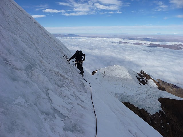 Jeg og Nicolas fikk med oss Kevin (som jeg traff tidligere i sommer i Huaraz, Peru) på en opplevelsesrik reise og klatretur til det tredje og fjerde høyeste fjellet i Bolivia, nemlig Ancohuma (6427m) og Illampu (6368m). Alt forløp ikke helt som planlagt, som dere vil se om dere leser videre. Eksterne Lenker: Alle bilder kan sees her: https://picasaweb.google.com/lyngve/0499Ancohuma?authuser=0&feat=directlink GPS-track fra turen finnes her: http://www.everytrail.com/view_trip.php?trip_id=1267663 Shit, I forgot my plastic boots! (Dag 1) Kevin glemmer å ta med seg plastikkstøvlene idet vi går av minibussen. I ren fortvilelse ser vi minibussen forsvinne oppover en av La Paz sine mange gater. Vi ser ingen drosjer å praie i nærheten, så Kevin legger på sprang oppover gaten, men han innser fort håpløsheten i dette. Det finnes tusenvis av slike "collectivios" i La Paz sine gater, og å gjenfinne den vi satt på med, vil være som å lete etter nåla i høystakken. Vi beveger oss etterhvert bortover til Cementerio og gaten hvor det går hyppig offentlig transport til Sorata. Vi har nemlig avtalt å møtes Nicolas der kl. 08, for å ta en minibuss til Sorata, hvor vi sammen skal klatre Ancohuma og Illampu. Men uten plastikkstøvlene til Kevin ser det nå litt håpløst ut, i allefall for Kevin sitt vedkommende. Kevin bestemmer seg for å stå gatelangs en stund for å se om minibussen kommer tilbake samme rute som den gikk opp, med et ørlite håp om at han vil gjenkjenne minibussen/sjåføren og få tilbake sine dyre plastikkstøvler. Men etter 1 time gir vi opp dette, og jeg og Kevin bestemmer oss for å dra ned til Andean Basecamp hvor de har plastikkstøvler for utleie. Heldigvis har Andean Basecamp åpnet butikken for dagen, så vi finner fort frem til et par støvler som passer til Kevin, og drar oppover igjen til Cementerio og gaten hvor minibussene til Sorata holder til. Vi kommer oss etterhvert avgårde med en minibuss før kl. 11. Det tar 3-4 timer å komme seg til Sorata i en Toyota Hiace fullstappet med lokale indianere. Vi betaler 17 bolivianos (13 NOK) hver for denne minibussen. Vel fremme i Sorata, oppsøker vi Casa de Guias. Men det viser seg dessverre å være en grådig kar som styrer denne monopol foreningen av guider og portere i Sorata. Han skal nemlig ha 200 bolivianos (150 NOK) for å arrangere 4x4 transport oppover fjellet, og 150 bolivianos (115 NOK) per dag for porter. Dette er nesten dobbelt så dyrt som i Pinaya, ved foten av Illimani. I ren nysgjerrighet spør vi en taxi på gaten hvor mye han forlanger for kjøreturen fra Sorata (2700m) og så langt veien går oppover mot Laguna Chillata. Taxi'ens utropspris er kun 100 bolivianos (75 NOK), og i motsetning til fyren hos Casa de Guias, sier taxi sjåføren at veien er fullt kjørbar uten 4x4 opp til 3500m. Vi går umiddelbart tilbake til Casa de Guias og ber fyren om å annullere transporten, men da blir han sint og sier at enten er det deal eller no-deal på hele pakken med transport og portere. Usikre på om vi klarer å skaffe portere på annet vis, har vi ikke noe annet valg enn å akseptere avtalen. Ettersom prisen på portere er så vanvittig høy i Sorata, bestemmer vi oss for å begrense bruken av portere, og heller bære alt selv det korte stykket fra veien og opp til Laguna Chillata. Vi leier derfor portere kun for den andre dagen, da vi skal bevege oss fra Laguna Chillata (4200m) og opp til Laguna Glacier (5040m). Idiotisk nok inngår vi ingen avtale om portere for den lange dagen i ukjent terreng (og uten sti) mellom Ancohuma BC og Illampu BC. Den tabben skal senere vise seg å bli en effektiv "show-stopper" for Illampu. Det viser seg at sjåføren til Casa de Guias har en komfortabel Toyota 4runner, så kanskje prisen er verdt det likevel. Vi kjører forbi flere små landsbyer på veien oppover. I ca 3500m høyde ankommer vi et større beiteområde. Her er veien blokkert med flere steiner, sannsynligvis for å hindre normale biler (uten 4x4) å kjøre høyere. Sjåføren fjerner steinene og vi kjører videre oppover på en betraktelig dårligere vei. Han tar oss etterhvert helt opp til 3900m, på en stengt gruvevei, for et tilleggsgebyr på 30 bolivianos (23 NOK). Herfra er det bare en liten gåtur til Laguna Chillata (4200m), men med tunge bører på våre rygger, bruker vi nesten en time på dette. Det finnes mange egnede plasser å sette opp telt rundt dette flotte vannet, men i den tette og kjølige tåka velger vi det første og beste stedet vi ankommer. Trøbbel med portere (Dag 2) Våre to portere ankommer som avtalt litt før kl. 09. I Sorata hadde vi fått streng instruks om at hver porter kunne bære max 18 kg, i motsetning til Pinaya (Illimani), hvor vår porter hadde mellom 25-30 kg uten å klage. Den ene porteren rynker litt på nesen da han tester vekten på den ene sekken. Kanskje er den et par kilo for mye, men han godtar den likevel til slutt. Stien opp til neste leir, Laguna Glaciar (5040m), viser seg å være langt lettere å følge enn det vi har lest/hørt om på forhånd. Vi bruker ikke mer enn ca 3 timer og vi kunne godt klart oss uten portere som veivisere. Vi møter på to tyske jenter med guide og portere, som alle er på vei nedover. De forteller oss at de ikke nådde toppen av Ancohuma p.g.a høydesyke. Ved Laguna Glaciar holder også tre tyske gutter til, et par av dem har litt høydesyke, men de planlegger likevel å bestige både Pico Schulze (5934m) og Ancohuma (6427m) de neste dagene. I motsetning til oss har de en porter som hele tiden vokter deres utstyr i leiren, bl.a. for å forhindre tyveri. Før vi sender ned igjen våre to portere, prøver vi å avtale at en av dem skal komme opp igjen om 3 dager for å bære utstyr fra Ancohuma BC til Illampu BC, i tillegg til å være veiviser på denne vanskelige traversen. Men vi kommer ikke til enighet, pga prisen og alle tilleggskravene han stiller. Så derfor sender vi dem ned igjen uten tips, og det betyr at vi må