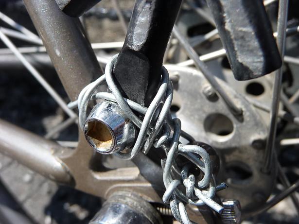 Fine omkjøringsveier til alle tunnelene på Haukeli, men da jeg skulle opp Røldalsfjellet og Seljestadjuvet var bommen stengt. Tok ikke sjansen på en bomtur, så jeg syklet derfor gjennom tunnelen. Min lengste tunnell noensinne (8km ifølge kartet) og det meste i slak oppoverbakke. Den ene stanga til bagasjebrettet knakk på vei ned til Røldal. Noe fryktelig bråk da den tok bort i eikene på hjulet. Fikk fikset dette midlertidig med stål wire. Se bilde! Takk for mange gode innspill. Jeg tar Stalheimskleiva og Gudvangen imorgen !! Stoppet på Kvanndal etter 11.5 mil idag