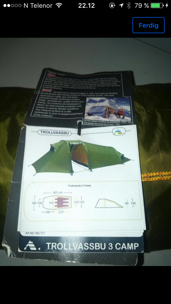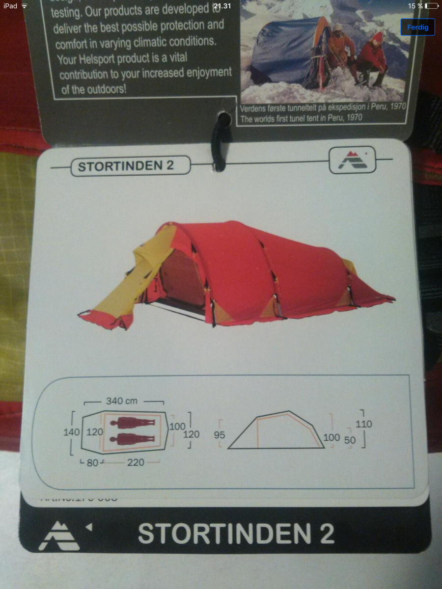 The North Face VE25. Ca 5 år gammelt og godt brukt, ser ut som ett lappeteppe. Elsker det teltet, god plass, selv for to voksne, to unger og ei giantisk bikkje. Stødig som en bunker, lett å sette opp, god plass alle veier og funker alle årstider. Eneste minuset med det her teltet er den store pakkstørrelsen og vekta. Helsport Fjellheimen 3 Superlight, brukes når jeg og dama skal på lengre turer uten unga. Ikke like glad i det teltet... De kan jo ikke sammenlignes, men når jeg oftest bruker VE25 så finner jeg ikke samme komforten i Helsport teltet.
