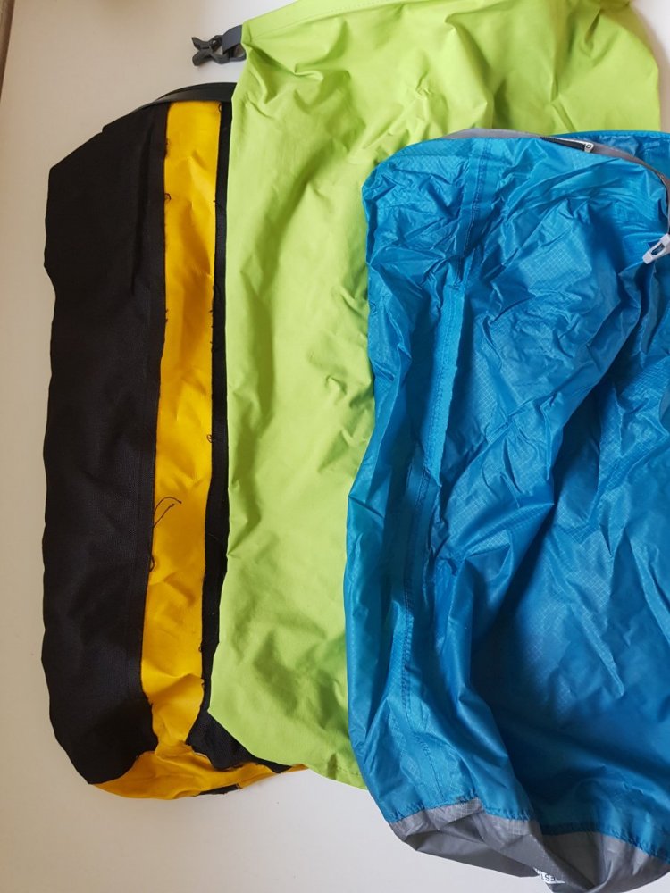10. Her er noen av de jeg har: Nederste er vel der du kaller sjøsekk (bruker disse til tørrpakking i kajakk) Øverste er de i ultrasil fra STS du nevner innledningsvis, brukes som pakkposer for å skille innhold (og legges i annen tørrpose på kajakktur, eller rett i sekk på fottur). Mellomste er en mellomting i i 70D med coating på innsiden, de er ganske myke pakkes rett i kajakk eller brukes som de i ultrasil på fottur. Har også noen av disse vanntette i TPU som er delvis gjennomsiktige, dvs lett å finne igjen innhold i. Bruker dem til elektronikk, "first aid" og annet hvor jeg ønsker det skal være lett å se innhold som skal plukkes ut.