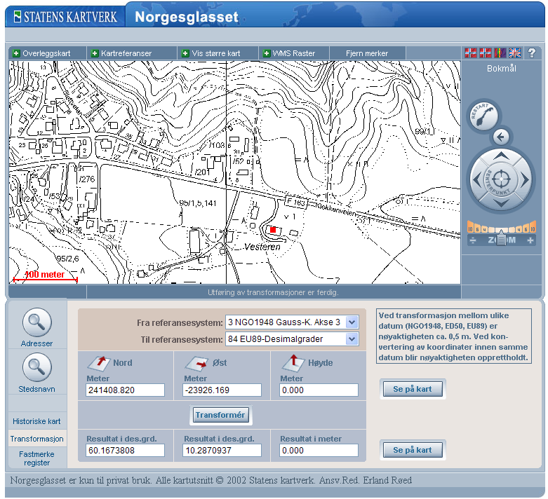 Norgesglasset har en veldig bra funksjon: "Transformasjon", i menyen nede til venstre. Punkt i ØK-systemet kan da konverteres til f.eks. desimalgrader i WGS-84, eller ønsket UTM sone. Da kan man zoome helt inn på enkeltbygninger, klikke på dem og få ut koordinatene på ønsket format. Bruk "se på kart"-knappen for å få en markering (sjekk) på at punktet er plassert der du vil ha det. Man kan også legge inn egne koordinater og få dem vist eller konvertert. For eksempel bruker mange karttjenester i Norge UTM sone 33 for hele landet (sone 31-36). De færreste GPS'er aksepterer sone 33 koordinater utenfor sone 33-definisjonen. Legg koordinatene inn i transformasjonsmenyen, og konverter. Flere tips finnes på gps.no. Obs: Min erfaring er at mye og rask klikking vil gi tjenesten "hikke". Avslutt nettleser og prøv på ny, men litt mer tålmodig denne gang Jankj
