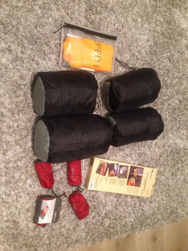 Exped Downmat 9LW til meg Exped Downmat 9M til fruen 2 stk Exped Downmat 7M til barna 4 stk Exped Airpillow M Exped Schnozzel Bag UL L I tillegg vant jeg et Eagle Toastjern til bålbruk for å ha deltatt på fjelltrimmen 😊