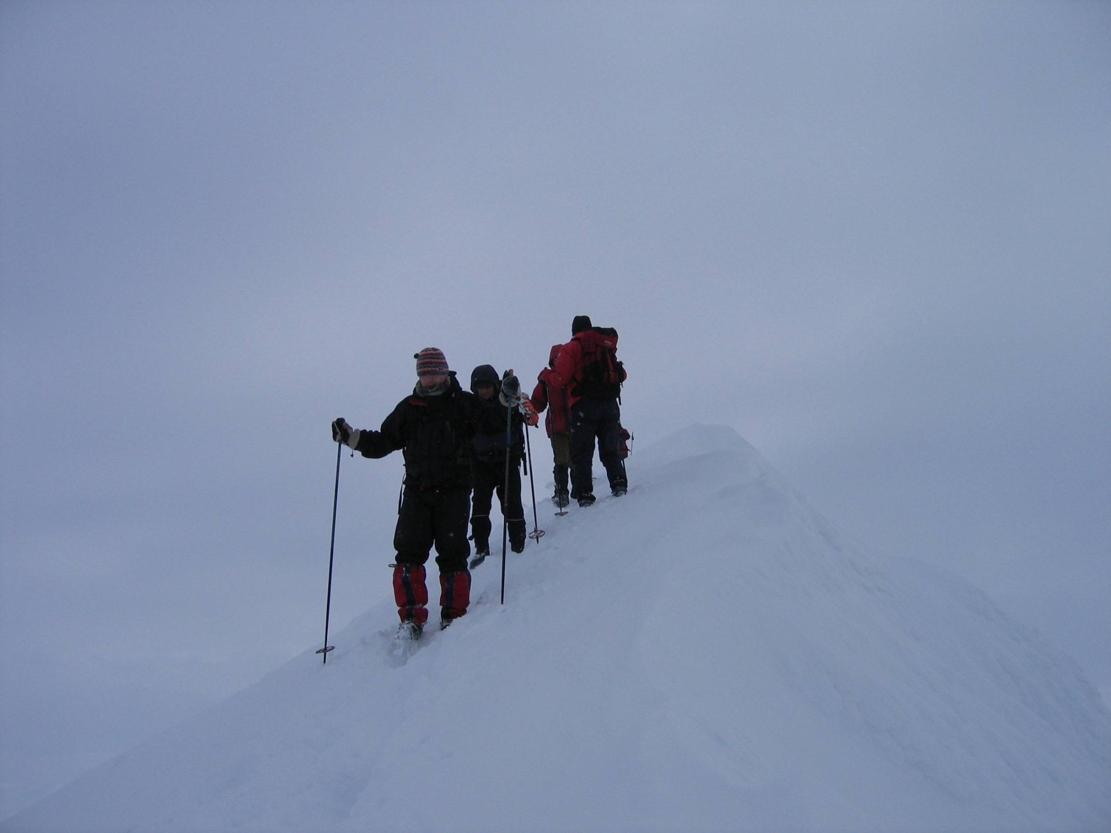 9. Da vi gikk opp var det gunstige snøforhold, og det er det sannsynligvis nå og. Vi gikk usikret på toppen, men det er langt ned på begge sider så forsiktighet må man utvise, uansett. Tror det er langt ned til fjellet på toppen nå, så snøsikringsmidler er det mest aktuelle, ja.
