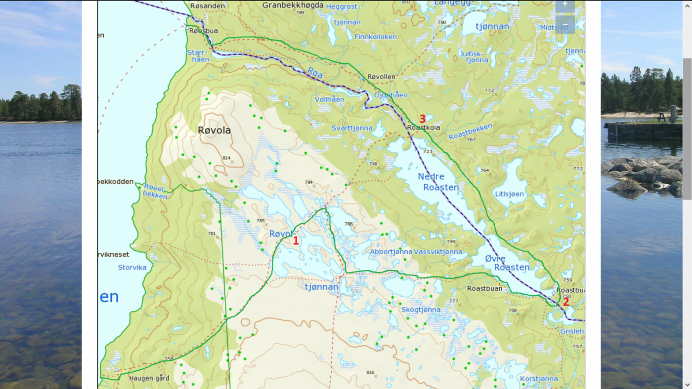 Ny rute etter innspill fra Bjarne. Vil denne ruta være ferdbar? Vil det gå greit å gå på sør-vest siden av Nedre Roasten? Med denne ruta kommer jeg også innom Vassviktjønna og Svarttjønna, som anbefalt. For dere som er kjent i terrenget, hvor lang tid vil vi bruke på disse dagsrutene, forutsatt at vi finner oss greit frem uten for mye surr? Kjellis, du nevnte at det kan være mulig "å gå rundt" Gislehåen? Vil det si at jeg kan komme meg tørrskodd over elva et eller annet sted oppstrøms? I såfall hvor?