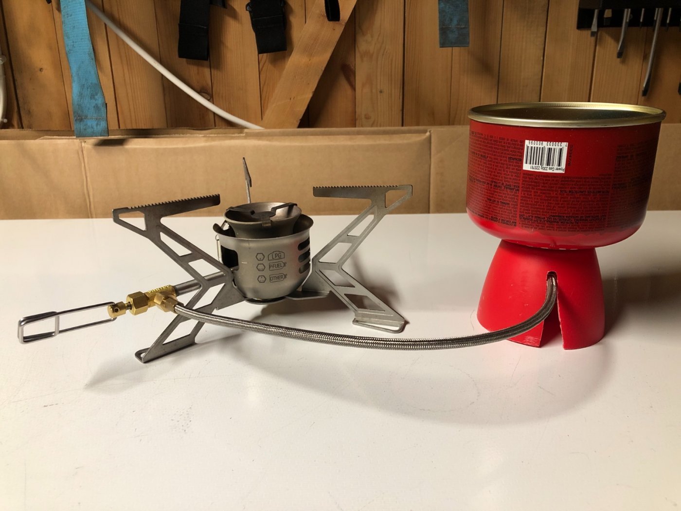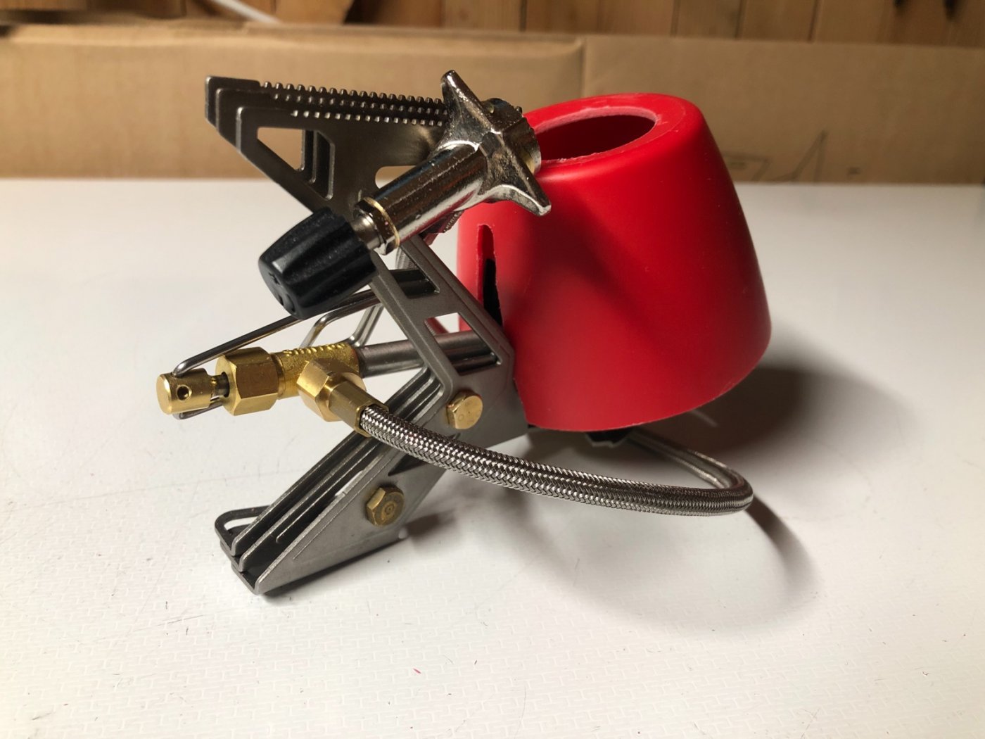 Fikk bare så lyst å prøve å lage noe som kunne funke til dette formålet. Ikke verdens vakreste patent, men den funker fint i alle fall. Tar minimalt med ekstra plass når pakket rundt Primusen og veier kun 20 g. Får også god tilgang til justeringsventilen. Kjøpte meg en kopp for 10 kr på Jula og sagde den til rett høyde. Boret ut hull til boksen og åpning til slangen. Om jeg kommer til å gidde å ta den med på tur får vel heller tiden vise 😅