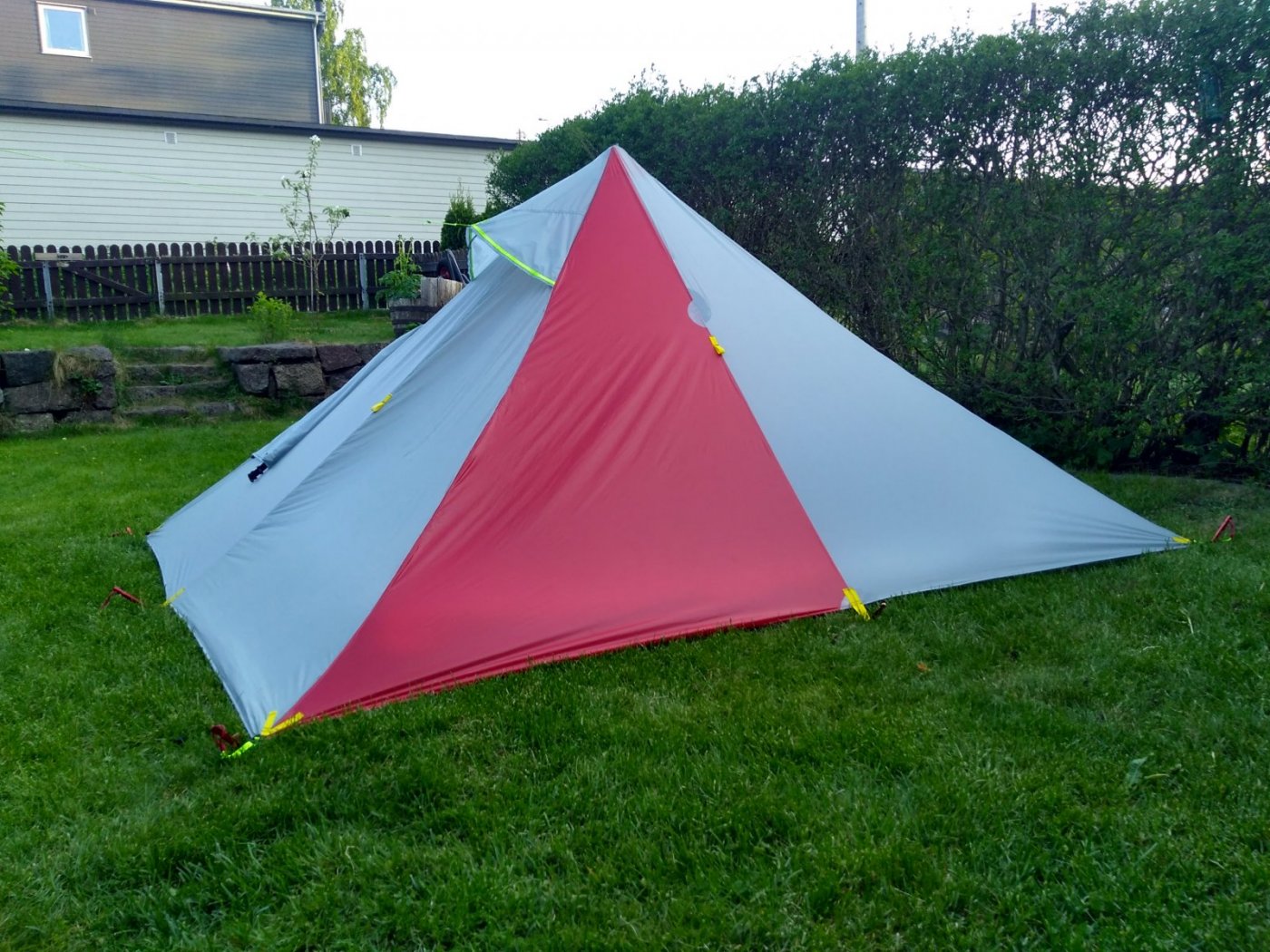 700 gram veid på en billig bagasjevekt. Det er da uten barduner , og mangler foreløpig noe som stiver av lufteåpningen. Det vannavstøtende YKK glidelås på ca 120cm i front som sikkert veier 100g. Sto greit i kastevind i hagen, men den helt store påkjenningen var det vel ikke.tåler også fint en halvtime under vannsprederen, selv om sømmene ikke er forseglet ennå. Skal ha på 4 bardunfester til , så totalt 8 barduner blir mulig. Innertelt med grunnflate 240*95 er under konstruksjon, men oppussing av stue kom først i køen.