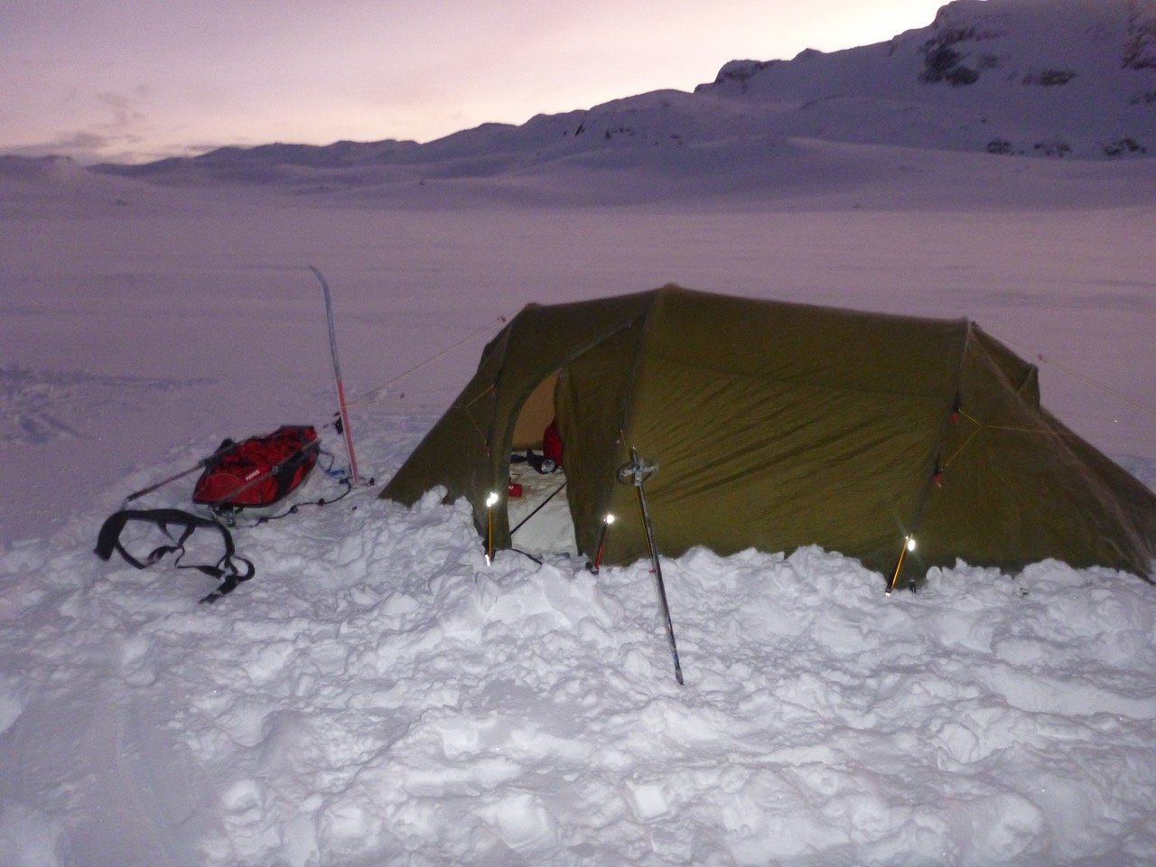 Hei Memento. Takk for tilbakemelding. Ja brukte rødsprit til formvaring og fritidsparafin fra Circle K til brensel. Hadde med en Spot ja. Hadde mobildekning på flere av teltplassene så fikk lastet inn oppdatert værmelding fra yr innimellom til mobilen. Hei Jan, Takk for tilbakemelding Jeg brukte en enkel vintersovepose fra Hagløfs som har T extreme 39 eller noe sånt, men med komfort spesifikasjon som ikke er mer enn rundt 15/20 tror jeg. Jeg var i utganspunktet skeptisk til denne i sprengkulda og har uansett alltid med en ekstra tre-sesongs sovepose liggende i pulken sammen med en fjellduk i tilfelle teltbrann og alt brenner opp. Da er det verdifullt med en ekstra sovepose liggende i pulken. Hvis jeg hadde frøset i Hagløfs posen hadde jeg hentet denne ekstra posen inn fra pulken og doblet opp, men det ble det ikke behov for. Mulig at dampsperren og det at jeg også lukket igjen mye av arctic beddingen når jeg sov bidro til en del ekstra stillestående luft som ga ekstra isolasjon. Jeg var som sagt skeptisk til denne posen, men det gikk greit. Reinsdyskinnet i bunn hjelper jo også.