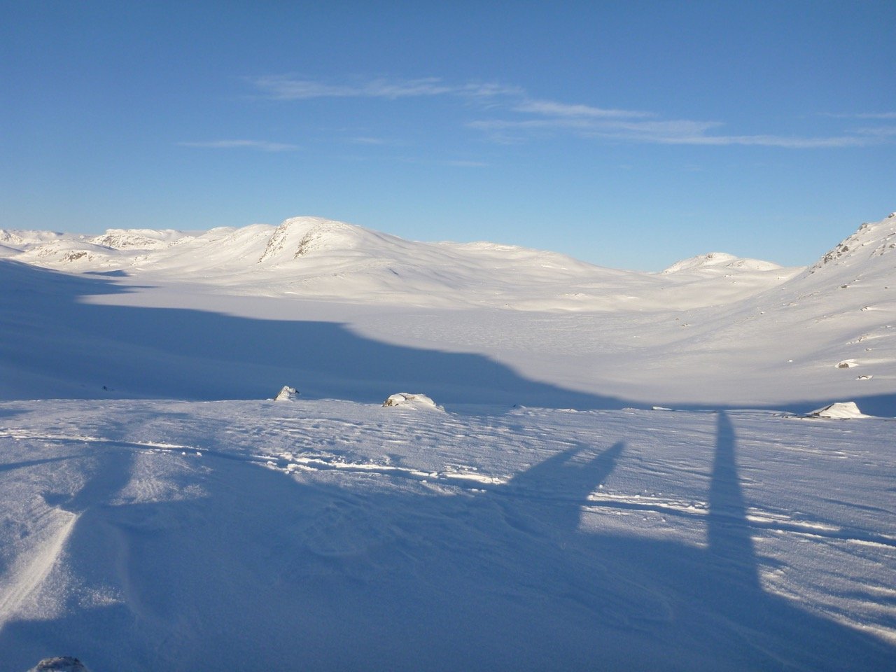 Bilde 1: Idyll ved Hansbuflåten i kaldt norsk vintervær Her følger en turrapport fra tur alene over vidda fra Finse til Rjukan i perioden 2.2.18 til 11.2.18. Jeg har valgt å inkludere en del detaljer og erfaringer rundt rutevalg osv som kanskje kan være til nytte for andre som planlegger å gjennomføre denne turen Hilsen Haavard Haaskjold Dag 1: Finse 1222 - Hansbuflåten Etter å ha tatt nattoget fra Tronhdiem til Oslo S fikk jeg en flott togtur mot Finse i strålende solskinn. Etter en liten halvtime med forberedelser på Finse startet turen i to-tida fredag ettermiddag. På Finse hadde det snødd mye de siste dagene så det var relativt tungt å gå i dyp nysnø, men været var helt fantastisk. Blå himmel, nesten vindstille. Teltet ble satt opp ved Hansbuflåten noen kilometer sør for Finse. På perrongen i Oslo hadde jeg blitt kjent med en annen fjellvandrer med pulk som skulle til Finse og vi slo følge denne dagen før han returnerte dagen etter. Soveposen som jeg bruker er en helt ok vintersovepose, ikke en veldig dyr en. Men selv i netter med 30 minus hadde jeg det komfortabelt. Til liggeunderlag bruker jeg reinsdyrskinn og et «vanlig» enkelt liggeunderlag. Det duger fint. Både reindsdyrskinn, liggeunderlag og sovepose var pakket i en «arctic bedding» som er utrolig kjekk på slike turer. I denne kan en pakke mye av det en trenger inne i teltet. Beddingen ligger oppå pulken og dras bare rett inn i teltet. Da er det bare å åpne den og vips så ligger både underlag og sovepose ferdig utrullet. Inne i soveposen bruker jeg en hjemmelaget dampsperre av søppelposer. Jeg sover da med tynt ull på kroppen inne i denne plastposen. Dermed blir all fuktigheten fra kroppen fanget i denne posen og gjør ikke soveposen fuktig. Det blir litt klamt inne i plastposen, men det venner en seg fort til. Dette har jeg brukt på vinterturer tidligere (bla i fjor når jeg gikk en uke i Sylan) og det fungerer utmerket. Jeg hadde ikke problemer med kulde selv om det var flere netter i minus 30. Soveposen holdt seg tørr og fin. En liten varmeflaske med varmt vann puttet jeg nederst i posen for å gi litt ekstra varme på bena. Jeg hater å fryse på bena, så da er det skikkelig god komfort med varmen fra varmeflaska. Inne i teltet har jeg laget meg en hjemmelaget «ekstra bunn» av tynn enkel bobleplast som lå løst inne inne i teltet når jeg rullet det sammen. Denne fungerte greit og ga et ekstra isolasjonslag mot bakken inne i teltet. Vottesystemet jeg bruker er ullvott innerst, deretter en fleecevott utenpå og så en vindvott ytterst. Tanken her er at fuktigheten går gjennom ullvotten ut i fleecvotten. Dermed blir fleecevotten fuktig, men ikke ulla. Fleecevotten tørker jeg også på kroppen. Selve vindvotten rensens for ispartikler hver kveld (både innside og utside). Dampsperre bruker jeg også i skoene. En tynn ullsokk innerst, en rema1000 plastpose og så en tykk ullsokk. Dermed holdes den tykke ullsokken og selve skoen seg tør mens den innerste tynne ullsokken blir «søkk våt». Denne sokken tørker jeg hver natt på kroppen (i lysken). Utenpå skiskoene har jeg tredd en gammel ullsokk, det gir også ekstra isolasjon. Mange av disse detaljene har jeg lært fra boka til Børge Ousland (Ekspedisjonshåndboka). Her deler han av sine erfaringer om hvordan håndtere problemet med kondens og fuktighet i kulda. En bok som absolutt kan anbefales. Dag 2: Hansbuflåten - Finsbergvannet (1190) En god natt i teltet , selv med temperatur på ned mot -30 var det godt og varmt i posen. Klarte faktisk å forsove meg til klokka 8.30! Først klokken 10.30 var jeg klar til å gå. Fra nå av ble vekkerklokka satt til 05.20 sånn at jeg er klar til å sette avgårde når det lysner i halvåttetida hver morgen. I dag var det skikkelig kaldt og da tar ting tid. I tillegg var det mye dyp snø så jeg sneglet meg videre sørover med utallige pulkvelt i den dype snøen. Det var klar blå himmel og lett å navigere etter kartet. Vinterruta mot Krækkja er ikke kvistet så tidlig på året, men jeg gikk en trase tilnærmet lik der denne vanligvis går. Brattefonnsvatnet (1381)-Midnutevatnet (1323) deretter ned til Finsbergvannet (1190). Opp fra Finsbergvannet er det en bratt stigning på seksti høydemeter. Jeg har blitt fortalt at denne bakken visstnok omtales som «Wiesel bakken» ettersom det en gang i tiden var et femtitalls personer som måtte til for å trekke opp en Wiesel beltevogn som hadde kjørt seg fast her. Uansett. Klokka var 16.30 og mørket falt på så jeg bestemte meg for å slå leir i bunn av denne Wiesel-bakken og heller starte på den neste morgen når jeg var uthvilt. Bilde 2: Tining av Japp i sprengkulda Dag 3: Finsbergvannet (1190) - RV7 ved Fagerheim Frisk og rask etter en ny god natt i teltet gikk det greit å komme seg opp Wiesel-bakken. Det tok en liten time i gode spor etter to sporty jenter som hadde forsert bakken dagen før og snudd på toppen. Nå fortsatte turen i kupert terreng sørøst over vannene 1239 og 1210 før jeg dreidde sør og gikk rett vest av Andersbunuten og krysset Drageidfjorden (1176). Dreide øst mellom høyde 1206 og 1216 og satt deretter kursen sørøst ned mot Storekrækkja (1151). Her kunne en lett se Fagerheim Fjellstove og Rv7 i horisonten så det var bare å gå rett på over vannet. Også her var det mye dyp nysnø, så spesielt fort gikk det ikke! Her fikk jeg også besøk av kjentfolk. Min far og kona var på hytta på Maurset og gikk en liten søndagstur fra Fagerheim for å gå meg i møte. Her fikk jeg servert en kald cola og litt sjokolade. Topp service. Etter å ha krysset Rv7 ved Fagerheim vinket jeg farvel og satt opp teltet så i si brøytekanten. Kanskje ikke den mest idylliske teltplassen men pyttsann. Inne i teltet var det uansett trivelig og jeg sovnet til lyden av et og annet vogntog som krysset Hardangervidda i vintermørket. Bilde 3: Utsikt ned mot Finnsbergvannet (1190) Dag 4: Fagerheim - Vest for Heinsæther I løpet a