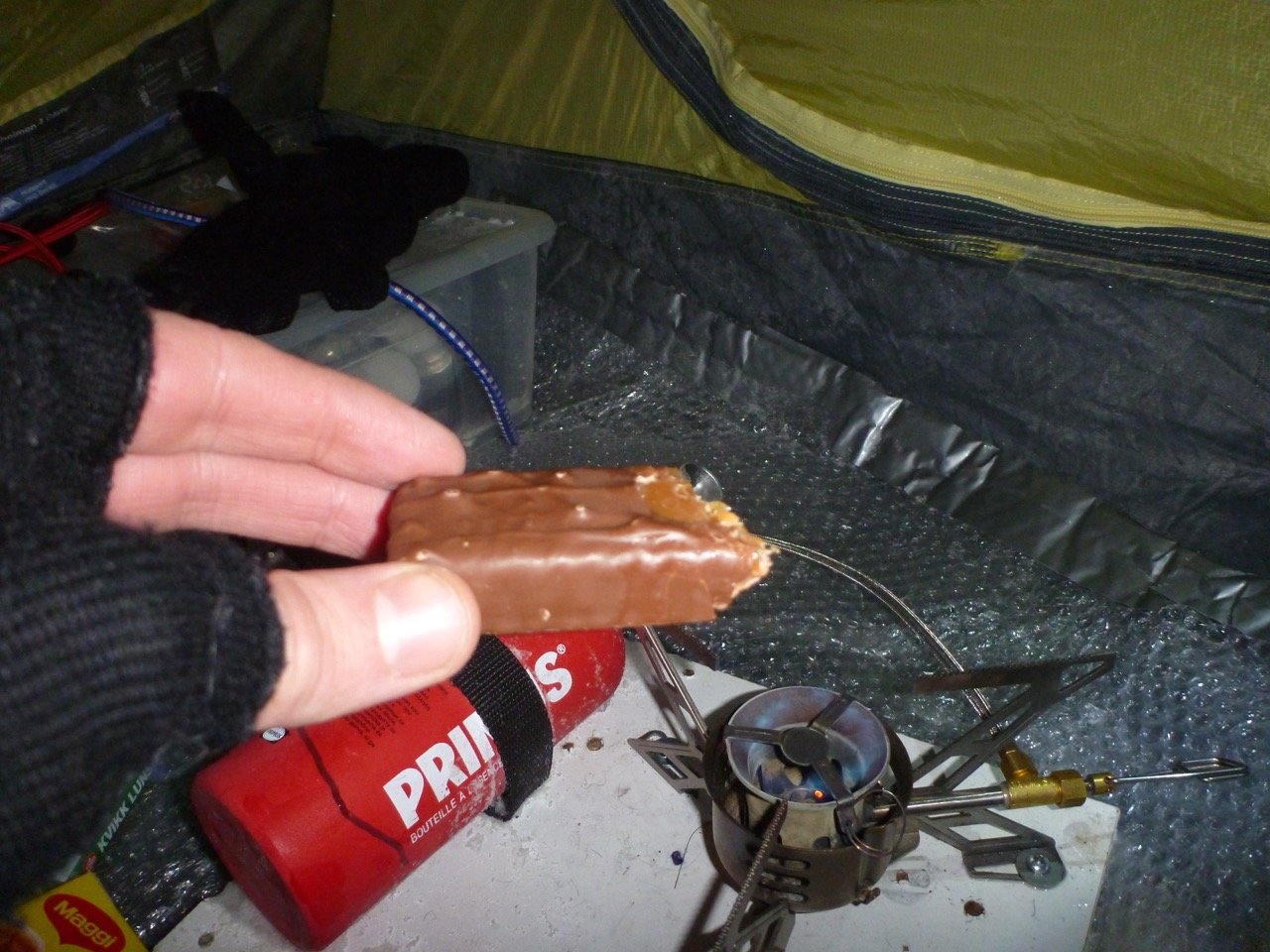 Takk, Ja det ble litt søl, men ikke så ille som fryktet. Dette var på dag tre, så tipper vi hadde brukt nesten to liter allerede. Kannen stod oppi en kasse så det begrenset sølet en del, og mesteparten hadde nok allrede rent ut når pulken lå opp ned. Proviant og baggen som skal inn i teltet var heldigvis pakket i den andre pulken så vi slapp sånn sett ganske heldig fra det. Har iallefall lært å skru igjen korken skikkelig nå