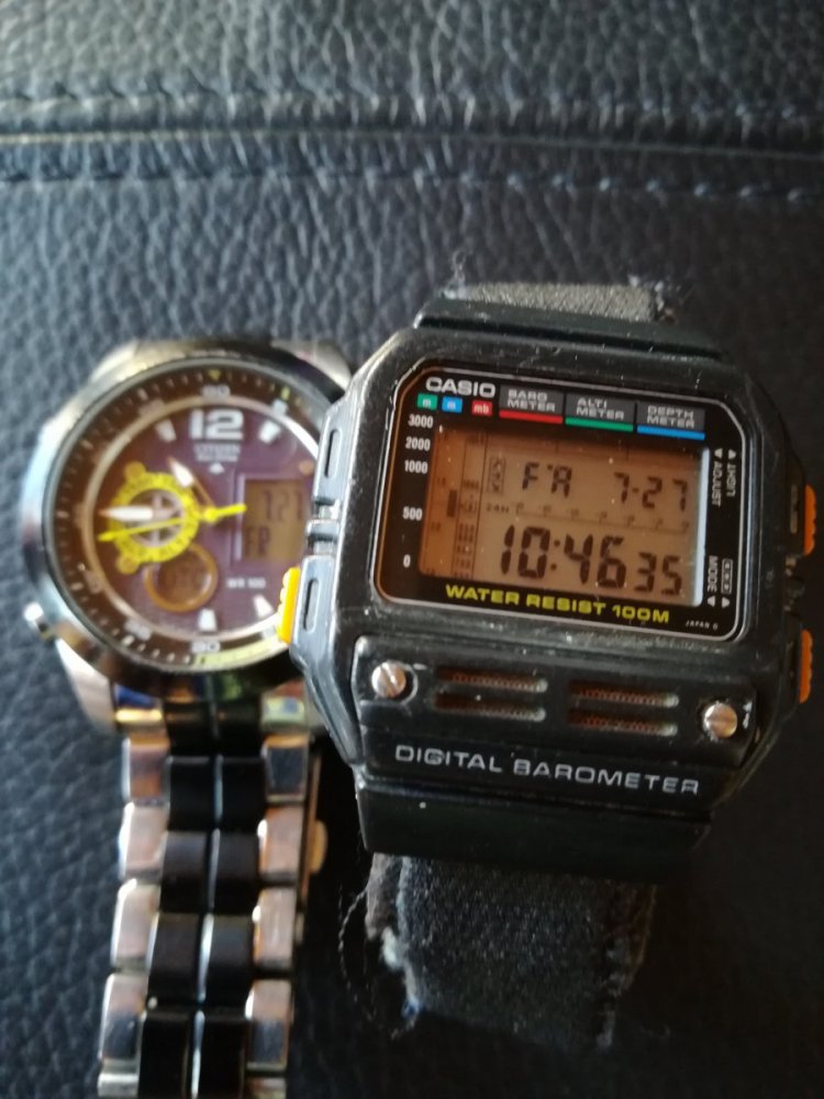 Ikke så fancy og oppdatert min Casio som kom ut i 1989 ,min er fra 90 ser ut til på preging bak så har sine år med bruk en av de første med barometer,dydbemåler og høydemåler. Vart kjøpt i sin tid for var ivrig på fridykking/dykking så kjekt med dybdemåler. Fungerer fremdeles og brukes på tur vært brukt en del ifra hverdag, fridykking til arbeid industri. Kun byttet reim, tapper og noen batteri vil si er ok kvalitet . Bruker gps/ kart og kompass og tlf utenom vært skeptikst på klokke som må lades ofte så går heller for ny tilsvarende klokke mindre som må lades holdes styr på. Skulle jeg kjøpt ny nå i dag så enten Citizen promaster dykkeklokke som desverre vanskelig få i virkelig en godbit bygd for å vare som denne : https://www.finn.no/bap/webstore/ad.html?finnkode=17264917 Mistet desvere en Citizen dykkeklokke for noen år siden den og tålte juling som annen Citizen klokke har. Rustfritt og titan ofte i de ikke plastikk og strømkrevende tek som dagens trend.. Billig klokke med altimeter barometer osv så ville jeg gått for Casio får protrek ned i 2700 ca https://www.protrek.eu/no/kolleksjon/ Gps så er vel garmin men ville heller brukt dedikert gps enklere betjene og større skjerm + en enhet mindre som tar strøm blir mye med klokke,gps ,tlf osv etterhvert men forskjellig hva liker og skal brukes til ..https://www.switchbacktravel.com/best-altimeter-abc-watches