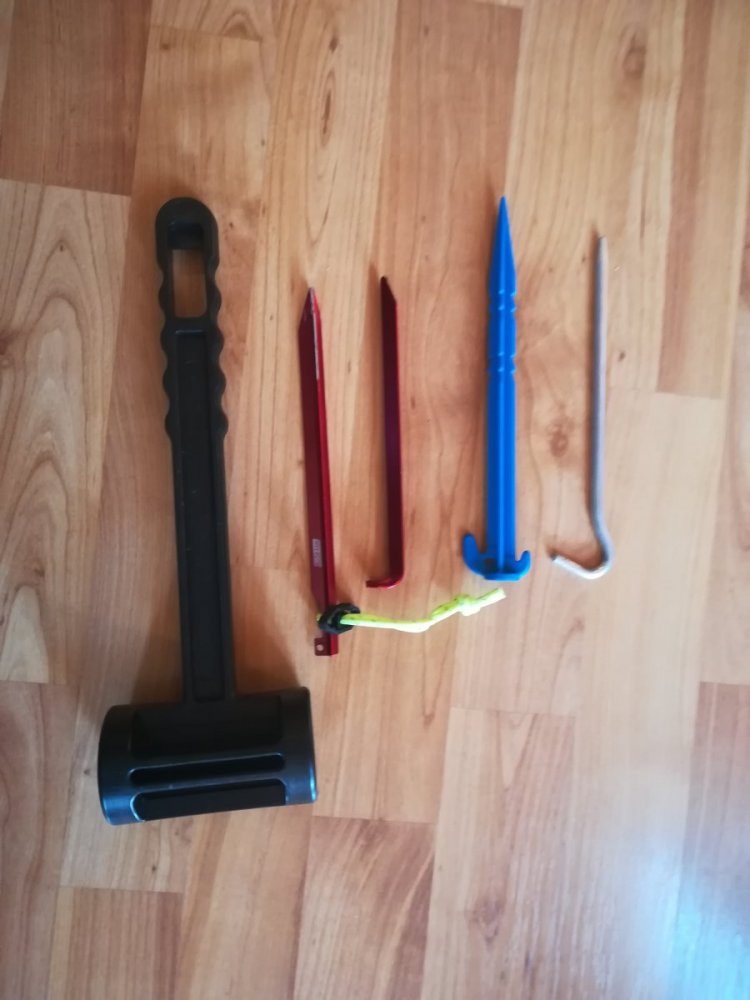 Hamre med stein osv mot tynn aluminium har aldri vært god kombinasjon blir som skyte spurv med hagle så plastklubbe eller lignende er kjekk ha kan klubbe fisk og pluggene fra helsport ser like fin ut 😁 Plastskaft på morakniv duger og taske på Leatherman har jeg brukt men plast kubben er blitt fast innhold fin hvis har fryst fast og trenger jule de løs. Tillegg bruker nå det de kaller forankringsstropp med spenne fra biltema til feste barduner etter surret de pakker telt selv om er oppheng på telt er de kjappere bruke, og til feste på enden plugger gjør de mer synlig og enklere lirke løs. Klubben er sikkert uaktuelt for gramjegere men syns er hendig med sine 185g Finner ikke de gule stroppene på biltema nå art.nr var 37-308 Klubbe med sandplugger : https://www.biltema.no/fritid/friluftsliv-og-camping/telt/plastslegge-med-10-teltplugger-2000036112