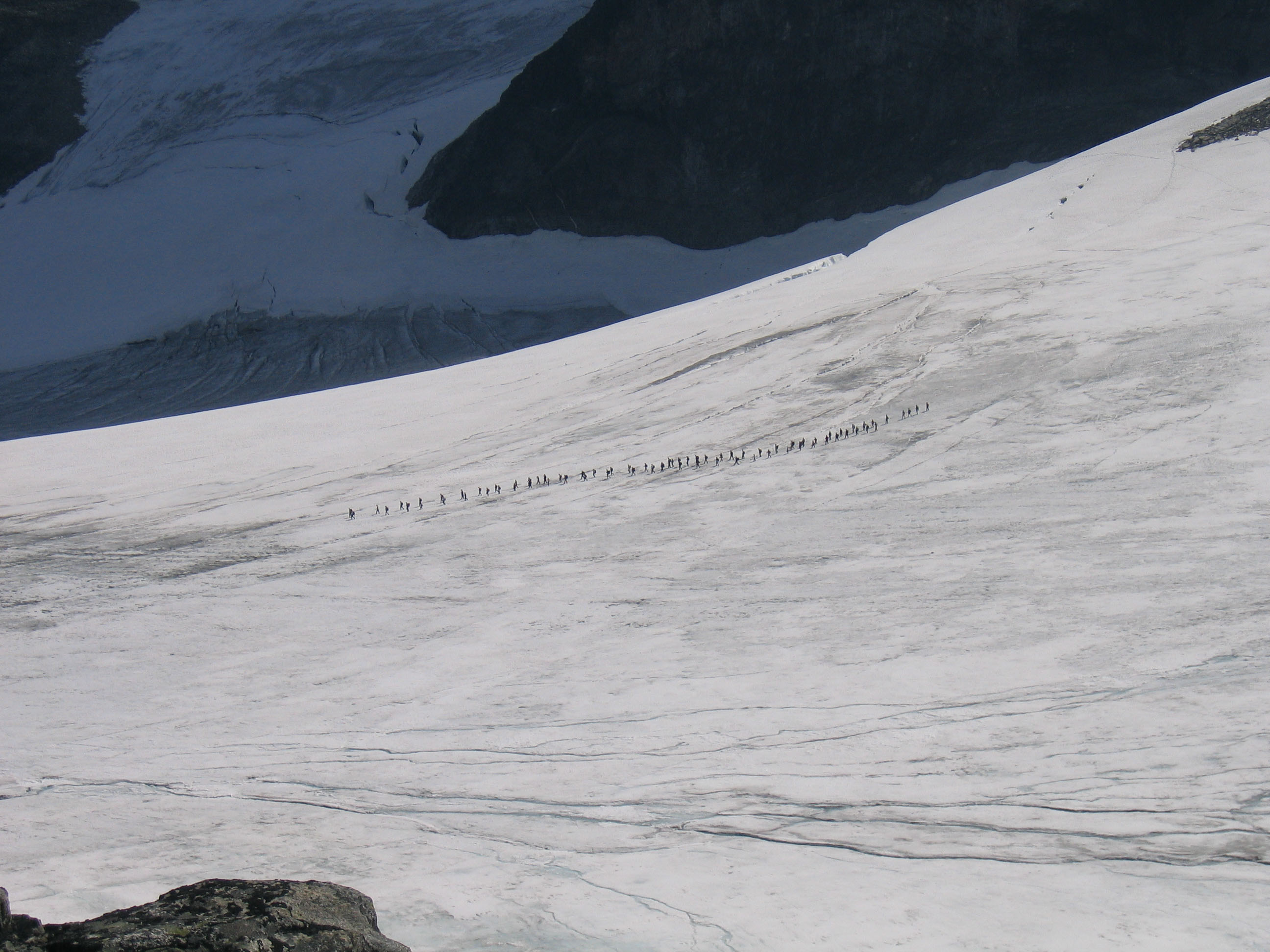Kan illustrere med et bilde av Styggebreen slutten av juli i fjor. Sprekkene var synlig, men ser ikke store ut . Mange gikk i tau, men det var også noen som gikk uten. -