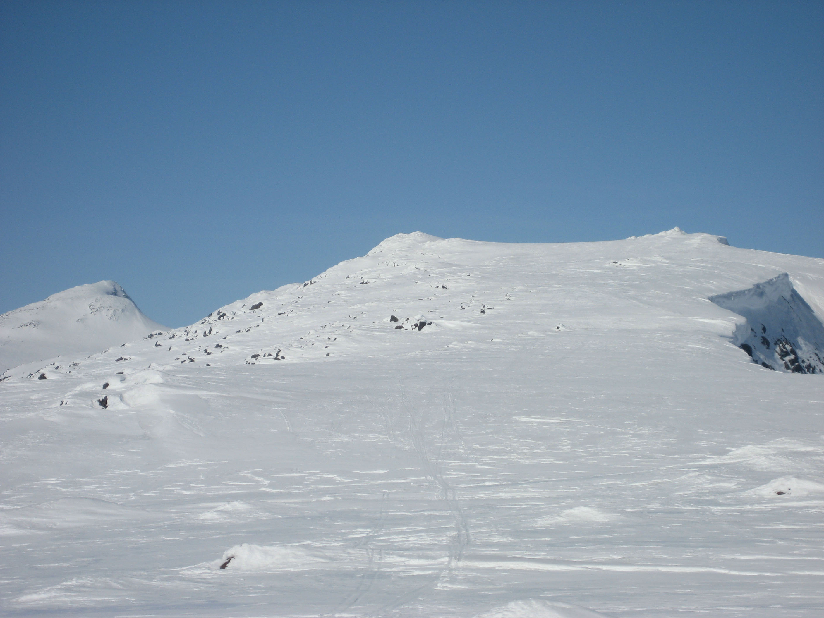 Beklager, men du har ikke truffet enda. Jeg har netopp gått over et platå som er ca 3 km langt og 100 meter bredt. Høyden på dette patået er like under 1800 meter. For å nå dagens mål må jeg gå ned igjen et stykke for å komme opptil toppen. Hadde jeg dreiet kameraet litt til venstre ville vi sett en av de mest karakteristiske toppene i Jotunheimen. Rutevalget mitt er mest brukt om vinteren. Om sommeren bruker nok de fleste en annen rute. Denne kommer opp til venstre for bildet.