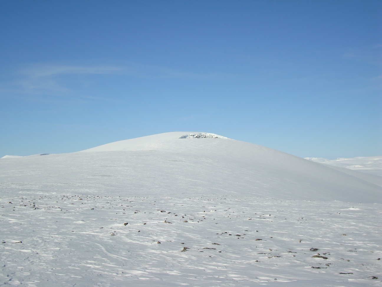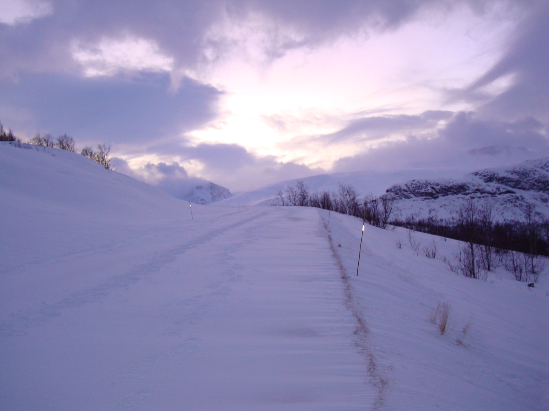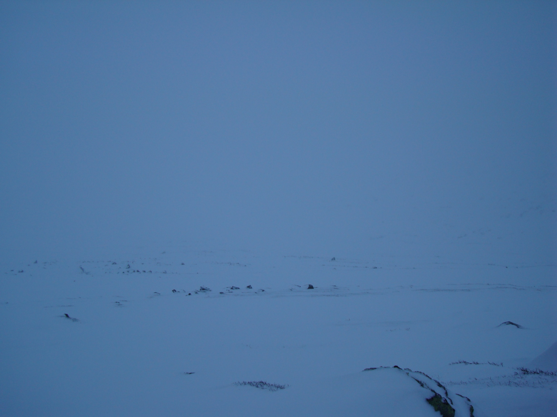 Etter et langt år med mange turer bak meg, så måtte jeg få en siste tur i fjellet over 2K. Julen begynte å nærme seg med stormskritt, og det føltes godt å komme seg ut igjen i fjellet etter å ha levert bacheloroppgave bare noen timer tidligere Årets nest mørkeste dag var dagen, og 20.desember virket som en god dag å gå på tur. Med et kort 12 timers varsel, der svarfristen var ca 6 timer, meldte Dalegudbrand seg frivillig til å bli med på tur. Eneste kravet til å bli med på tur var hodelykt, truger, motivasjon og oppmøte ved Maurvangen klokken 06.30. Jeg kjørte som vanlig ut fra Trondheim, og fikk ikke fylt kaffekoppen før Dombås, noe som skyldtes at det er ingen Statoil stasjoner mellom Trondheim og Dombås som er åpen mellom 24.00 og 06.00 på natten. Uansett, en god kopp kaffe smakte godt etter dårlig sikt og slitsomme kjøreforhold over Dovrefjell. Litt forsinket (06.35) er jeg ved bommen som stenger vegen over Valdresflya, og Dalegrudgrand et par minutter senere. Vi følger den nå nedsnødde riksvegen fire kilometer før vi bryter til høyre litt etter utkikkspunktet i Vargbakkan. Det er fortsatt mørkt og det snør litt da vi kommer innover det flate lendet før vi begynner bakken oppover Steinflye. Det lysner da vi begynner å gå oppover bakken, og for min del kjenner jeg utrolig godt i kroppen at jeg hadde sittet på ræva i tre uker og jobbet med bacheloroppgaven. (Ingen skikkelig trening på over en måned og mye sukker og kaffe er absolutt ikke oppskriften på å bli i god form ). Skyene letter på sløret idet vi passerer ca 1500 moh, og det hjelper på motivasjonen. I nord ligger skyene under oss, og ingenting kan være vakrere enn dette. Vi går på, men det føltes lang denne dagen, og kroppen fungerte heller ikke noe spesielt godt. Vi ankommer toppen klokken 13.00, og har brukt litt for lang tid til toppen for å kunne gå videre mot Eggen. Vinden har økt betraktelig når vi kommer på ryggen, og det er kuling i kastene. Med tanke på konsumert tid, lengden igjen av turen, og at det blir så tidlig mørkt, finner vi det mest fornuftig å ta turen tilbake fra Kvassryggen. Jeg får derfor en god unnskylding for å komme tilbake. Uansett, turen var vellykket den. Returen går greit, men tar nesten tre timer å gå tilbake til bilen ved Maurvangen. Det er trått føre, da med tanke på at det veksler mellom pudder, pakket snø, gjennomslagsskare og skikkelig skare, minst hver tiende meter. Blåtimen viser seg da vi sitter og tar en god pause ca halvannen time fra bilen. Fjellene i øst er hvite og rene, mens bakgrunnen er blå, med noen tynne slørskyer. Vakrere enn dette kan det nesten ikke bli, og denne gleden blir brutt da det kommer noen vindkast fra vest. Årets siste tur vell gjennomført - ingen skader og med litt bedre samvittghet til å spise med i romjula -