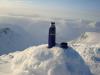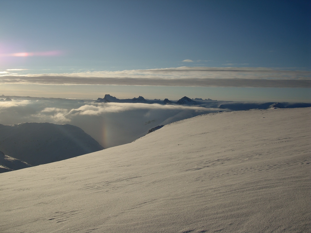 Bomtur eller ei, utrolig fornøyd med turen var jeg likevell Etter å ha postet en post som heter "turfølge søkes", så kom det svar fra et par FF - medlemmer. RM ytrer ønske om å bli med, og jeg plukker han opp klokken 01.38 i Trondheim før vi kjører sørover. Ankommer Geitsetre (faktisk med bil) ca halv syv, og kaffe, skiver og frokostblanding fortæres før trådposter drikker enda en kopp kaffe før motivasjonen stiger til et akseptabelt nivå. RM stikker ut og pakker sekk og div mens undertegnende fortsatt sitter og varmer seg på kaffen og varmeapparatet i bilen. Etter et relativt kjapt klesbytte er begge klar, og vi begynner å gå på venstresiden av Nørdre Illåe. Det er tungt å gå, og ikke minst for RM som har satset på Randonee utstyr og tunge plastikkstøvler. Jeg noe skeptisk til turutstyret siden jeg ikke er noe dyktig på ski, og for denne anledning ble det 1 - 0 til trugene (hm, har Mayhassen brukt dette mot meg før montro?). Etter å ha gått noen høydemeter får jeg beskjed om å gasse på, slik at jeg får sjansen til å rekke toppen i løpet av dagen. RM vil bekymre seg med nedstigningen, mens jeg går videre mot Vestre Skarstind. Utsikten er fantastisk og bildene under forteller hvorfor det kanskje ikke ble en så stor bomtur i dag allikevell. Jeg vil allikevell ikke utelate mitt mislykkede bestigningsforsøk på Skarstind. Jeg står nede i skaret mellom Vestre Skarstind og den første hammeren som står som en vegg mot Skarstinden. Tankene svirrer rundt å prøve å gå hammeren, men løs is og snø setter rask en stopper for det. Videre tenker jeg på det Morten sa til meg i går om å traversere et par snørenner og slik omgår de tre hammerene. Mens jeg står midt i den første snørennen med nysnø til midt på lårene og en hard snøflate under, mens jeg samtidig kan skimte laaangt der nede hvor jeg vil ende opp om snøen løsner, kutter jeg ut ideen med å traversere snørennene for omgåelse av hammerene. Jeg går tilbake til skaret og gjør et par telefonsamtaler, og jeg blir ikke noe klokere. Hammeren vil jeg ikke gå direkte på pga løs is og snø, og alle de andre forslagene innebærer kryssing av meget utsatte snørenner med mye nysnø og slik jeg ser det, ustabile snømasser. Med tungt mot tusler jeg tilbake til Vestre Skarstind og tar frem termosen med kaffe og børster snø av en stein og leter frem kameraet. Jeg kjenner at kulden river i nesen, men allikevell er utsikten helt fantastisk. Skydekket som ligger under meg, hurrungane som titter frem blant alle de andre 2K toppene i horisonten. Kaffen smaker godt og i et lite øyeblikk kjenner jeg at jeg får gåsehud og glemmer bomturen til Skarstind. Går tilbake til bilen og plukker opp RM som har vært litt utålmodig, og nesten kommet til RV 55 i sin søken etter å holde varmen. Noen mil senere etter en lang dag med ca 70 mil i bil og 7 timer på tur er vi tilbake i Tr Heim. -