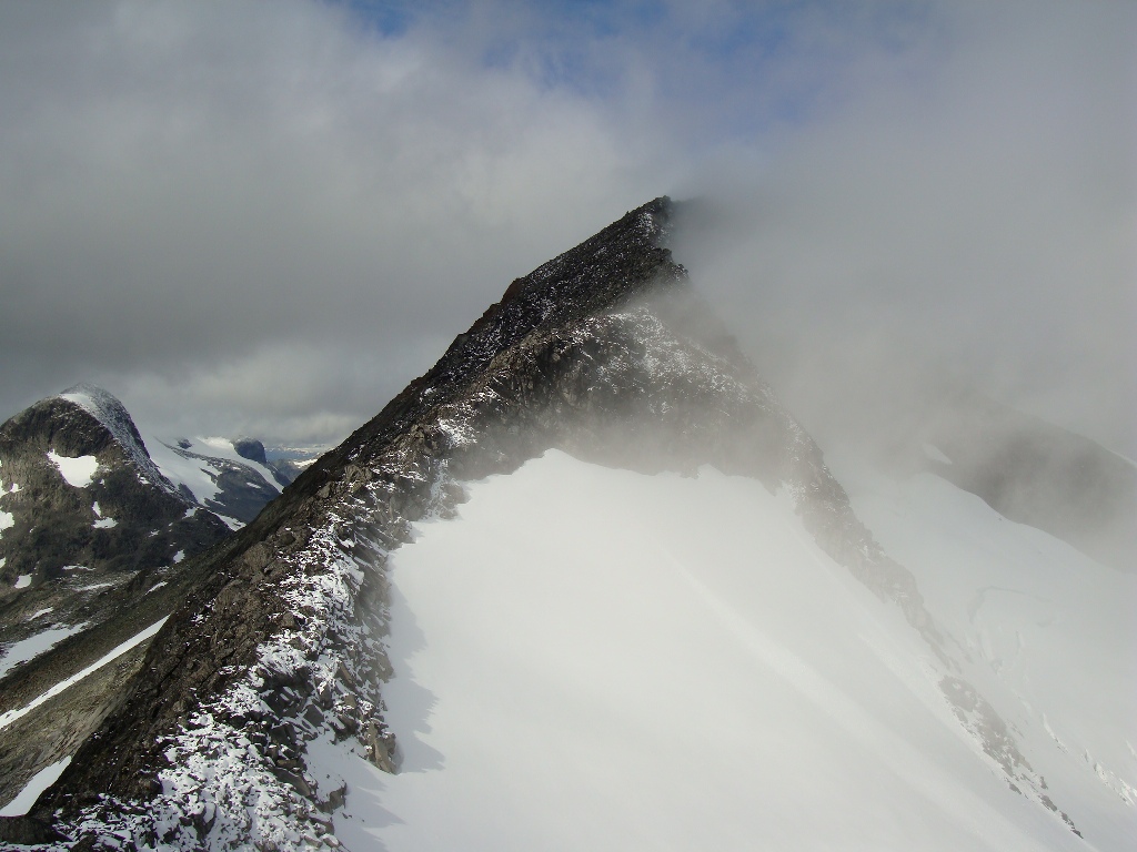 Graden på klyvind: Det mest utfordrene kan være å se den letteste vegen, men det er viktig å ikke svartmåle alt selv om det ser vanskelig ut når du møter hammeren. Opp til store finner du omgåelser i siden, men det er bare å lete litt. Det er et lite punkt som kan være litt lufttig, men om du har noen tidligere traversen bak deg (som f,eks urdadalsryggen) så vil du klare å gå denne ryggen tror jeg. Men det er viktig å snu i fjellet om du møter en utfordring du føler er for stor for ditt eget kompetansenivå, og jeg har ikke enda passert et punkt usikret hvor jeg ikke har følt meg trygg. Hvorfor vi snudde på Hettpiggen: Det var utrolig kaldt på toppen, og det fristet veldig lite å stå og fryse og sikre på standplass i skaret mellom Hettpiggen og Vesttoppen. Vi anntok også at vi ville være mindre konsentrert om den som stod og sikret frøys, derfor gikk vi andre vegen i rundt. Det ville selvsagt gått mye raskere å klatret opp, men gjort er gjort..