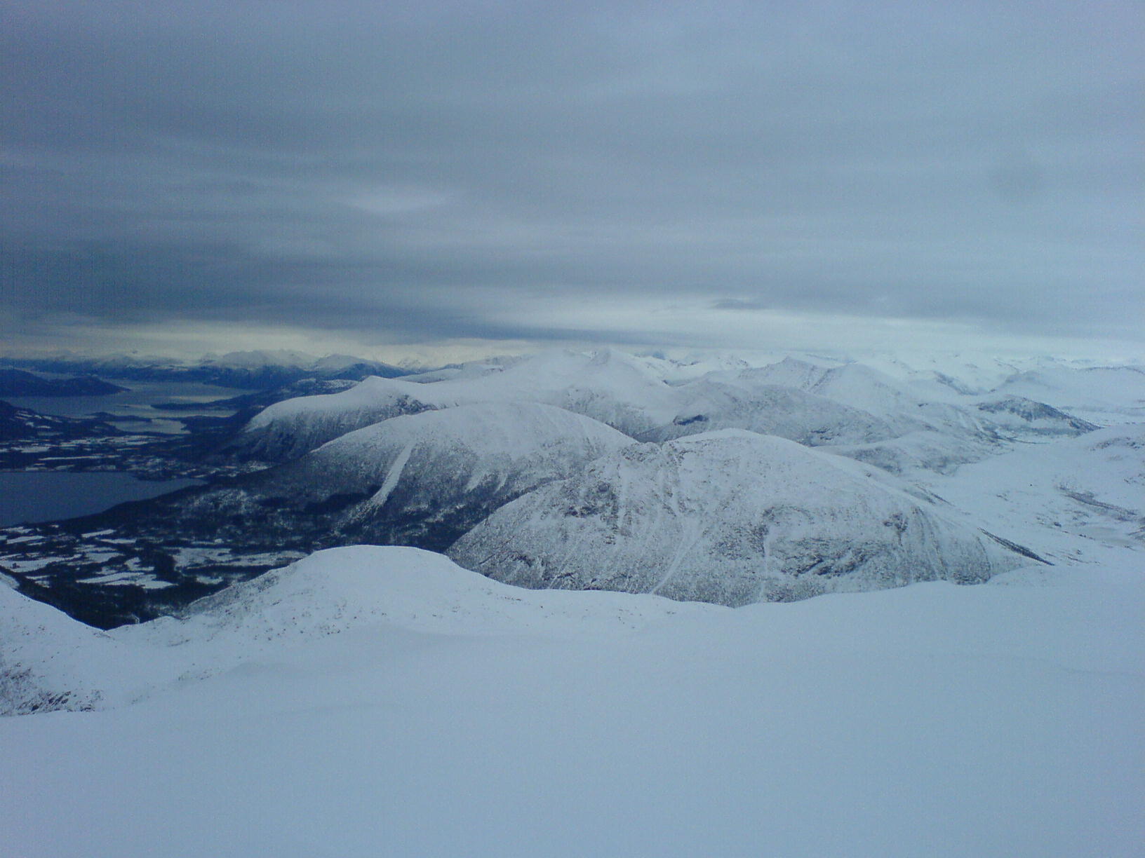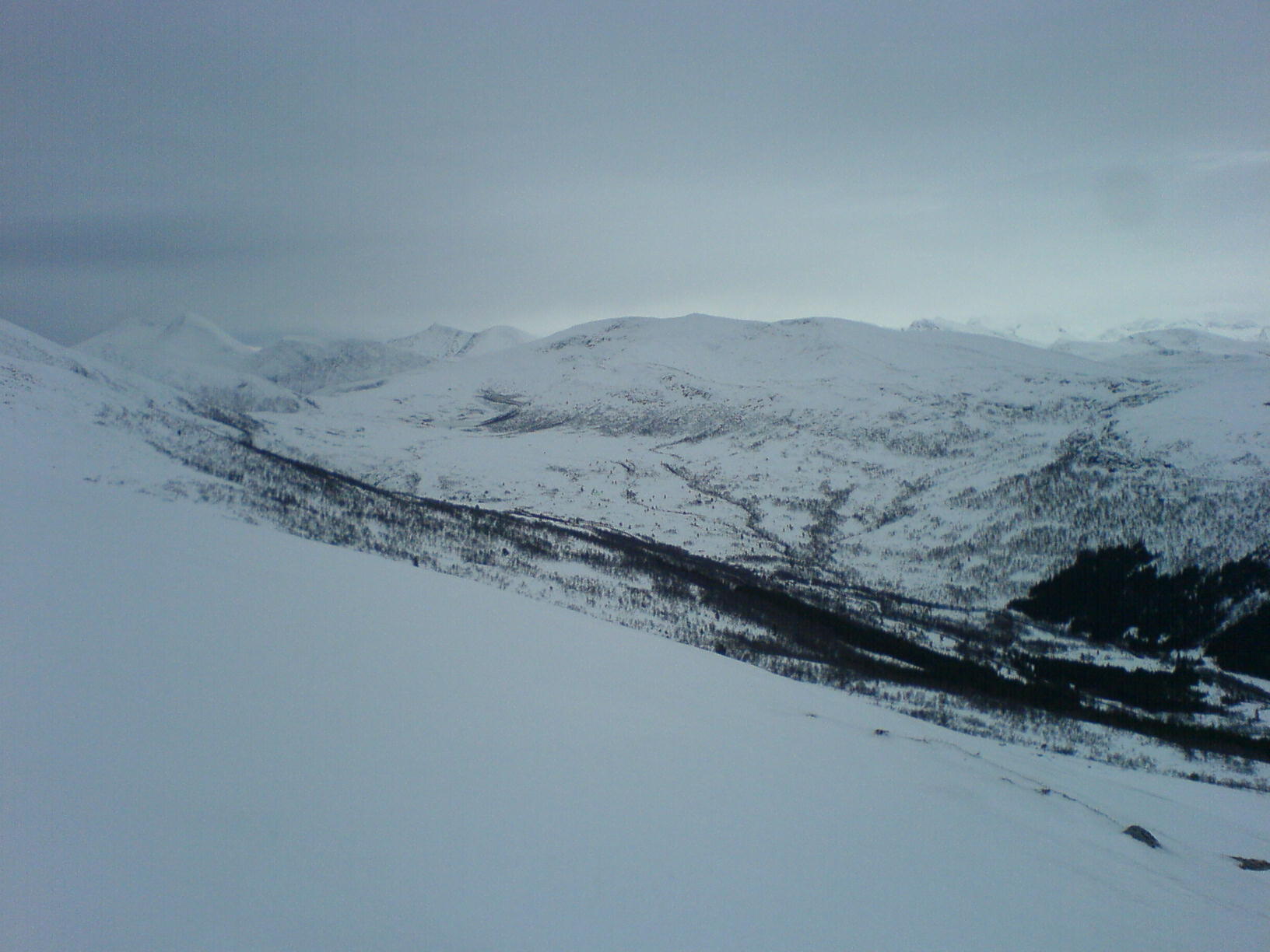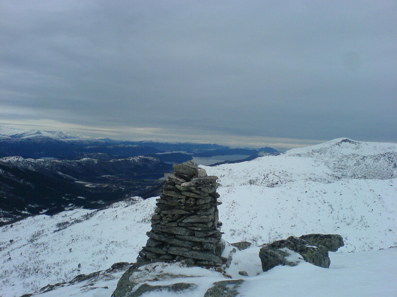 Etter en halveis mislykket trugetur på Sognefjellet, så hadde jeg noe mer tro på de mer enn dobbelt så dyre trugene jeg hadde fått tak i til nå.. Parkerte bilen ca 500 meter ovenfor Krogsætra i Haram-kommune ved en relativt dårlig brøyta parkeringsplass rett ved en fe-rist ... Etter en liten skifteseanse var jeg på veg oppover med trugene på bena.. Snøen var noe råtten i begynnelsen, men så fort jeg kom til ryggen ved 580 moh ble den en del tørrere, og letter å gå på.. Utsikten fra denne toppen skuffer meg aldri, hvor at det varierer fra havet i vest med Midsund og Sandøya, hvor at vi har Molde og Normøre i Nord, Ålesund i sør, og en del Sunnmørsfjell i Øst... Ikke mange som hadde besøkt denne toppen, i alle fall ikke registrert seg den siste måneden... Var en person som hadde skrevet seg inn den 4. nov, noe som tyder på at fjellet får ligge i fred i noen måneder hvert år... Dårlig utstyrt med kamera var jeg, slik at de eneste bildene som ble tatt, var av den 2.0 Megapixel telefonen jeg hadde i lomma.. Trugene holdt de 800 høydemetrene i dag kontra den mere mislykkede turen på Sognefjellet.. Alexander