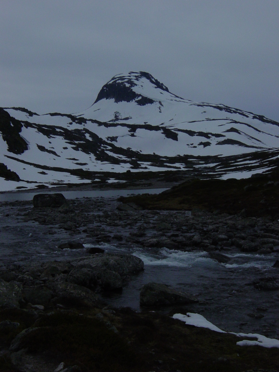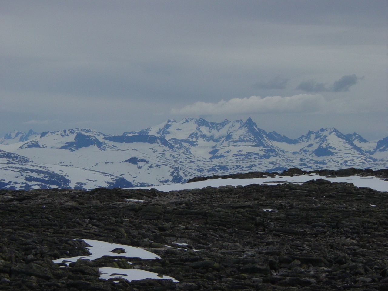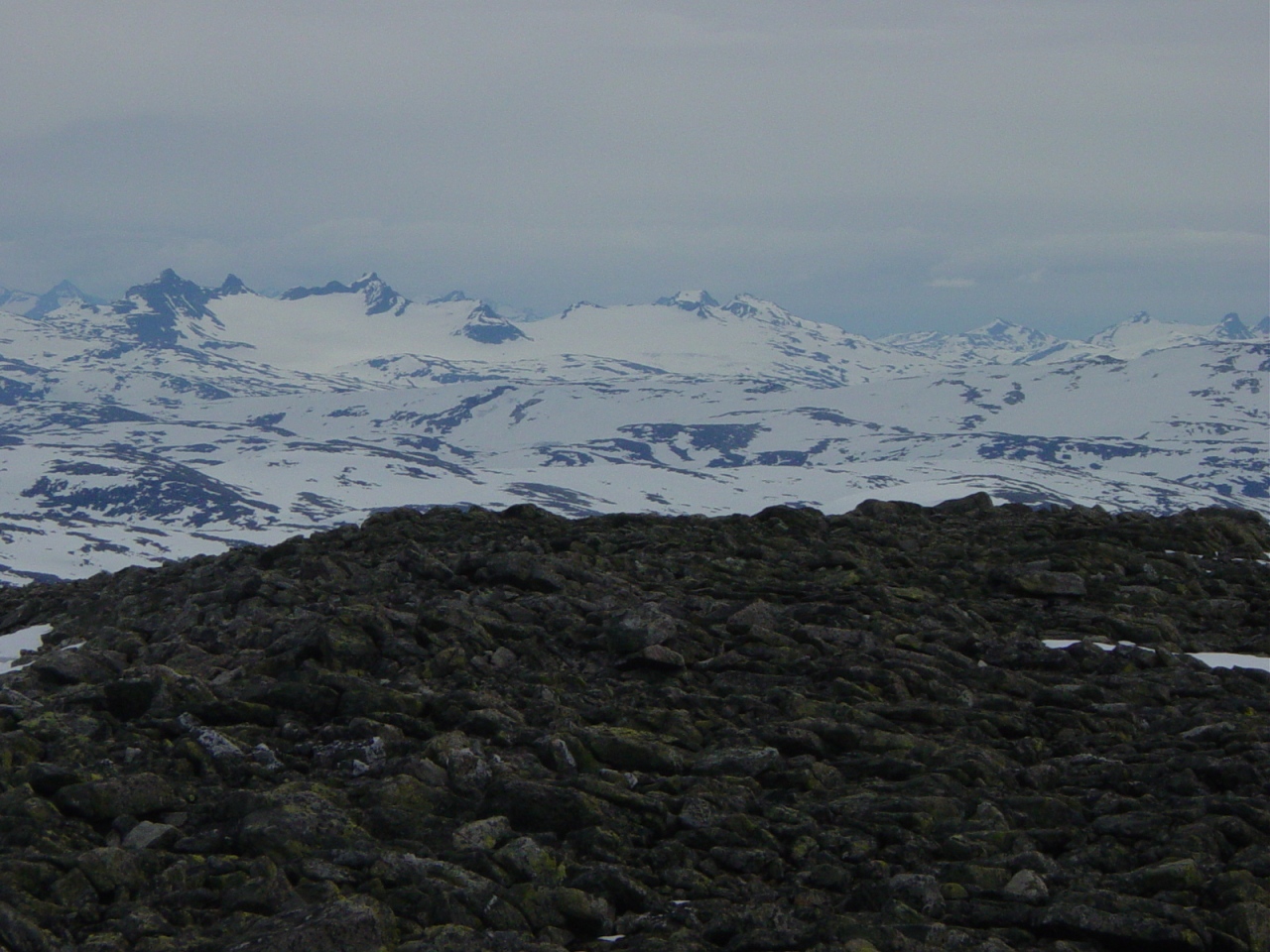 En ukes tur i Jotunheimen med dama (uke 29). Etter å ha planlagt denne turen i mai, så var jeg spendt på om det var for ambisiøst å satse på så mange 2K topper som jeg gjorde denne uka. Hadde lagt opp til et roligere løp for Sunniva, og ett litt mer kamikaze prega opplegg for meg selv. Før vi dro sørover til Jotunheimen på lørdag, startet jeg med et fjell ikke langt fra Gjevilvasshytta som heter Okla (1543 moh) Det viste seg at planen som jeg hadde lagt opp til var veldig realistisk og gjennomførbar, hvor at uken forløp seg som dette. Legger ved GPS’ tracken og bilder fra hver dag. Mandag 16. juli 07: Overnattet i telt ved Gjendesheim fra søndag til mandag, våknet opp til et kjempefint vær, med gode muligheter for å få en fin dag i fjellene. Det første som var planlagt var å gå Besseggen etterfulgt av Bessøe (2258 moh). Mine forventninger til Besseggen var relativt lunken, hvor jeg ikke hadde noen forhåpninger om å bli noe stressa av å gå den. De synlige sporene i terrenget var verre enn jeg hadde forestilt meg, og hadde en følelse av å delta på en folkevandring i det vi gikk over Veslefjellet i retning Bessøe. Bessøe var i rake motsetning ganske urørt fra den store turismen som preget Besseggen. Toppen bydde på en kjempefin utsikt, med store stup i retning vestover mot Russvatnet og Surtningssue. Tirsdag 17. juli 07: Etter at jeg våknet av regnet som trommet på teltduken klokken 02.00 natt til tirsdag ble jeg litt småskeptisk til fjelltur dagen etterpå. Spiste noen brødskiver med morrpølse til frokost og kokte vann (ved Memurubu). Planen for denne dagen var Surtningssue (2368 moh), Søre Blåbreahøe (2196 moh), Sør for Nørdre Blåbreahøe (2154 moh) og Nørdre Blåbreahøe (2165 moh). Det regnet under hele frokosten, hvor at jeg ikke kan huske opphold før utpå ettermiddagen klokken 17.00. Sunniva fulgte med hele veien over Raudhamran og til foten av Surtningssue, men etter å ha blitt våt som ei katte i løpet av tre timer ville hun ikke bli med videre opp i skyene som preget høyden over 2000 moh. Hun snudde og gikk retrett mot Memurubu mens jeg gikk videre. Etter å ha passert 2000 moh hadde jeg mellom 30 og 50 meter sikt i tåka, og fikk dessverre ikke nyte utsikten som skulle være på Surtningssue (rykter skal visst ha seg til at det er en av Jotunheimens fineste utsikt fra denne toppen). Møtte en svensk brefører som hadde lunsj 200 meter før toppen, men som ikke var interessert i å bli med videre på runden min. Gikk via skaret mellom Sør for Nørdre Blåbreahøe (2154 moh) og Søre Blåbrahøe (2196) og sørover og i retning Raudhamran. Dette skaret var prega av veldig mye løs og glatt stein, noe som jeg ikke hadde villet gjentatt ved en senere anledning. Kom tilbake til Memurubu som ei dyvåt katte klokken 19.00 etter å ha gått i 9 timer og 30 minutter. Onsdag 18. juli 07: En pausedag som innebefattet grilling på Sålell Sæter noen kilometer vest for Kvitingskjølene. En av de mest idylliske plassene vi hadde sett på lenge, i motsetning til de overbefolkede plassene ved Gjendesheim. Torsdag 19. juli 07: Kjempebra vær denne dagen, men vind fra nord gjorde at det var litt småkjølig denne dagen. Gikk via veslekjølen mot Nørdre Kvitingskjølen (2025 moh) og til hovedtoppen som var Store Kvitingskjølen (2064 moh), hvor vi kunne innta en av dry tech sine varme lunsjer og en kopp pulverkaffe. Det var en nordlig trekk, hvor at noen skyer med underkjølt yr hadde ført til rim på fjellet over 1950 moh. Varden var dekt med rim og is hvor at vi hadde på både ullundertøy, varme votter og lue i løpet av den 20 minutter lange pausen på toppen. Fortsatte mot Vestre Kvitingskjølen (2060 moh) og gikk ned til bilen etterpå. Brukte ikke mange timene på turen, hvor Sunniva sa i etterkant ”dette føltes jo så lett at det var mer som en treningstur istedenfor en fjelltur”. Fredag 20. juli 07: Regnet begynte å tromme på teltet ved Glitterheim denne natten, og hvor jeg ikke ble så altfor overbevist om at det var en fin dag for tur før jeg så ut av teltet klokken 08.00 denne dagen. Det var heldigvis opphold da vi stod opp, og værmeldingen spådde pent vær utover dagen. Glittertind var dekket av skyer, hvor at det av og til var nysnø synlig under skyene. Dette var og denne kaldeste natten så langt denne uken. Det fysiske overskuddet var heldigvis stort denne dagen, hvor at det gikk kjapt til toppen av Glittertind (2462 moh). Nysnøen lå over 2100 moh denne dagen, hvor at det på toppen lå mellom 15 og 20 cm nysnø. Med solbrillene og solkremmen liggende igjen ved nasjonalparkgrensa gjorde de liten nytte for seg da vi kom til den skarpe solen i nysnøen. Stopper bare kort opp på toppen og nytte utsikten med en liten kopp kaffe. Gikk kjapt videre sørover mot Ryggjehøe (2142 moh). Besteg Ryggjehøe og var tilbake på Glitterheim i løpet av til sammen 5 timer og 42 minutter. Etter å ikke ha besteget Nautgardsoksle (2089 moh) tidligere samme året, hadde jeg også planlagt å bestige denne samme dagen. Lett å bestige dette fjellet, hvor jeg hentet ned tre par med ski og feller som lå ved 2000 moh, på forespørsel fra betjeningen på Glitterheim. Lørdag 21. juli 07: Første dagen som avvik fra den originale planen. Dagen ble mye lengre enn planlagt hvor at vi gikk først til Grotbreahesten (2018 moh), deretter Svartholshøe (2067 moh), Trollstein Rundhøe (2170 moh), Dronningje (2189 moh) og Trollsteineggje (2300 moh). Det var en lang dag som tok 10 timer og 40 min og var på 32 kilometer. Grotbreahesten var lett å bestige, eneste som var kjedelig var den litt løse morenestenen ved foten av den østlige delen av fjellet. Sunniva ble sittende igjen mellom Svartholshøe og Trollstein Rundhøe, hvor at jeg gikk utover til Trollsteineggje for å bestige den. Var litt ekkelt å bestige den litt bratte eggen ca 100 meter før toppen av Trollsteineggje. Var den mest utfordrende toppen denne uka, hvor at pulsen økte b
