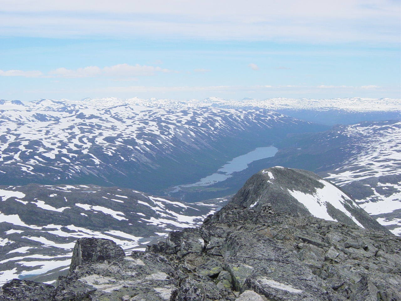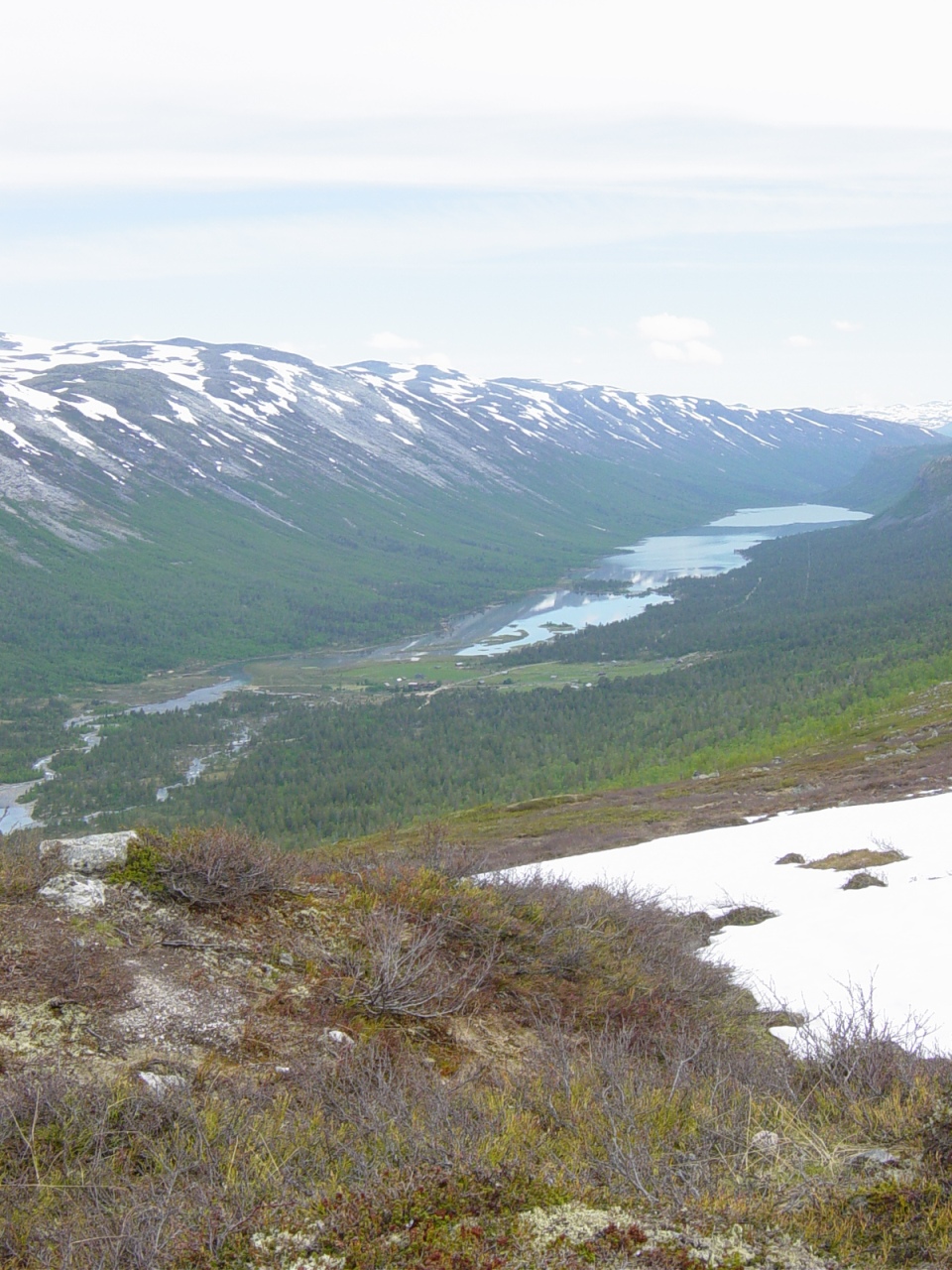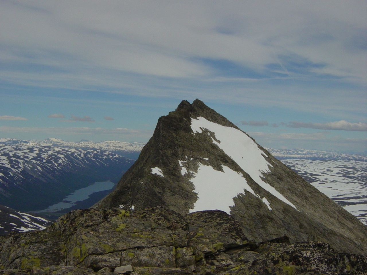 Sted: Jotunheimen Jeg og min bror Christoffer hadde tidligere i år planlagt å gå Snøhettatraversen, men grunnet manglende praktisk trening med klatreutstyr så droppet vi traversen, og kjørte i retning Jotunheimen. Hadde to dager til rådighet, men regnet som trommet på teltduken torsdagsnatta ved Krossbu, varslet om at det ikke ble noen fjelltur på fredagen. Uansett, vi kjørte til Jotunheimen Fjellstue onsdag 20. juni og slo opp teltet der. Våknet tidlig (rundt 08.00), spiste en enkelt frokost, pakket sammen teltet og hev det i bilen, og tok fatt i ryggsekkene og gikk sørover mot toppen. Været var knall, og det var mulighet til å hive skjorta i sekken og få noe farge på brystkassa. Loftet (2170 moh): Et veldig teknisk enkelt fjell, men det føltes noe langdrygt de siste 20 minuttene mot toppen da vi begynte å lure på om det var noen ende på bakken. Toppvarden stod langt i fra kanten, men en super utsikt mot fjellene rundt på alle kanter veide opp for den litt flate toppen. På toppen ser vi at Fanaråken med Hurrungane i bakgrunnen er dekket av skyer, noe som tyder på at vi er midt i et værskille. Skjorta må på igjen, og jakke og lue gjør det mer behagelig på toppen. Veslefjelltinden (2157 moh): En fin og bred egg mellom Loftet og Veslefjelltinden, men med noe lett klyving de siste metrene før toppen. Toppen har en fin utsikt, og skiller seg litt ut fra Loftet at du ikke føler du står midt på et stort platå, men nemlig en topp. Når vi gikk de siste metrene av eggen gikk det ett snøras ikke langt fra hvor vi gikk, ganske imponerende, og det gir meg et fint bilde av kreftene som blir sluppet løs. Hadde ikke sett et snøras "live" før, og da bare på tv. Litt brattere å gå ned fra toppen, hvor jeg nesten faller et par ganger grunnet våt mose og løse stener. Noen andre opplysninger: Været var relativt greit, men en front som kom inn fra sørøst ga noen dråper regn på toppen av Veslefjelltinden, og gjorde at turene på fredag ble avlyst grunnet lavt skydekke (ca ned til teltet), og nedbør i form av regn. Tur/retur Jotunheimen fjellstue var i følge GPS'en 14,8 kilometer. Mvh Alexander og Christoffer