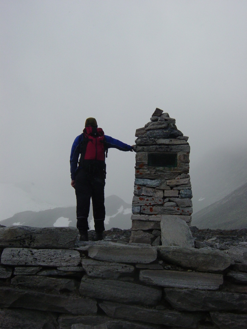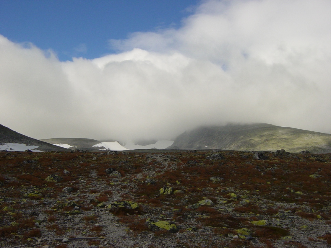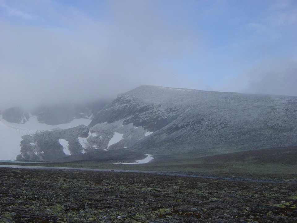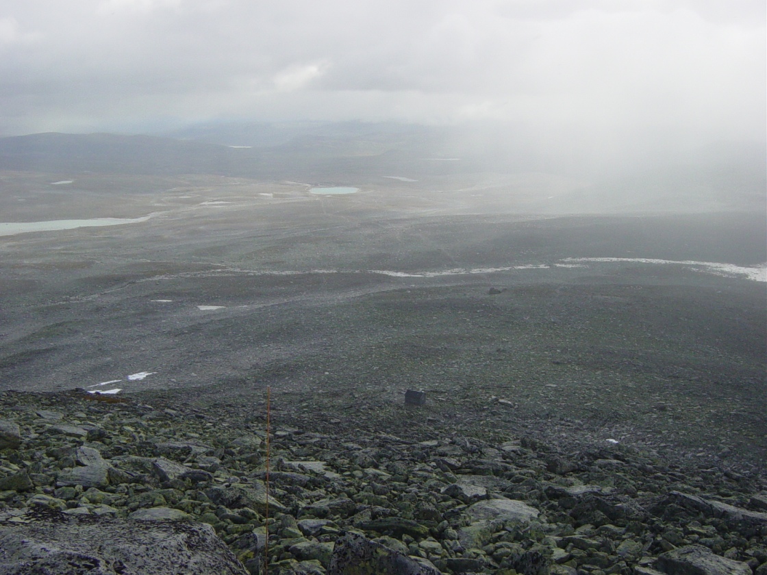 Sted: Rondane Pappa og jeg hadde planlagt å gå den store runden over alle de 13 fjelltoppene over 2000 meter. Det er cirka 5000 høydemeter og 5 mil til sammen. Værutsiktene for Rondane var noe usikkert, og i det vi kjørte hjemmefra klokken 22.00 lørdagskvelden, regnet det hele vegen til vi kom til Dombås. Var da litt skeptisk på om det var mulig å gå grunnet været, men det viste seg å være veldig tørt nede ved Otta. I ryggsekken hadde jeg votter, lue, ullundertøy, to og en halv liter vann, energidrikkpulver, 12 brødskiver med honning og skinke, rosiner og energi gel. Kom frem til Rondvassbu klokken 02.45 den natten hvor vi startet å gå umiddelbart etter at vi satte fra oss syklene. Veslesmeden (2015 moh): Lett å gå til denne toppen, hvor at det var en slak og fin stigning hele vegen til toppen. Det var dessverre tåke på toppen, hvor at utsikten var redusert betraktelig grunnet dette. På veg mot Storsmeden (2016 moh), ble tåken veldig fuktig, med dårlig sikt, som gjorde at vi snudde noen hundre meter før Storsmeden. Siden ingen av oss hadde gått denne strekningen før følte vi det tryggest å heller komme tilbake ved en senere anledning. Dette fordi at det var 20 meter sikt og vått og sleipt fjell gjorde at vi ikke ville fortsette videre. Snudde og gikk tilbake til Rondvassbu. Brukte 5 og en halv time t/r Rondvassbu. Vinjeronden (2044 moh): Fin stigning hele vegen, hvor at det ble litt bratt mot toppen. Ikke noe spesielt å si om denne toppen. Tåke på denne toppen og. Vinjeronden Nord (2030 moh): Mye det samme som Vinjeronden, rundt 100 meter fra hovedtoppen som er Vinjeronden. Rondslottet (2178 moh): Var i tåka på denne toppen og, hvor at utsikten var redusert betraktelig grunnet tåken. Tåka lot sløret forsvinne et lite øyeblikk hvor at det var mulig å se Vinjeronden og de andre fjellene i Rondane. Fikk tatt noen få bilder noen hundre meter fra toppen av Rondslottet. Noen andre opplysninger: Været denne dagen var dårlig fra begynnelsen av med tåke og regn, men blå himmel dukket frem etter klokken 14.00. Den totale lengden på denne turen var 32 kilometer, noe som tok 10 timer og 39 minutter å gjennomføre.