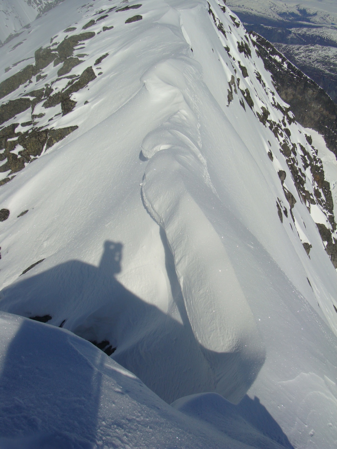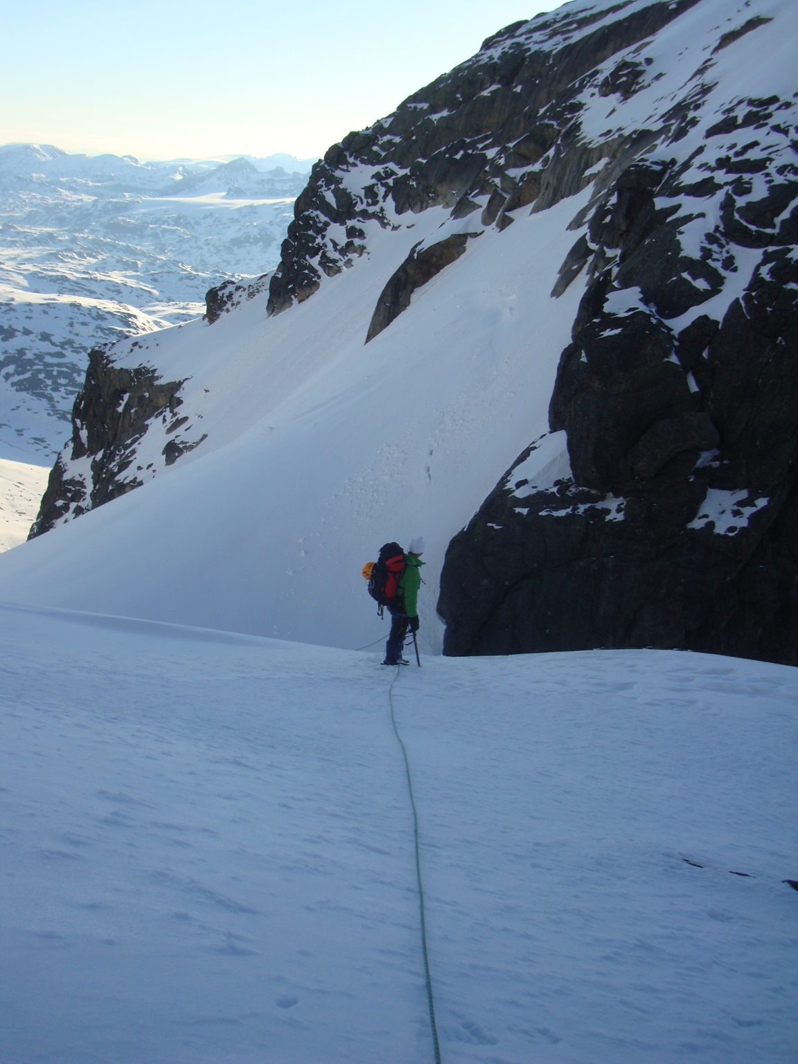 Heisann.. Det var noen fotspor som kom inn fra nordsiden til det nevnte skaret. Var der for to dager siden. Vet ikke hvordan det vil se ut om en mnd der, men det så ikke ut som om det hadde vært noe vanskelig å komme seg opp til skaret fra nordsiden. Selv gikk jeg ikke på breen, men ned i sørflanken.