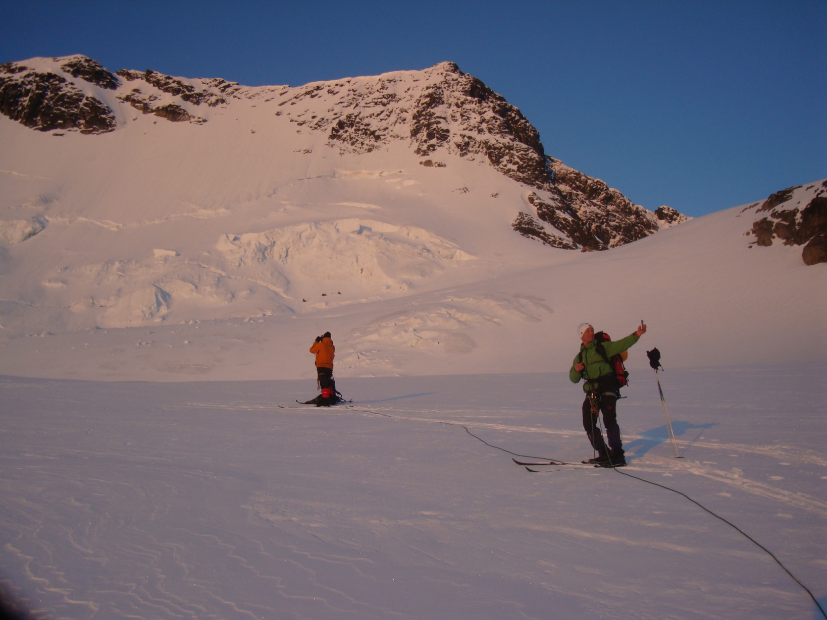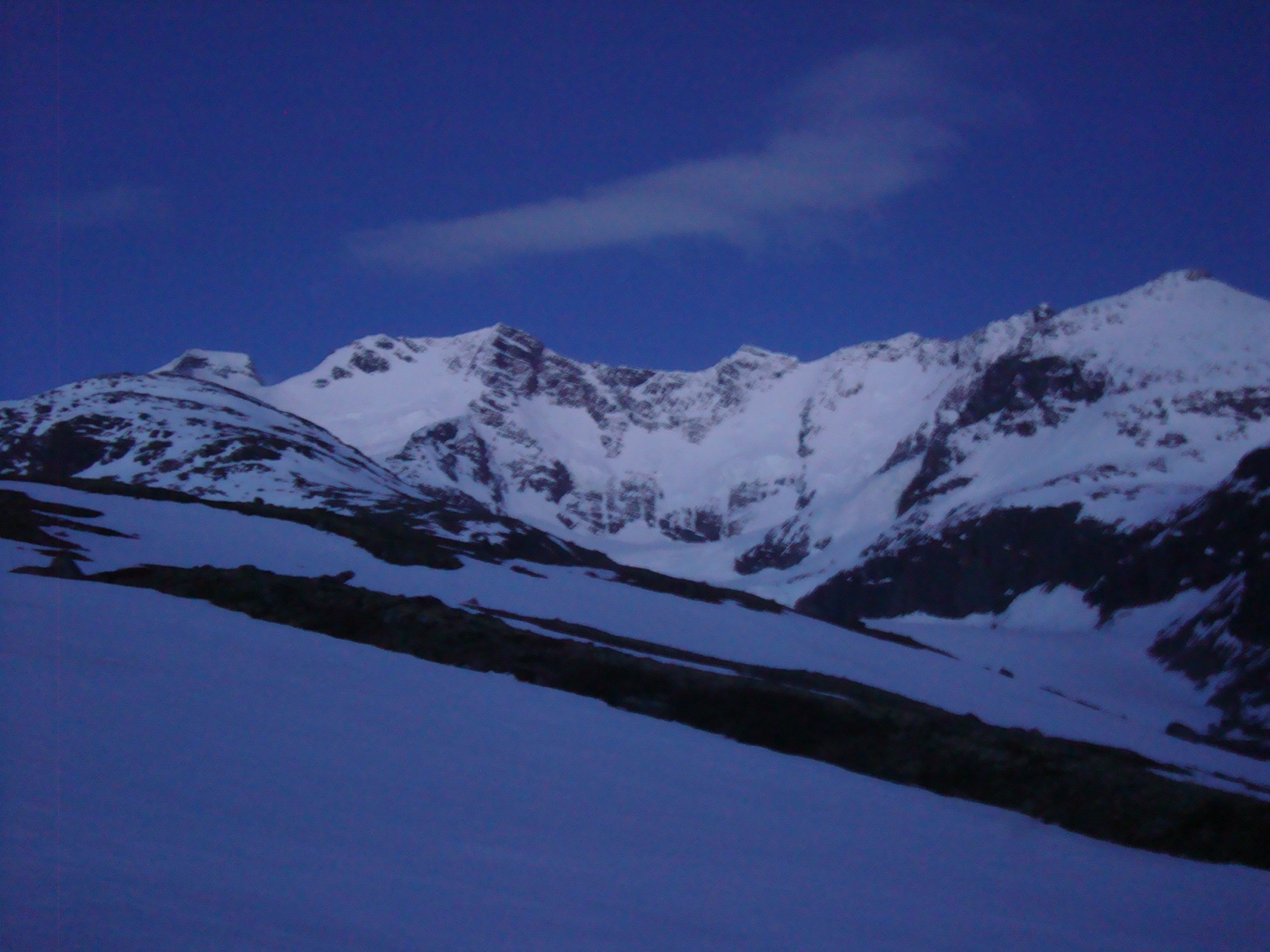Var en spennende tur dette, og skal legge ut bilder av snøeggen vi snudde for, når jeg er ferdig med eksamen og lange kvelder Det var ikke store skyen, men kan være greit å vite at været ikke har glemt meg Denne breen er nok den bratteste og råeste jeg har vært på til nå, og jeg hadde mine tanker da vi stod på det bratteste om hvordan et fall hadde ville fortonet seg. Uansett om vi nådde toppene eller ei, det var en fantastisk fin tur med fint vær. Var ikke noe mer trøtt enn vanlig på mandag, så slike våkenetter skal man ikke forrakte ila sommerhalvåret Det tyngste med hele turen må ha vært kjøreturen hjem, da vi ikke holdt stort sett mer enn 30 min bak rattet før ny veksling. -