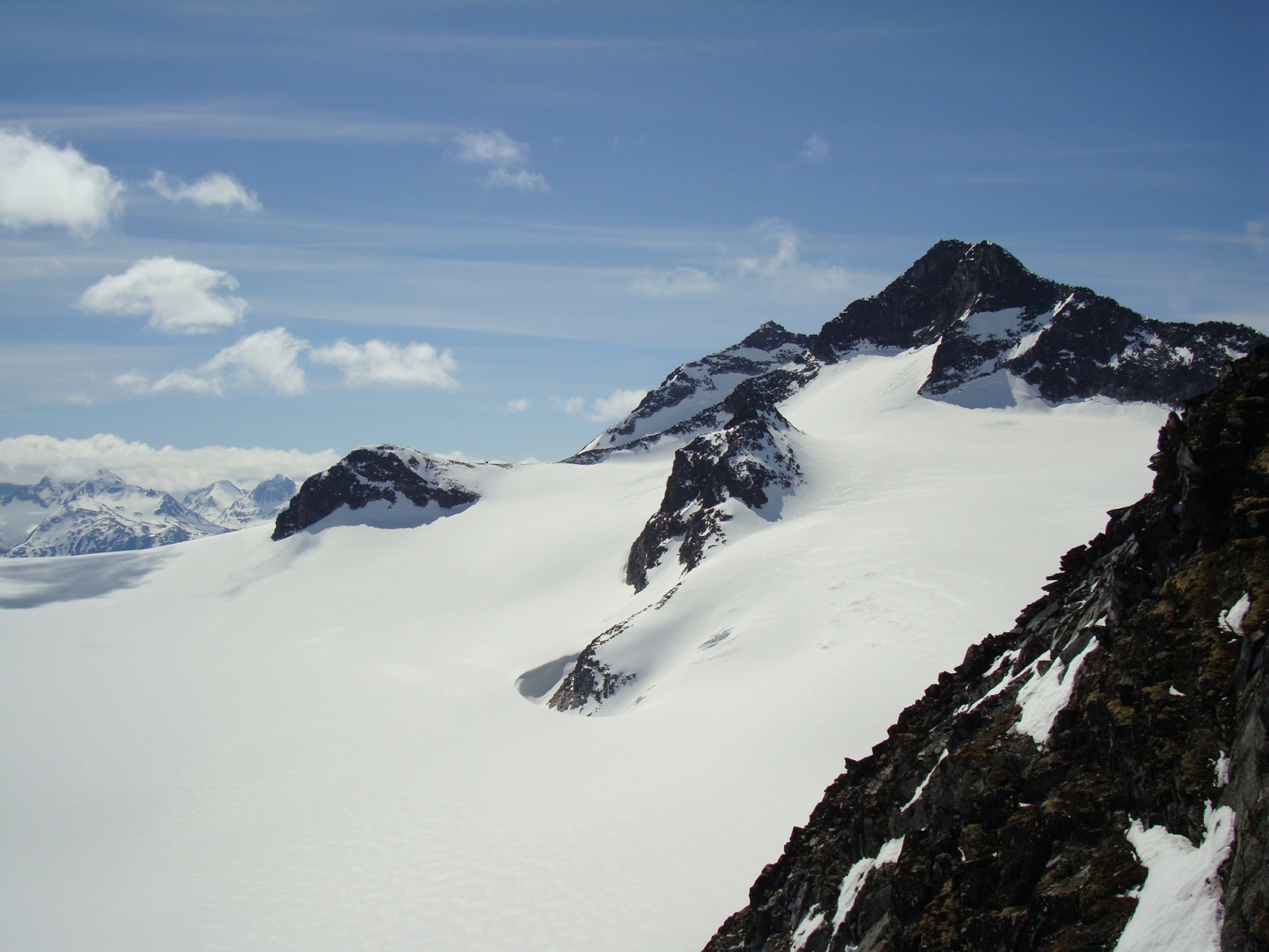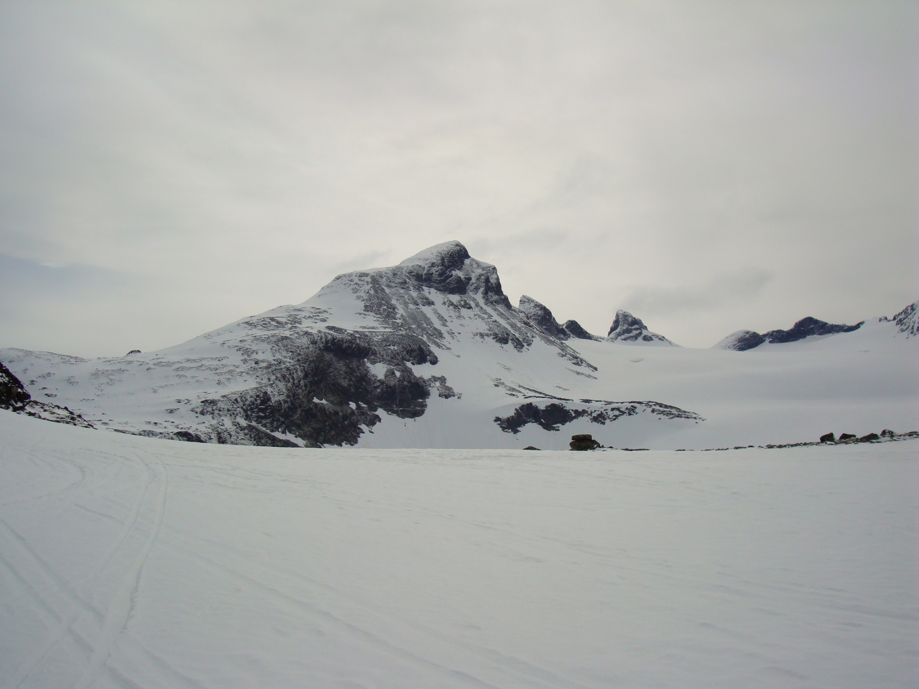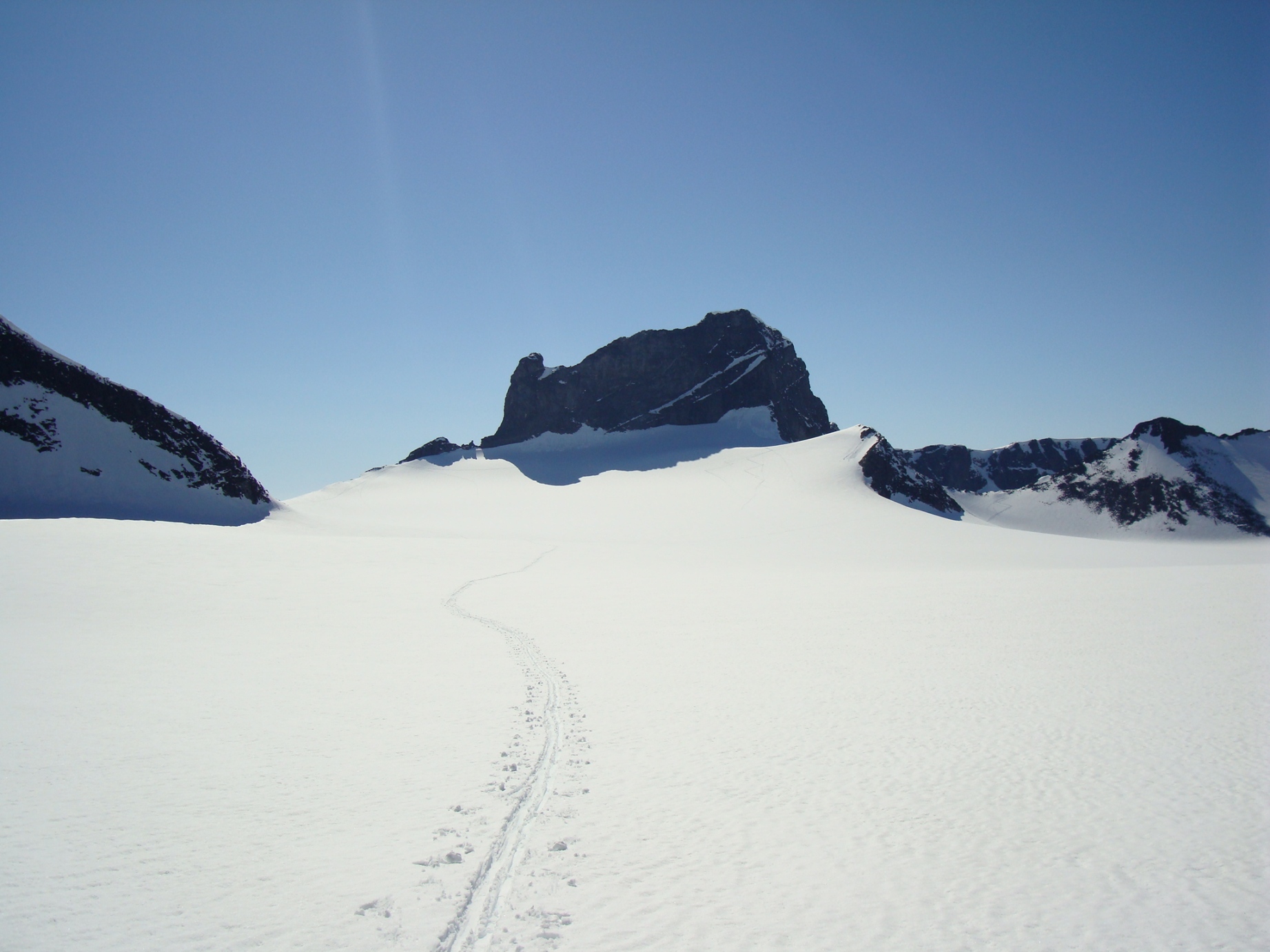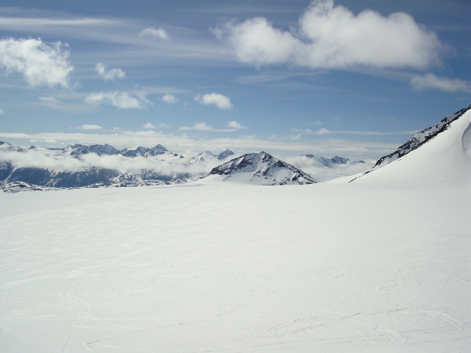 Topptur på Skagsnebbene, Hellstugubreahestene og ”Hellstugupiggen” 5. og 6. juni. 2009 Kjørte fra Bartebyen torsdags kveld etter et bedre måltid. Jeg ble noe overrasket over snøfall på Kongsvoll og Fokstua på veg over Dovrefjell. Tankene var da, jaja det er nå i alle fall nysnø i fjellet. Og nysnø ble det da jeg våknet med 2 cm nysnø på bilen fredag klokken seks. Fredag 5. juni Nysnøen gjorde sitt til at jeg slo av vekkerklokken, og sov et par timer ekstra i posen. Klokken åtte så det ut som været begynte å bli bedre, og jeg spiste en boks med turproviant mens jeg så noe skeptisk på fjellene som var dekket med skyer. Jeg stakk derfor en tur oppom Krossbu og kjøpte meg en kopp kaffe og en sjokolade mens jeg ventet på bedre vær. Værmeldingen så veldig bra ut for dagen, og skyene som gjorde meg skeptisk skulle forsvinne ganske så kjapt. Turen startet litt over klokken ni, og et par timer senere står jeg på Hurrbreatinden som jeg for øvrig hadde vært på akkurat for et år siden på dagen. Setter fra meg ski og staver her, og tar på meg stegjern. Finner etter hvert ut at stegjern ikke er nødvendig på store deler av strekning, men latskap gjør sitt til at jeg ikke orker å ta dem av. Klyvingen er morsom fra Hurrbreatinden og til Bakarste Skagsnebb. Det blir bare en kort drikkepause på toppen før ferden går videre mot Fremste Skagsnebb. Jeg har lenge gått og fryktet at det skulle være vanskelig å ta seg ned til Fremste Skagsnebb, men det kan hende at det gode føret denne dagen gjør at det ikke er så altfor ille, da jeg syntes at klyvingen mellom Hurrbreatinden og Bakarste var vanskelig. Det tar ikke så altfor lang tid å komme meg ned på det laveste punktet mellom Bakarste og Fremste Skagsnebb, og herfra går det raskt frem til toppen. Utsikten fra toppen av Fremste Skagsnebb er helt fantastisk, og man får virkelig følelsen av å stå på en topp da bilvegen er mer enn tusen høydemeter lavere enn i forhold til meg. Turen tilbake til Hurrbreatinden går greit, og jeg får faktisk til å stå på ski helt ned til bilen som er parkert ved Krossbu. Dagens tur varte på rundt seks og en halv time, og det var ikke et eneste menneske i syne selv om skiføret var perfekt og blå himmel. Lørdag 6. juni Etter en natt i bil ved Spiterstulen våknet jeg til frostrøyk og is på bilvinduene. Temperaturmåleren viste minus fem grader, og det tok derfor litt tid å stå opp. Klokken halv syv var jeg ferdig pakket og hadde spist en god frokost. Jeg tar på meg skiene ca en kilometer før bretungen og etter tre og en halv time setter jeg fra meg skiene og ryggsekken ved hytten til NVE på Søre Hellstugubreahest. Tar meg en kjapp tur oppom toppunktet før jeg spenner på meg skiene og går til Nørdre Hellstugubreahest. Det er ikke noe spesielt vanskelig å ta seg opp på denne, og jeg returnerer til hytten på Søre Hellstugubreahest. Tar meg en lengre pause her, og nyter utsikten utover breen. Utsikten er fantastisk, og et helikopter flyr over breen mens jeg slapper av. Jeg spenner på meg skiene igjen, og renner i sporene mine et stykke før jeg skifter kurs over breflaten mot Hellstugupiggen. Det er ikke mange sporene på breen, og enda færre (ingen) spor til Hellstugupiggen. Etter å ha parkert skiene i kanten mellom fjellet og breen går jeg snørennen som ender opp litt til høyre for toppunktet på ryggen. Snørennen er bratt, men går greit med stegjern og isøks. I fra det siste hakket og til toppunktet må jeg omgå litt til venstre for å unngå å gå rett opp steinblokken som blokkerer vegen. Omgåelsen til venstre er grei, og jeg følger noen hyllepartier til toppen. Det er godt å stå på toppen, og selv nå når klokken er to på dagen er det ikke et eneste menneske å se på noen av toppene i nærheten eller på breen. Det er litt rart å stå alene her inne med blå himmel og perfekt skiføre en tidlig dag i juni. Jeg kommer meg ned på breen, og renner så langt det er snø i dalen. Tar av meg skiene, spenner disse fast til sekken og er ved Spiterstulen en liten time senere. Har da brukt syv timer og femti minutter på dagens tur.
