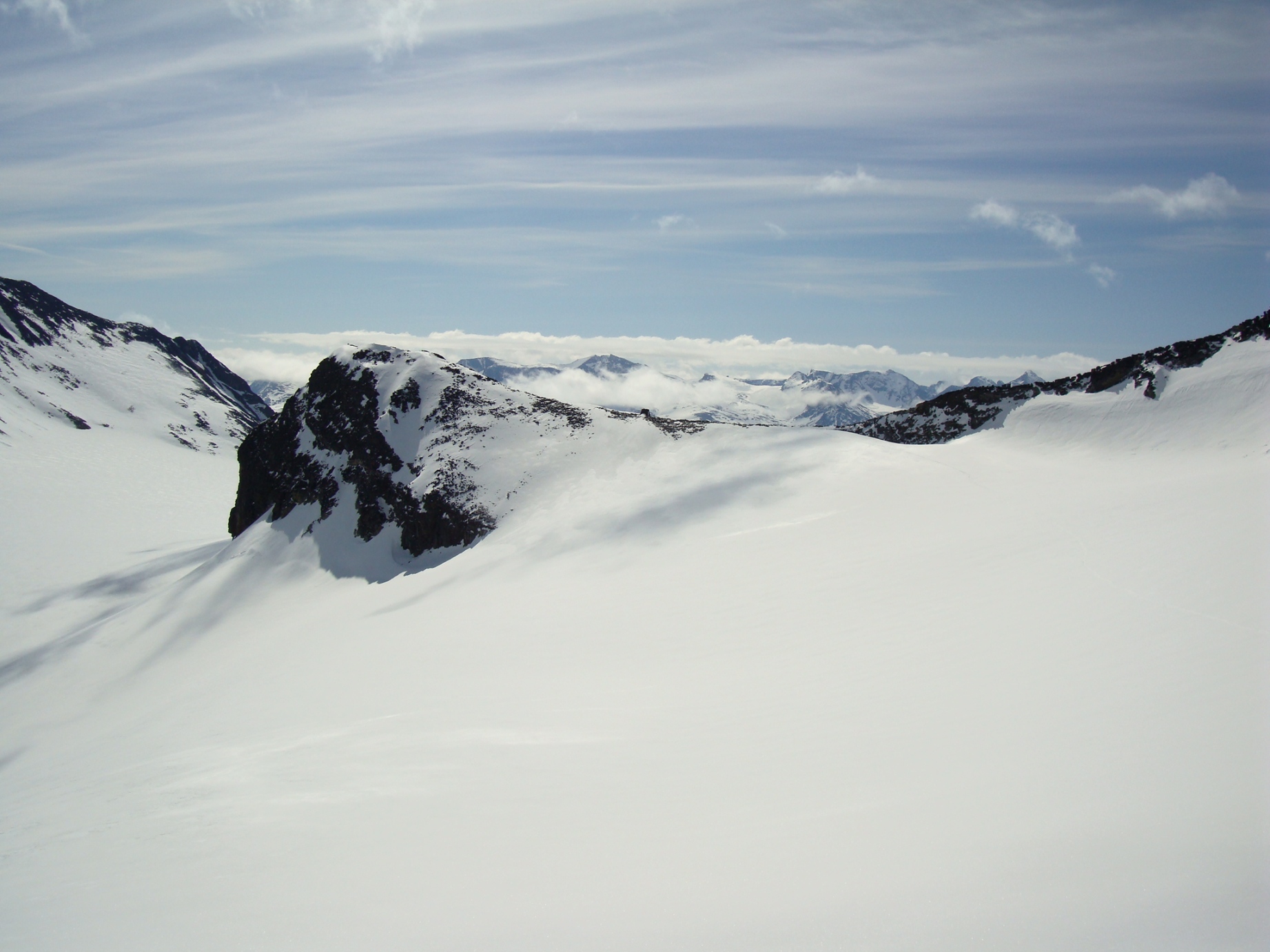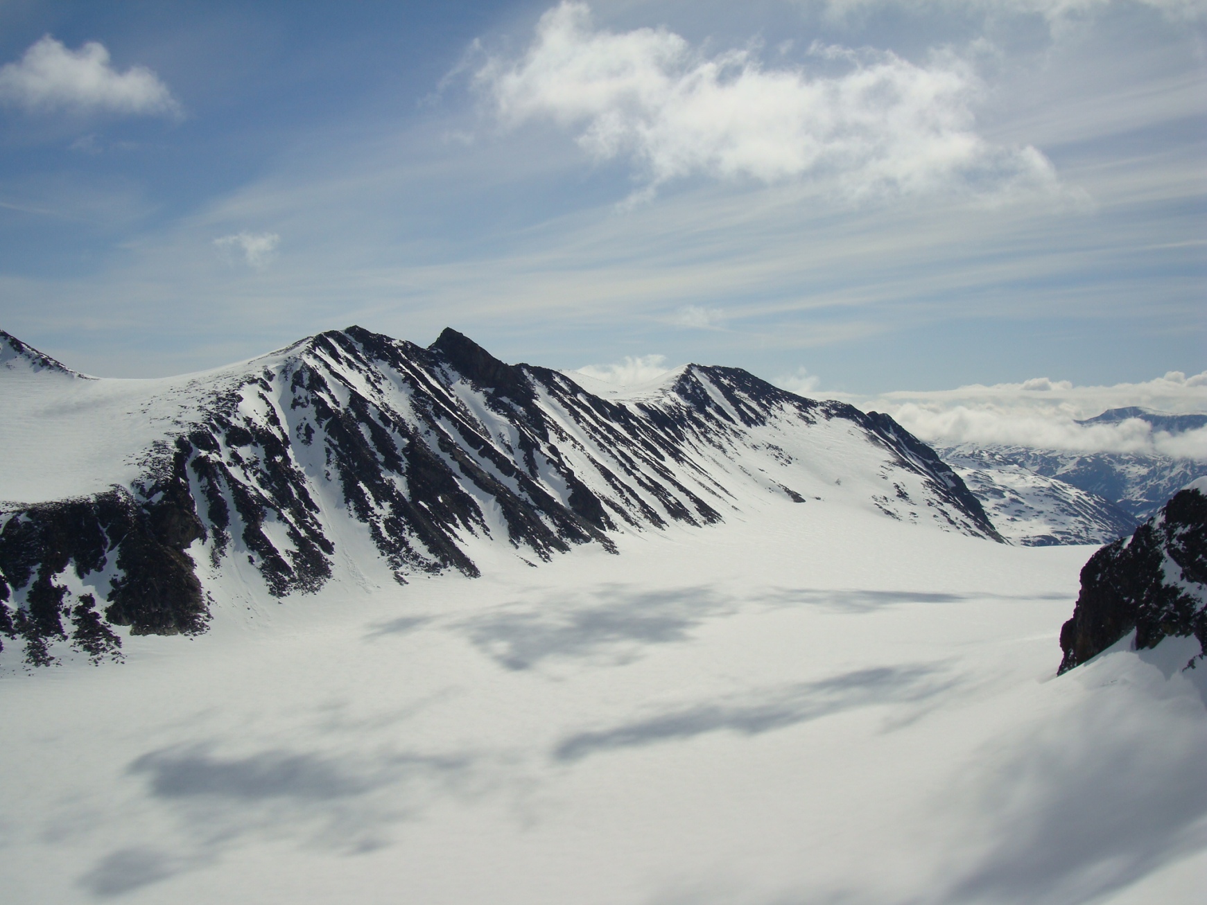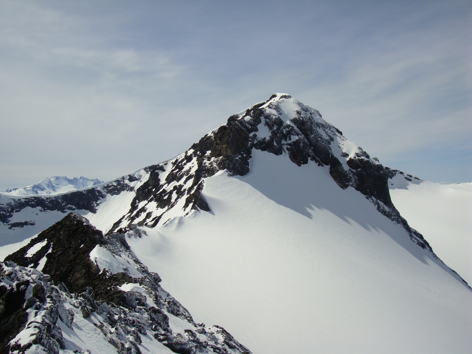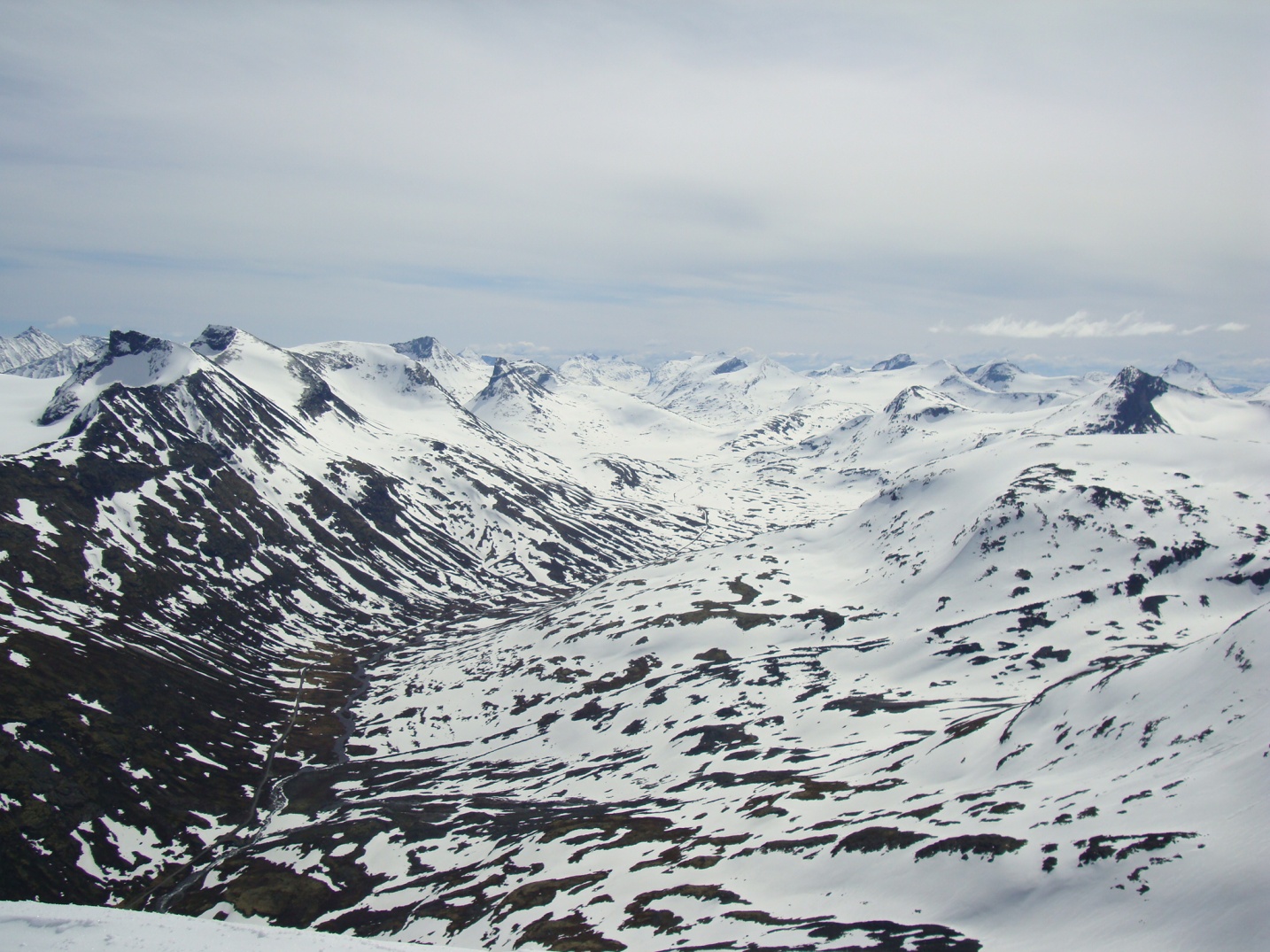 Topptur på Skagsnebbene, Hellstugubreahestene og ”Hellstugupiggen” 5. og 6. juni. 2009 Kjørte fra Bartebyen torsdags kveld etter et bedre måltid. Jeg ble noe overrasket over snøfall på Kongsvoll og Fokstua på veg over Dovrefjell. Tankene var da, jaja det er nå i alle fall nysnø i fjellet. Og nysnø ble det da jeg våknet med 2 cm nysnø på bilen fredag klokken seks. Fredag 5. juni Nysnøen gjorde sitt til at jeg slo av vekkerklokken, og sov et par timer ekstra i posen. Klokken åtte så det ut som været begynte å bli bedre, og jeg spiste en boks med turproviant mens jeg så noe skeptisk på fjellene som var dekket med skyer. Jeg stakk derfor en tur oppom Krossbu og kjøpte meg en kopp kaffe og en sjokolade mens jeg ventet på bedre vær. Værmeldingen så veldig bra ut for dagen, og skyene som gjorde meg skeptisk skulle forsvinne ganske så kjapt. Turen startet litt over klokken ni, og et par timer senere står jeg på Hurrbreatinden som jeg for øvrig hadde vært på akkurat for et år siden på dagen. Setter fra meg ski og staver her, og tar på meg stegjern. Finner etter hvert ut at stegjern ikke er nødvendig på store deler av strekning, men latskap gjør sitt til at jeg ikke orker å ta dem av. Klyvingen er morsom fra Hurrbreatinden og til Bakarste Skagsnebb. Det blir bare en kort drikkepause på toppen før ferden går videre mot Fremste Skagsnebb. Jeg har lenge gått og fryktet at det skulle være vanskelig å ta seg ned til Fremste Skagsnebb, men det kan hende at det gode føret denne dagen gjør at det ikke er så altfor ille, da jeg syntes at klyvingen mellom Hurrbreatinden og Bakarste var vanskelig. Det tar ikke så altfor lang tid å komme meg ned på det laveste punktet mellom Bakarste og Fremste Skagsnebb, og herfra går det raskt frem til toppen. Utsikten fra toppen av Fremste Skagsnebb er helt fantastisk, og man får virkelig følelsen av å stå på en topp da bilvegen er mer enn tusen høydemeter lavere enn i forhold til meg. Turen tilbake til Hurrbreatinden går greit, og jeg får faktisk til å stå på ski helt ned til bilen som er parkert ved Krossbu. Dagens tur varte på rundt seks og en halv time, og det var ikke et eneste menneske i syne selv om skiføret var perfekt og blå himmel. Lørdag 6. juni Etter en natt i bil ved Spiterstulen våknet jeg til frostrøyk og is på bilvinduene. Temperaturmåleren viste minus fem grader, og det tok derfor litt tid å stå opp. Klokken halv syv var jeg ferdig pakket og hadde spist en god frokost. Jeg tar på meg skiene ca en kilometer før bretungen og etter tre og en halv time setter jeg fra meg skiene og ryggsekken ved hytten til NVE på Søre Hellstugubreahest. Tar meg en kjapp tur oppom toppunktet før jeg spenner på meg skiene og går til Nørdre Hellstugubreahest. Det er ikke noe spesielt vanskelig å ta seg opp på denne, og jeg returnerer til hytten på Søre Hellstugubreahest. Tar meg en lengre pause her, og nyter utsikten utover breen. Utsikten er fantastisk, og et helikopter flyr over breen mens jeg slapper av. Jeg spenner på meg skiene igjen, og renner i sporene mine et stykke før jeg skifter kurs over breflaten mot Hellstugupiggen. Det er ikke mange sporene på breen, og enda færre (ingen) spor til Hellstugupiggen. Etter å ha parkert skiene i kanten mellom fjellet og breen går jeg snørennen som ender opp litt til høyre for toppunktet på ryggen. Snørennen er bratt, men går greit med stegjern og isøks. I fra det siste hakket og til toppunktet må jeg omgå litt til venstre for å unngå å gå rett opp steinblokken som blokkerer vegen. Omgåelsen til venstre er grei, og jeg følger noen hyllepartier til toppen. Det er godt å stå på toppen, og selv nå når klokken er to på dagen er det ikke et eneste menneske å se på noen av toppene i nærheten eller på breen. Det er litt rart å stå alene her inne med blå himmel og perfekt skiføre en tidlig dag i juni. Jeg kommer meg ned på breen, og renner så langt det er snø i dalen. Tar av meg skiene, spenner disse fast til sekken og er ved Spiterstulen en liten time senere. Har da brukt syv timer og femti minutter på dagens tur.