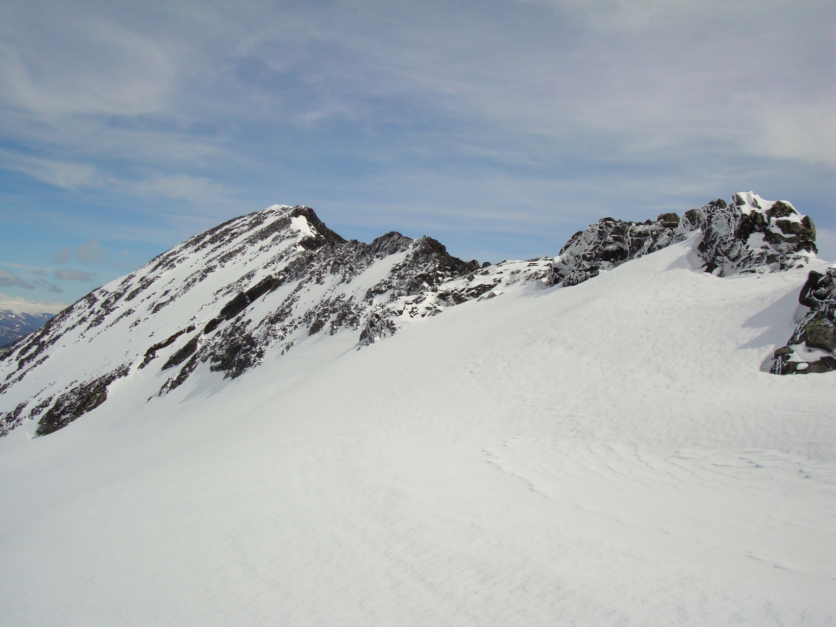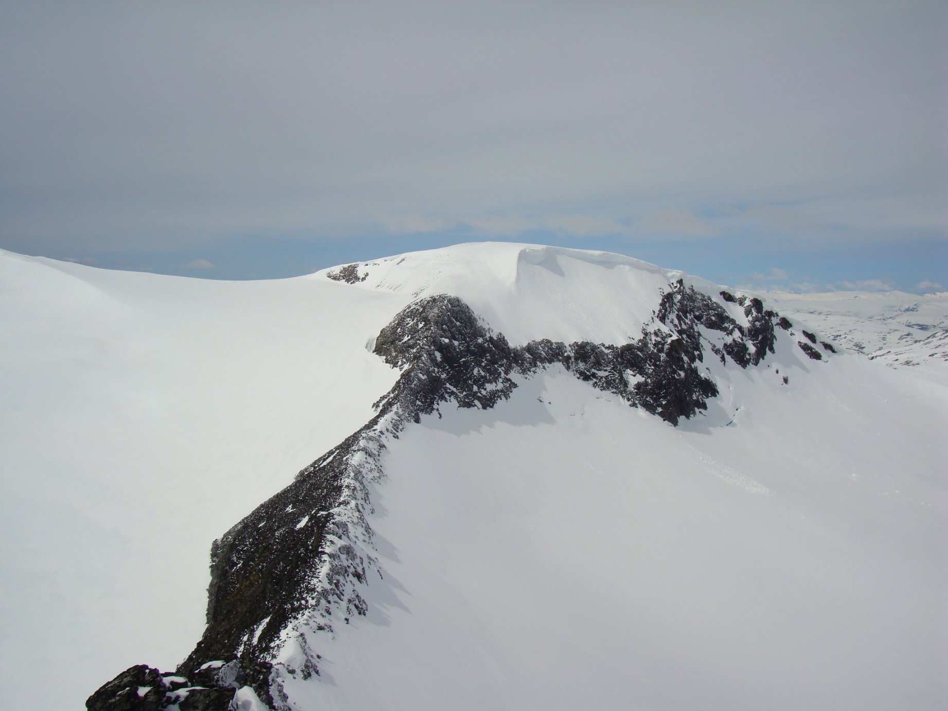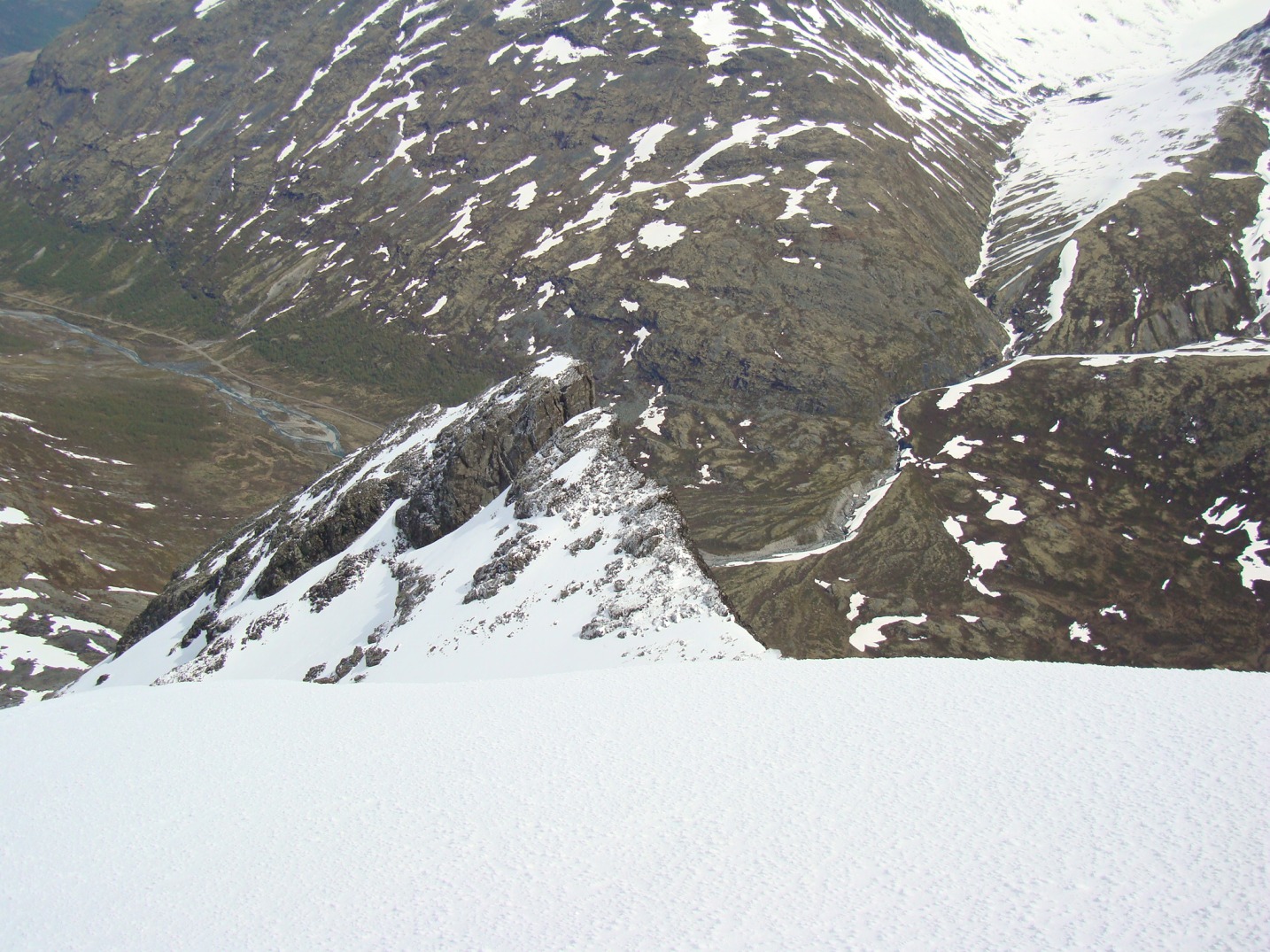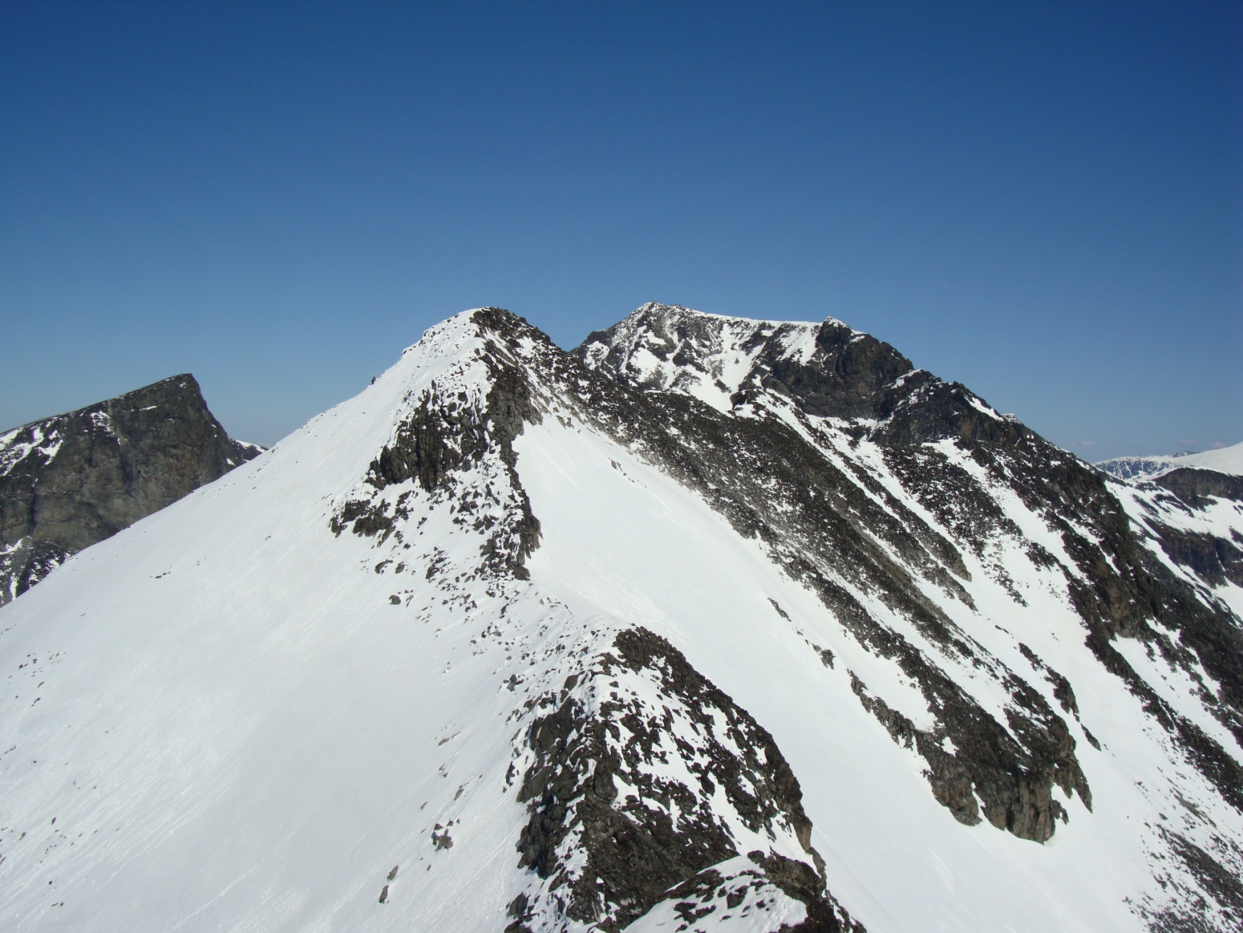 Topptur på Skagsnebbene, Hellstugubreahestene og ”Hellstugupiggen” 5. og 6. juni. 2009 Kjørte fra Bartebyen torsdags kveld etter et bedre måltid. Jeg ble noe overrasket over snøfall på Kongsvoll og Fokstua på veg over Dovrefjell. Tankene var da, jaja det er nå i alle fall nysnø i fjellet. Og nysnø ble det da jeg våknet med 2 cm nysnø på bilen fredag klokken seks. Fredag 5. juni Nysnøen gjorde sitt til at jeg slo av vekkerklokken, og sov et par timer ekstra i posen. Klokken åtte så det ut som været begynte å bli bedre, og jeg spiste en boks med turproviant mens jeg så noe skeptisk på fjellene som var dekket med skyer. Jeg stakk derfor en tur oppom Krossbu og kjøpte meg en kopp kaffe og en sjokolade mens jeg ventet på bedre vær. Værmeldingen så veldig bra ut for dagen, og skyene som gjorde meg skeptisk skulle forsvinne ganske så kjapt. Turen startet litt over klokken ni, og et par timer senere står jeg på Hurrbreatinden som jeg for øvrig hadde vært på akkurat for et år siden på dagen. Setter fra meg ski og staver her, og tar på meg stegjern. Finner etter hvert ut at stegjern ikke er nødvendig på store deler av strekning, men latskap gjør sitt til at jeg ikke orker å ta dem av. Klyvingen er morsom fra Hurrbreatinden og til Bakarste Skagsnebb. Det blir bare en kort drikkepause på toppen før ferden går videre mot Fremste Skagsnebb. Jeg har lenge gått og fryktet at det skulle være vanskelig å ta seg ned til Fremste Skagsnebb, men det kan hende at det gode føret denne dagen gjør at det ikke er så altfor ille, da jeg syntes at klyvingen mellom Hurrbreatinden og Bakarste var vanskelig. Det tar ikke så altfor lang tid å komme meg ned på det laveste punktet mellom Bakarste og Fremste Skagsnebb, og herfra går det raskt frem til toppen. Utsikten fra toppen av Fremste Skagsnebb er helt fantastisk, og man får virkelig følelsen av å stå på en topp da bilvegen er mer enn tusen høydemeter lavere enn i forhold til meg. Turen tilbake til Hurrbreatinden går greit, og jeg får faktisk til å stå på ski helt ned til bilen som er parkert ved Krossbu. Dagens tur varte på rundt seks og en halv time, og det var ikke et eneste menneske i syne selv om skiføret var perfekt og blå himmel. Lørdag 6. juni Etter en natt i bil ved Spiterstulen våknet jeg til frostrøyk og is på bilvinduene. Temperaturmåleren viste minus fem grader, og det tok derfor litt tid å stå opp. Klokken halv syv var jeg ferdig pakket og hadde spist en god frokost. Jeg tar på meg skiene ca en kilometer før bretungen og etter tre og en halv time setter jeg fra meg skiene og ryggsekken ved hytten til NVE på Søre Hellstugubreahest. Tar meg en kjapp tur oppom toppunktet før jeg spenner på meg skiene og går til Nørdre Hellstugubreahest. Det er ikke noe spesielt vanskelig å ta seg opp på denne, og jeg returnerer til hytten på Søre Hellstugubreahest. Tar meg en lengre pause her, og nyter utsikten utover breen. Utsikten er fantastisk, og et helikopter flyr over breen mens jeg slapper av. Jeg spenner på meg skiene igjen, og renner i sporene mine et stykke før jeg skifter kurs over breflaten mot Hellstugupiggen. Det er ikke mange sporene på breen, og enda færre (ingen) spor til Hellstugupiggen. Etter å ha parkert skiene i kanten mellom fjellet og breen går jeg snørennen som ender opp litt til høyre for toppunktet på ryggen. Snørennen er bratt, men går greit med stegjern og isøks. I fra det siste hakket og til toppunktet må jeg omgå litt til venstre for å unngå å gå rett opp steinblokken som blokkerer vegen. Omgåelsen til venstre er grei, og jeg følger noen hyllepartier til toppen. Det er godt å stå på toppen, og selv nå når klokken er to på dagen er det ikke et eneste menneske å se på noen av toppene i nærheten eller på breen. Det er litt rart å stå alene her inne med blå himmel og perfekt skiføre en tidlig dag i juni. Jeg kommer meg ned på breen, og renner så langt det er snø i dalen. Tar av meg skiene, spenner disse fast til sekken og er ved Spiterstulen en liten time senere. Har da brukt syv timer og femti minutter på dagens tur.