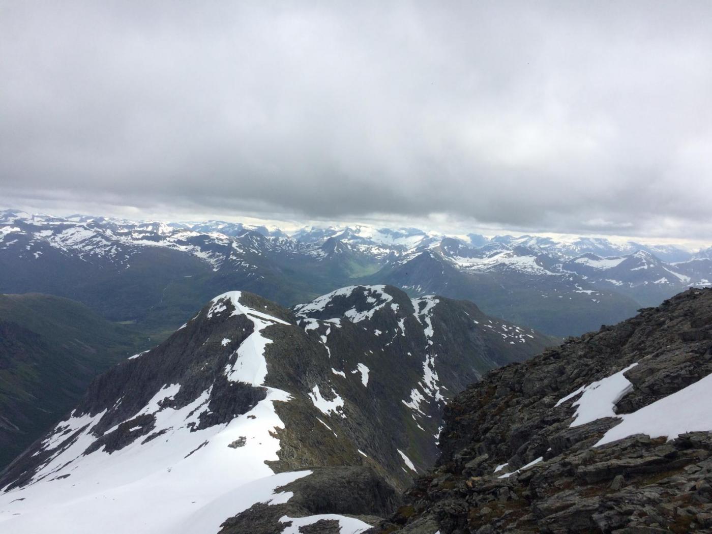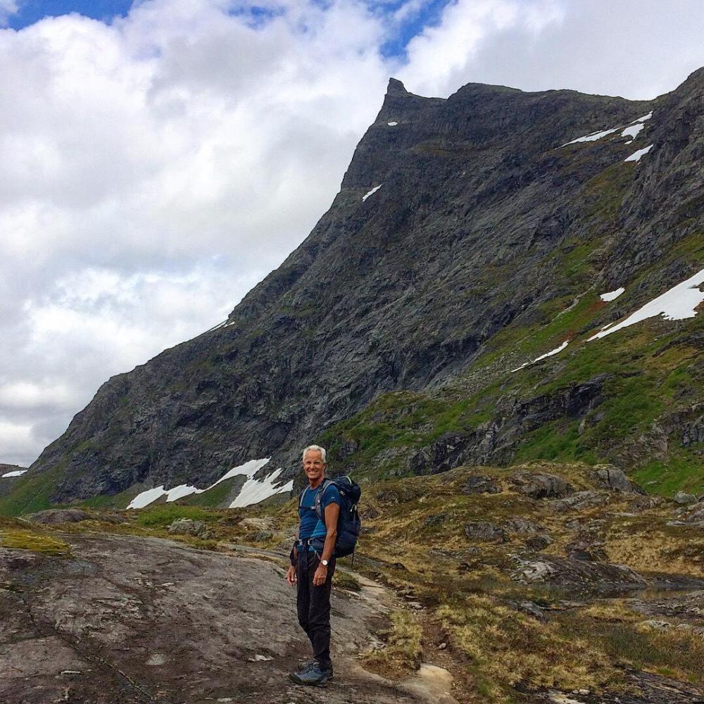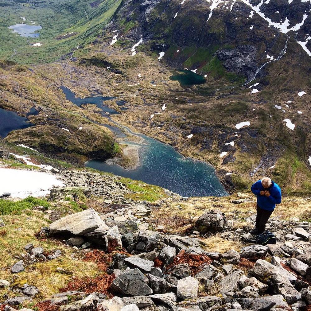 Mitt friluftsliv består stort sett av å vandre rundt med fiskestang. Har derfor blitt lite toppturer i løpet av livet. I år bestemte jeg meg for å prøve å endre på dette. Allierte meg i den anledning med ei sprek fjellgeit - min 60 år gamle far! Han sa seg villig til å ta med meg og hunden - Gjøa - opp på et par vestlandsfjell. Første etappe ble Hornindalsrokken. Spektakulært, og fryktelig bratt for en som ikke er vant til slikt! Stoppet for å ta bilde gjennom Jomfrusteinen, men skydekket ville ikke samarbeide.. Stien går i den grønne leia opp til snøflekkene, ca midt på bildet. Derfra går den rundt til baksiden av toppen og opp. Var usikker på hvordan hunden kom til å takle terrenget da det er litt småklyving inne i bildet, men det viste seg selvfølgelig at hun var både smidigere og sprekere enn begge de tobeinte! Hadde i anledningen tatt med meg speilrefleksen for å ta noen skikkelig fine bilder, men det ble glemt igjen i bilen. Det samme skjedde dagen etter 🙈 Snart fremme! Prøve å få hunden til å posere sammen med meg på bildet, men hun var altfor opptatt med å kikke ned den loddrette fjellveggen ved siden av. Så sikkert en saueflokk i det fjerne! Far ville ikke posere med varden. "Har tatt bilde her før, så trenger ikke flere" På tilbaketuren kom sola for alvor frem bak skyene, så da ble det bading i Store Luka nærmest til venstre på vei nedover. Vel tilbake i bilen etter 5,5 time vendte vi nesen mot campinghytte på Urke Camping for å pleie slitne knær og lade opp til morgendagens tur over Urkeegga.