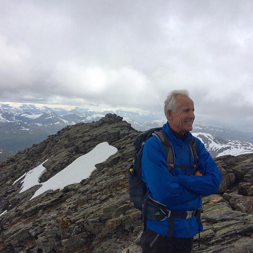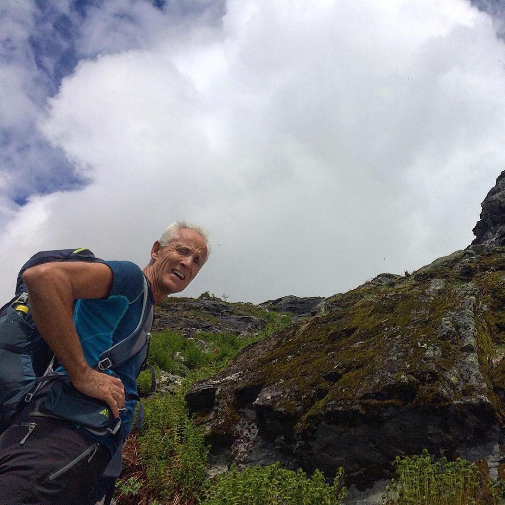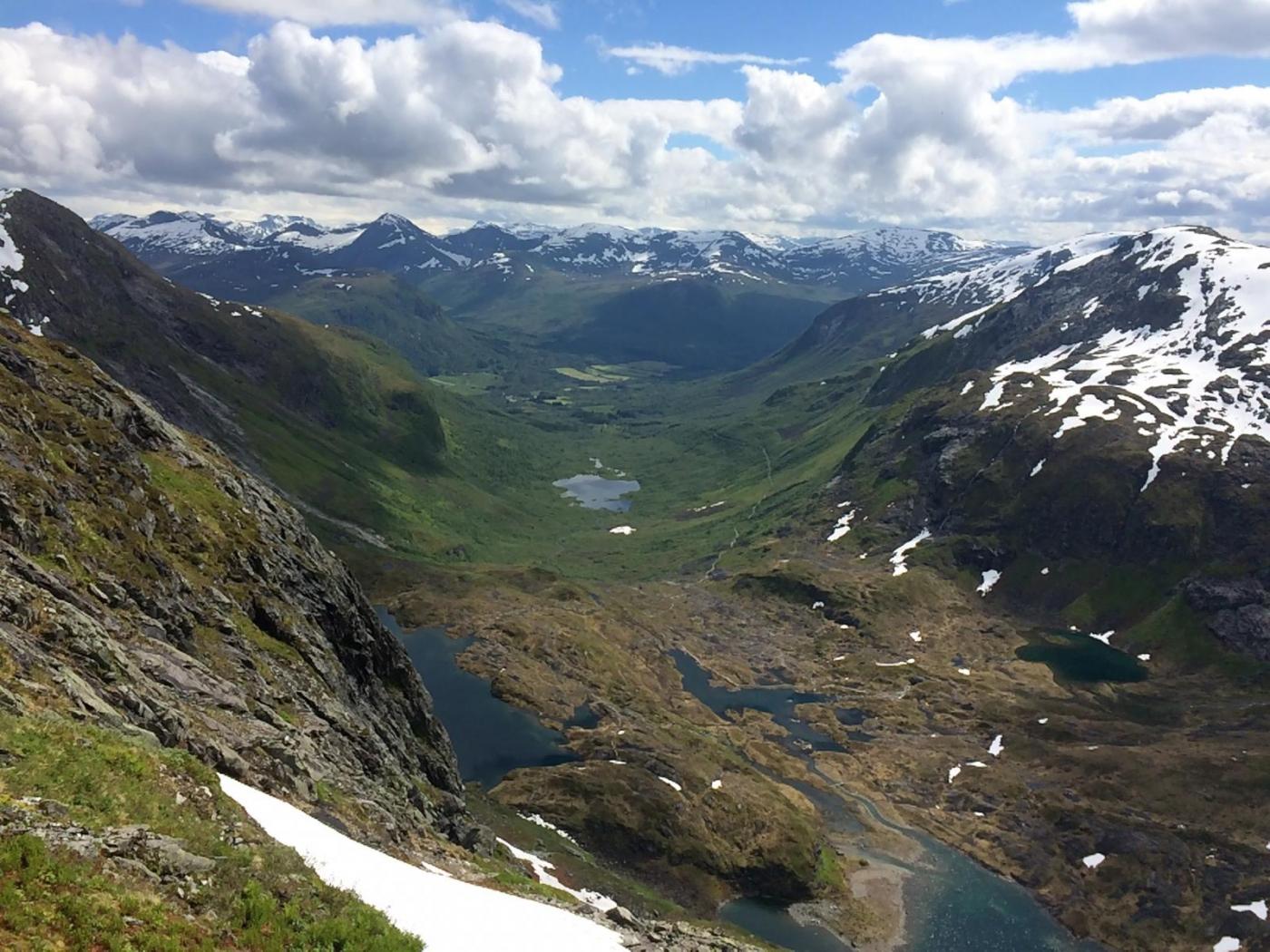 Mitt friluftsliv består stort sett av å vandre rundt med fiskestang. Har derfor blitt lite toppturer i løpet av livet. I år bestemte jeg meg for å prøve å endre på dette. Allierte meg i den anledning med ei sprek fjellgeit - min 60 år gamle far! Han sa seg villig til å ta med meg og hunden - Gjøa - opp på et par vestlandsfjell. Første etappe ble Hornindalsrokken. Spektakulært, og fryktelig bratt for en som ikke er vant til slikt! Stoppet for å ta bilde gjennom Jomfrusteinen, men skydekket ville ikke samarbeide.. Stien går i den grønne leia opp til snøflekkene, ca midt på bildet. Derfra går den rundt til baksiden av toppen og opp. Var usikker på hvordan hunden kom til å takle terrenget da det er litt småklyving inne i bildet, men det viste seg selvfølgelig at hun var både smidigere og sprekere enn begge de tobeinte! Hadde i anledningen tatt med meg speilrefleksen for å ta noen skikkelig fine bilder, men det ble glemt igjen i bilen. Det samme skjedde dagen etter 🙈 Snart fremme! Prøve å få hunden til å posere sammen med meg på bildet, men hun var altfor opptatt med å kikke ned den loddrette fjellveggen ved siden av. Så sikkert en saueflokk i det fjerne! Far ville ikke posere med varden. "Har tatt bilde her før, så trenger ikke flere" På tilbaketuren kom sola for alvor frem bak skyene, så da ble det bading i Store Luka nærmest til venstre på vei nedover. Vel tilbake i bilen etter 5,5 time vendte vi nesen mot campinghytte på Urke Camping for å pleie slitne knær og lade opp til morgendagens tur over Urkeegga.