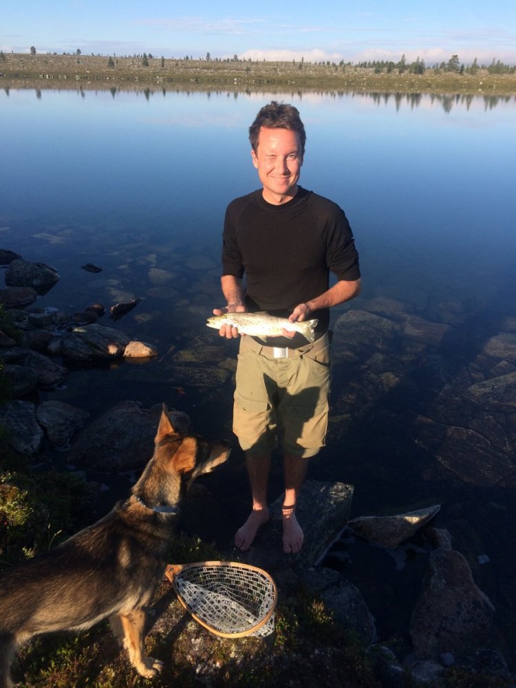 Skulle være 14 dager i Femundsmarka, men vi ga oss etter 7. Hadde litt utstyrsproblemer og værmeldingen var godt under middels for de påfølgende dagene, så da var det like greit å gi seg mens leken var god! Skulle egentlig gå videre til Kratltjønnan og videre opp til Røavassdraget for å padle packraft ned mot Femunden. Hadde en fantastisk fin tur selv om fisket ikke ble like storslagent som man håpte på forhånd, og Naturehiketeltene ikke overlevde særlig lenge Ryggen min er glad jeg ikke tok med skikkelig kamera, selv om bildene hadde blitt enda finere å se på! Røvolltjønnan Første og største fisk på turen, tatt i Røvolltjønnan. Hvorfor barbeint? Fisken gikk inn i steinene og sleit sena. Bannet for meg selv og begynte å knytte på ny swivel. Da så jeg noe blankt som bevegde seg nedi steinene - sena hang såpass godt fast nedi der at fisken ikke kom seg videre! Da var det bare å kaste skoene og vasse ut for å plukke Solnedgang ved Korstjønnan Blankt lite tjern mellom Haugen og Korstjønnan Grøtåa. 100 grams på første kast med flue, ingenting de neste timene.. Solnedgang over Sætertjønna