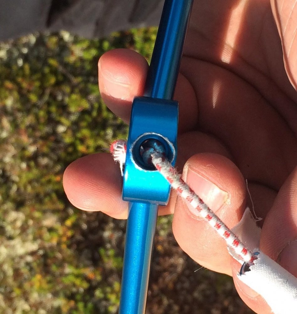 Nei, her er et bilde fra hvordan det så ut rett etter stangen spratt ut første gang på første teltet. Her gikk det fremdeles an å fikse med teip, men hullet utvidet seg mer både i over- og underkant etterhvert.