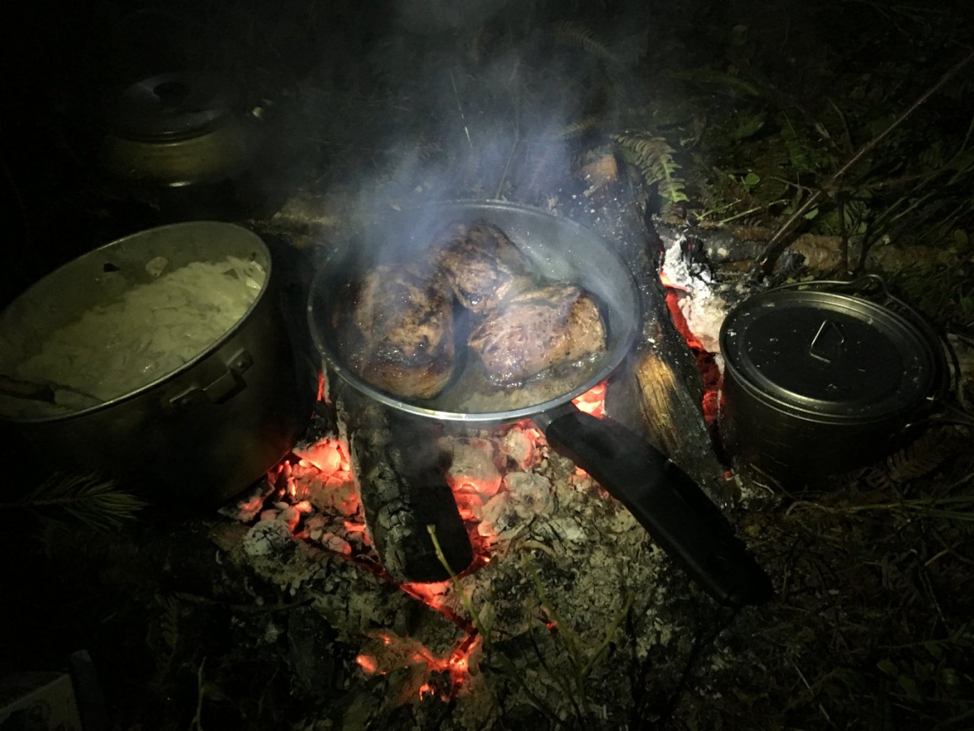 1. Hjortebiff, ris og fløtesaus m/sopp, paprika og bacon er ikke å forakte etter en dag på jakt Typisk grillmat som koteletter er også lettvint å slenge med seg fra butikken, holder seg greit i varmen. Godt er det også! Alltid ett høydepunkt med digg mat på tur, men nå skal det sies at det blir som oftest sånn mat bare første kvelden -om det ikke er så veldig langt fra bilen