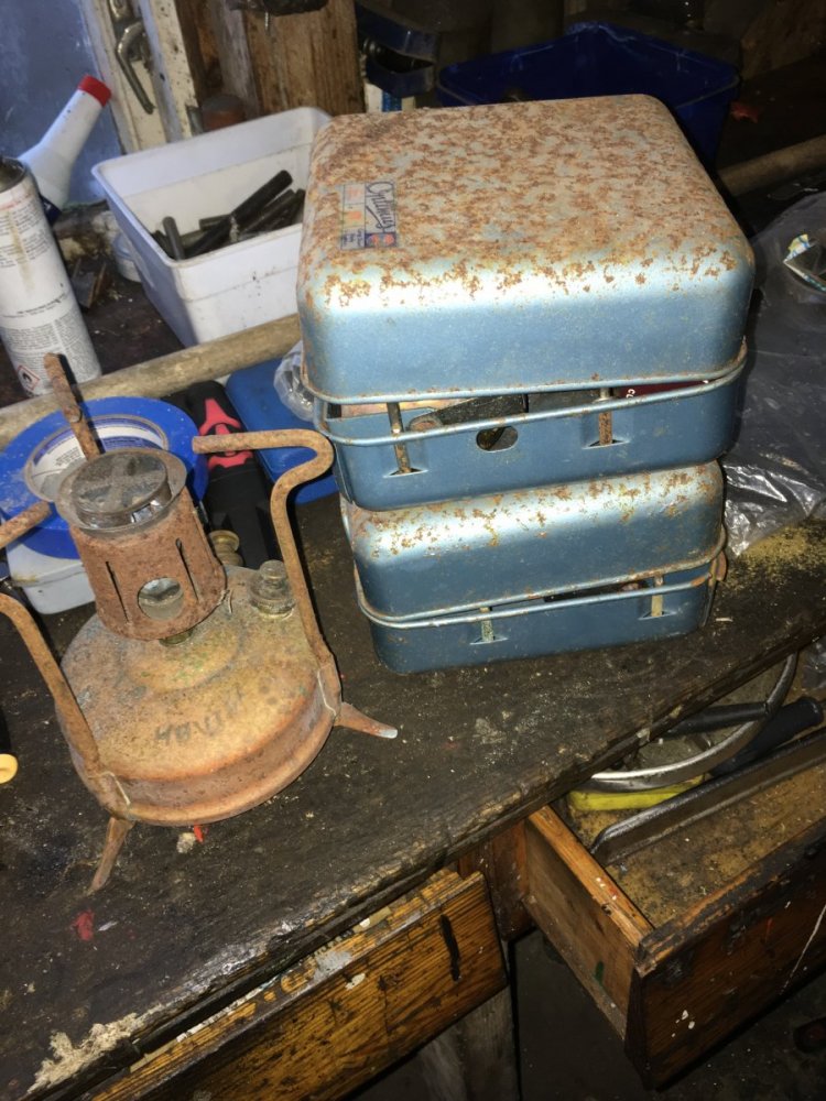 Ble plutselig eier av to stk i kveld. Spurte min bestefar etter vi plundra litt med ei parafinlampe om han ikke hadde noen primuser. Joda han og faren min hadde vist noen etter dem gikk Nordmarka rundt osvosv. Alt man finner ut når man begynner å grave. Skattejakt på låven ga godt resultat. Beklagelig vis mer rustet enn jeg håpet men har trua. Disse skal i drift. Alle disse pluss en større fra Høvik verk standard(?) litt usikker på disse modellene men skal gjøre litt research. Kan få tatt bilde av den også. Ene foten som var loddet fast hadde løsnet dessverre. Totalt fire primuser rikere. Har jeg vist dette tror jeg ikke det hadde blitt bestilt en primus omnilite i går.