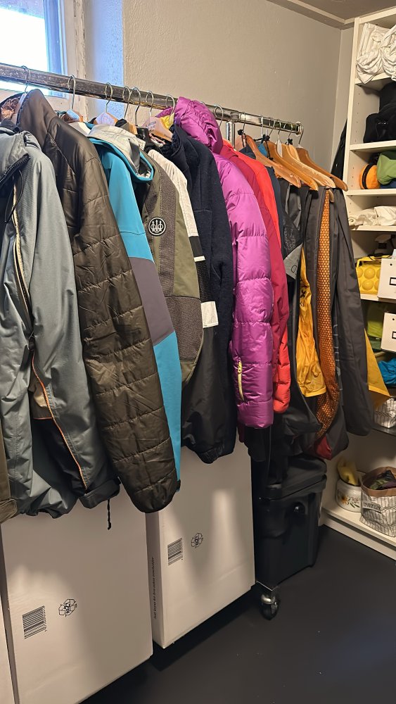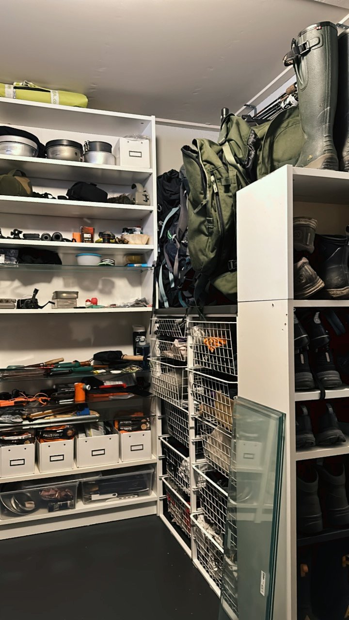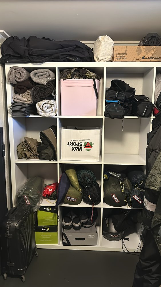 Vi har pusset opp turboden og jeg fikk så mange gode tips og idéer med å lese diverse innlegg her så jeg ville dele vårs løsninger så kanskje noen andre kan ha nytte av de (Si i fra hvis det er et bedre sted å legge dette, fant ingen gamle innlegg der det var helt passende) - Romdeler til større ting som telt, sitteunderlag, hengekøyer, fotposer, sommerdunposer, Jervenduker o.l. - IKEA BILLY bokhyller med mange ekstra hylleplater til småting som fiskeutstyr, kjøkken, turmat, kart osv. Hver hylle har kun ett «tema» eller kategori - Elfa stativ 90 cm høye til klær og tilbehør. Oppå de er det en benkeplate der vi har alle ryggsekker. På enden av benkeplata er det en bokhylle der vi har sko. Den er litt høyere enn benkeplata så ikke sekkene sklir av (andre enden er mot vegg). Ovenfor sekkene er det veggkroker fra Biltema der fiskestengene oppbevares. - Solid klesstativ fra butikk. På hoveddelen henger jakker og under de så er det flytteesker med vintersoveposer. De står på stanga til stativet så de ikke står rett på kjellergulvet. På ene uttrekksdelen av stativet henger vatterte bukser på S-kroker og på den andre utrekksdelen henger kleshengere med oppblåsbare liggeunderlag. Alt er gjenbruk av ting vi hadde i huset fra før, så ikke særlig pent og fancy men veldig mye bedre enn hva vi hadde før. Rommet er like over 6 kvm.