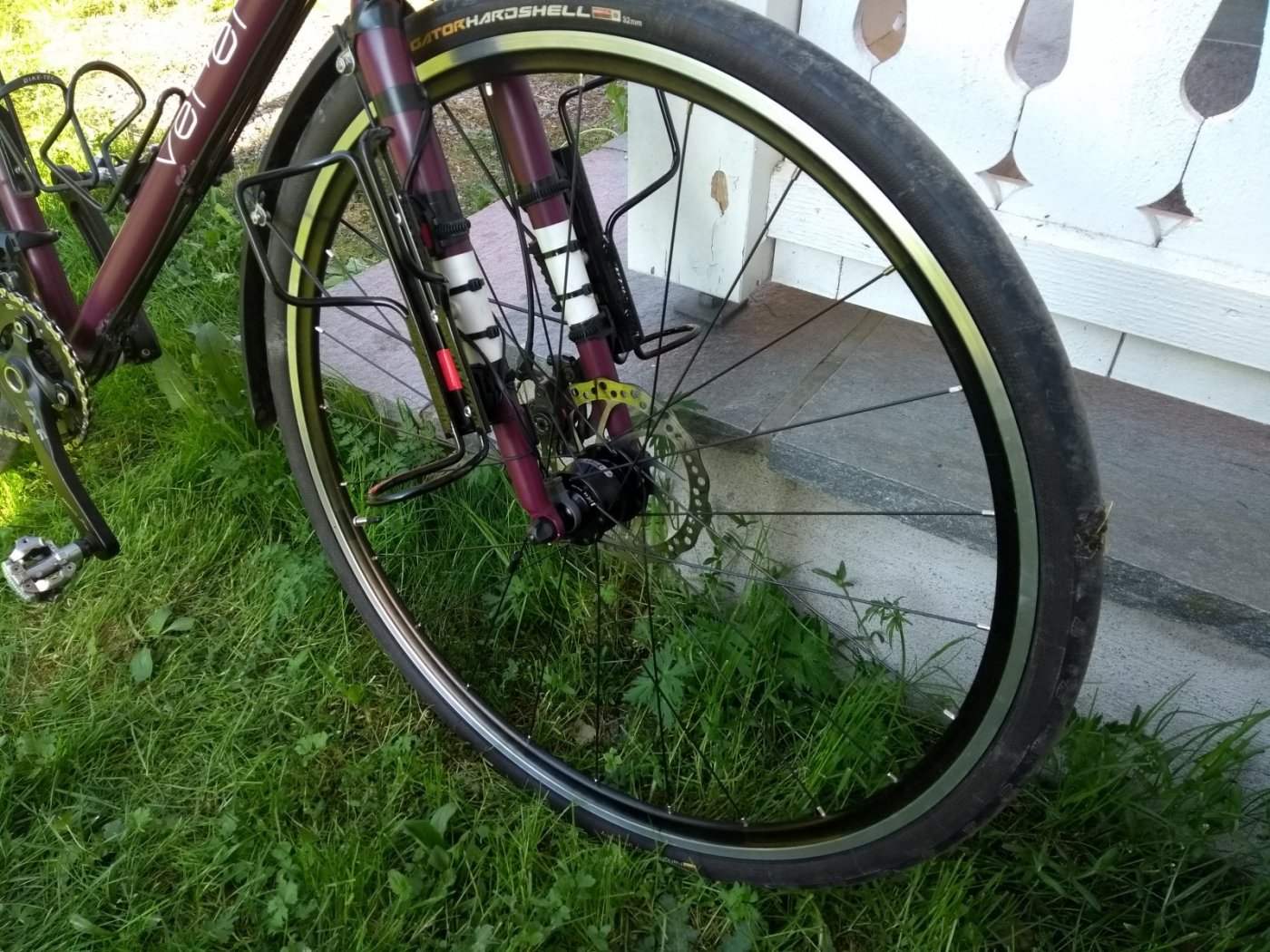Da var også hjul med navdynamo ferdigbygget. Dynamoen er en Shutter Precision SD-8, 24-eikers. Felgen er robbet fra et ødelagt bakhjul (frinavet gikk føyka) til en Diamant Photon 10, så jeg kan bruke hjulet i sykler med felgbrems også.