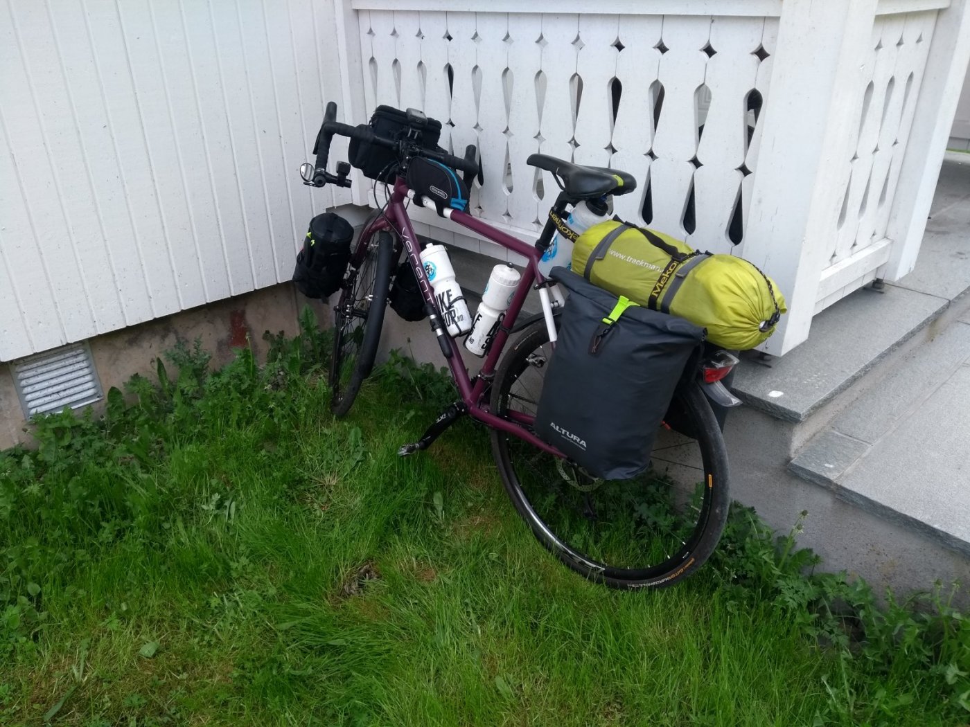 Offameien, livet bare helt j@vlig dere... Neida, dette blir nok bare moro! :). Har klargjort hojen for tur i dag. Reiser nok ikke ut riktig enda, men i begynnelsen av juni tenker jeg. Satt på nye stativ foran (Salsa Anything Cage). Veskene i dem er faktiskt ikke annet enn toalettmapper kjøpt på Europris ifjor. Innholdet i dem er primus (Svea 123), kaffe og kopp i den ene, og bensinflaske og reservemat (div. posesupper og litt ris) i den andre. Bak så har jeg et par Altura Ultralight Packable Panniers. Sovepose, liggeunderlag og litt annet campingutstyr i den ene og "blondetrusene" i den andre. Den totale vekta på disse to er 6,5kg. I den gamle grønne teltposen har jeg Enan-teltet mitt (i egen pose), gummiklogger, regnjakke og solcellepanel. Turen går fra Mysen, Horten (ferge), Kongsberg, opp Numedal, Hardangervidda, Eidfjord, Odda og E134 østover og så mot Horten igjen. Det blir vel litt i underkant av 100 mil og regner med å bruke et par uker.