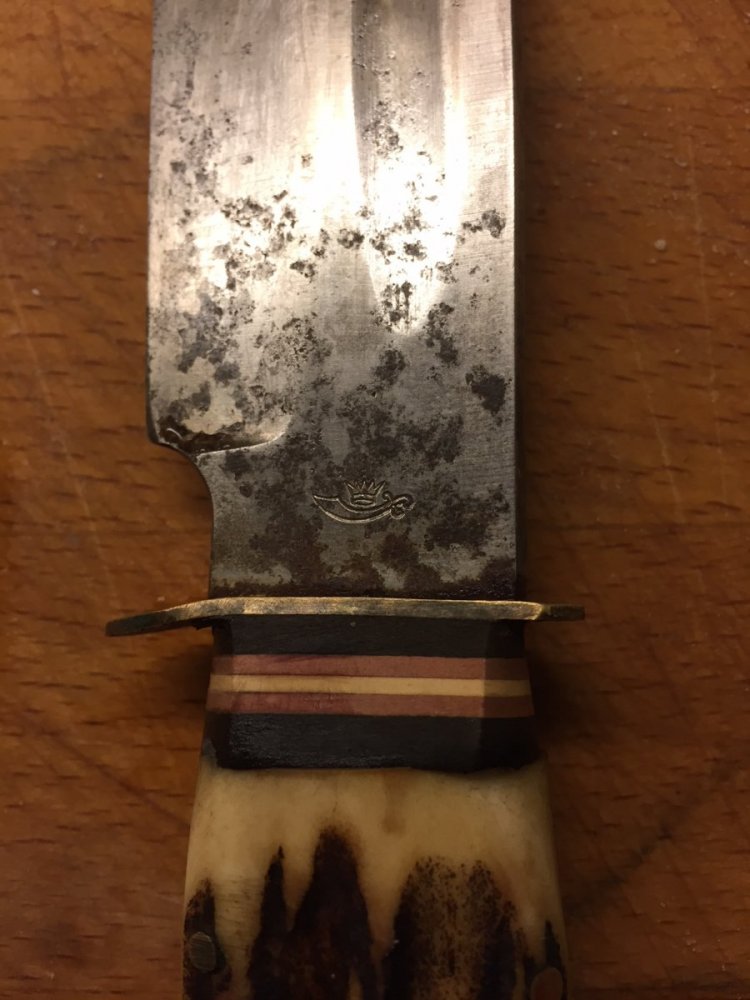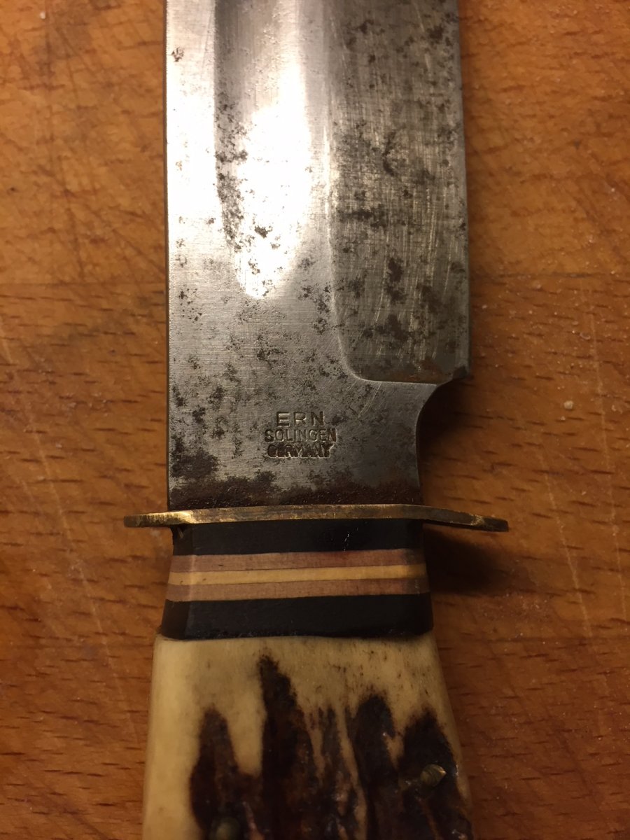 10. Jeg kom for litt siden over en annonse på Finn, hvor jeg tenkte: Den kniven lignet da mistenkelig på en kniv jeg fikk i gave for ca 30 år siden... Etter litt leting fant jeg den, men tidens tann hadde nok utsatt den for mer slitasje enn jeg hadde trodd. Den var både rusten, og sløv, sømmen i sliren har gått litt opp, og er misfagret. Jeg tittet på markeringene på den, og fant etter litt googling ut at det ikke er en Puma kniv, men laget av en knivselskap som heter C.Friedr. Ern & Co som lagde mest barberkniver, men også andre kniver i Solingen,Tyskland mellom 1873 og 1986. Hadde vært gøy å få den restaurert, så derfor lurer jeg på om det var noen kloke hoder blant knivgeeksene som har noen gode forslag til hvordan man bør gå frem? Eller er det like greit å bare levere den inn hos en knivsliper/knivsmed? Hadde også vært moro om det hadde vært mulig å finne ut mer om når den kan ha blitt laget, eller annen info om den. Her er link til en ikke helt ulik kniv på youtube. Ser de beskrives som "fahrtenmesser" dvs en brukskniv? Den er ganske kraftig i bladet (6mm - veier 326 gram?) så kan kanskje ha nogenlunde samme bruksområde som en samekniv? Ellers lurer jeg litt på hvorfor flere av disse knivene som jeg har tittet på ligner såpass mye på hverandre, både i forhold til utseende, men har også ganske like navn (scout f.eks), til tross for at de er laget av forskjellige produsenter... Fantes kanskje ikke copyrightlover i gamle dager? Setter pris på alle svar jeg får!