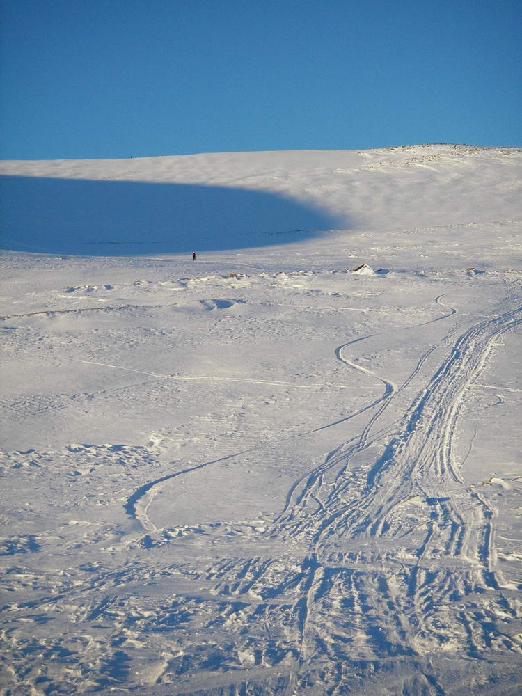 14. Halvtime fra steinbua til bilen på Breen, ja. Føret var ikke spesielt bra å kjøre utfor på - veldig varierende, fra nesten pudder via fokksnø som skia skjærer gjennom til hard fokksnø - innimellom ishard skare. Dårligere jo høyere. Med den vinden som holder meg fra senga nå, blir det i hverfall forblåst inntil vinden legger seg og det kommer mer snø! Men mulig det ikke tar så hardt lenger nord, siden det var silkeføre på Resfjellet dagen etter jeg var på Hornet. Brattskarven - fint å gå fra Skaret - gå opp forbi Remmasetra - se på kartet - mange veivalg. Selv har jeg gått opp en rampe på vestsida av Brattskarven på ski i mars for et par år siden. Startet fra Grøtsetra og gikk over Skarvatnet, opp forbi Remmasetra (Vekvesetra på kartet) langs Remma og over de to vatna der (ofte spor opp til det nedre vatnet, åpen bu er som ike står på kartet) - videre sør for Svarttjøna og opp nevnte rampe. Rente så ned på skiløypa som da var kjørt opp fra Skaret til Blåøret og fulgte den til Blåøret, slalomtraseen via toppen av Stølen og ned til Vangslia (nedre del av 8-tallsløypa) der svigers bor rett nedenfor. Ganske lang tur, krever bra føre.