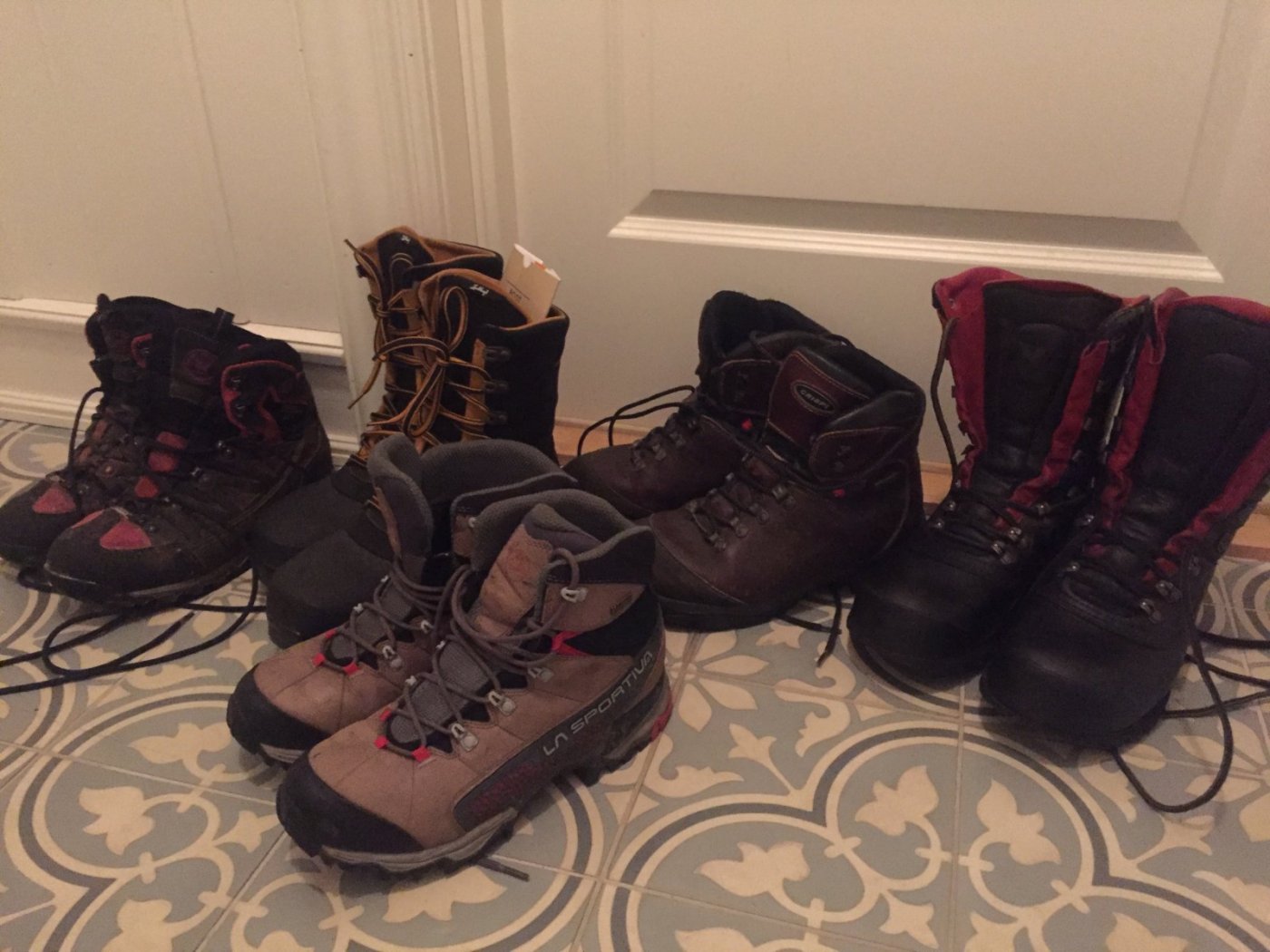 La sportiva nucleo (nye) til dagsturer med litt fart. Myk og god såle, men god ankelstøtte og lett fjellstøvelfølelse. Terningkast fem. Crispi Besseggen (?) til turer der jeg vet jeg møter mye stein. Hard såle og en typisk fjellstøvel. Har aldri likt dem noe særlig, jeg foretrekker mer kontakt med underlaget. Terningkast tre. Lundhags Mira til fjellturer med mye myr, som når jeg glemmer at jeg hater myr og slenger meg med på turer i Trøndelag. Beste støvelen jeg har hatt, men tung! Terningkast seks. Lundhags Mira light. Lettutgaven av støvelen over. Ikke tatt dem i bruk, vært idiot og kjøpt en størrelse for stor. Har skikkelig trua på dem, men de ligger på finn på grunn av størrelsen. Crispi Skogshorn. Grei støvel som passer til det meste. Har brukt de til lengre fotturer med tung sekk og til dagsturer. Litt tunge. Terningkast fem. -
