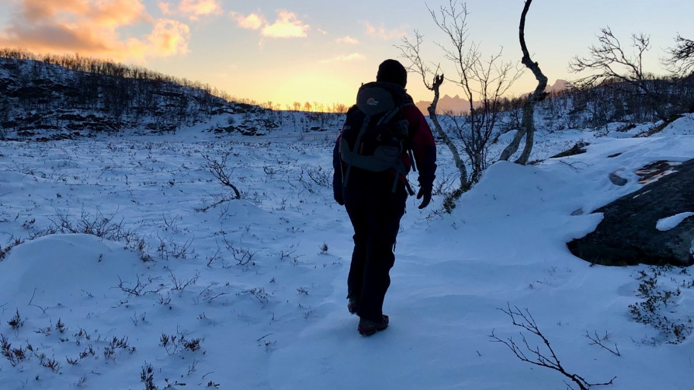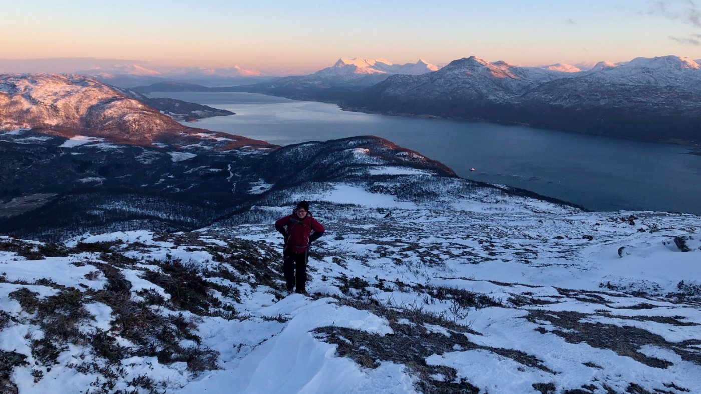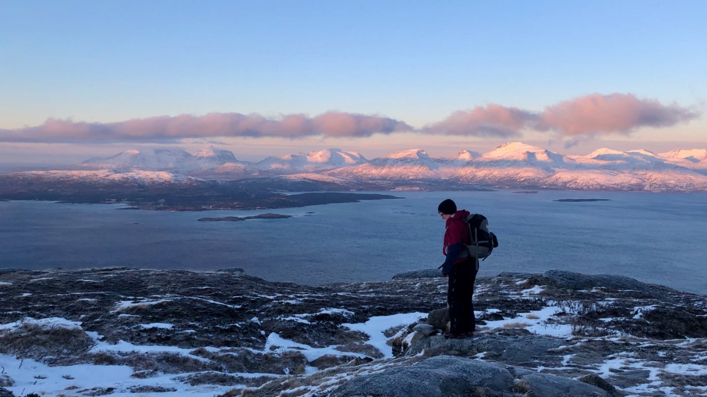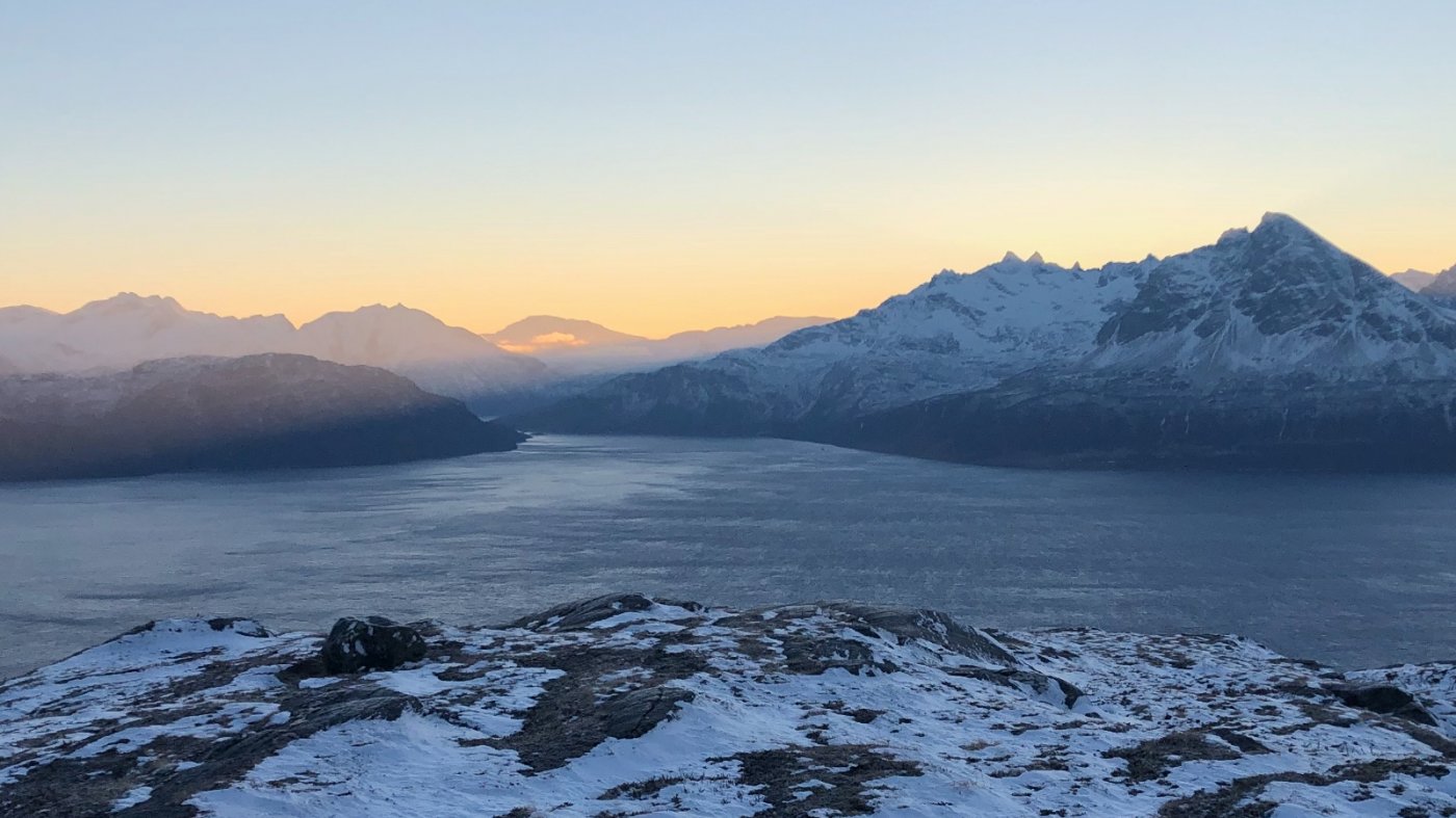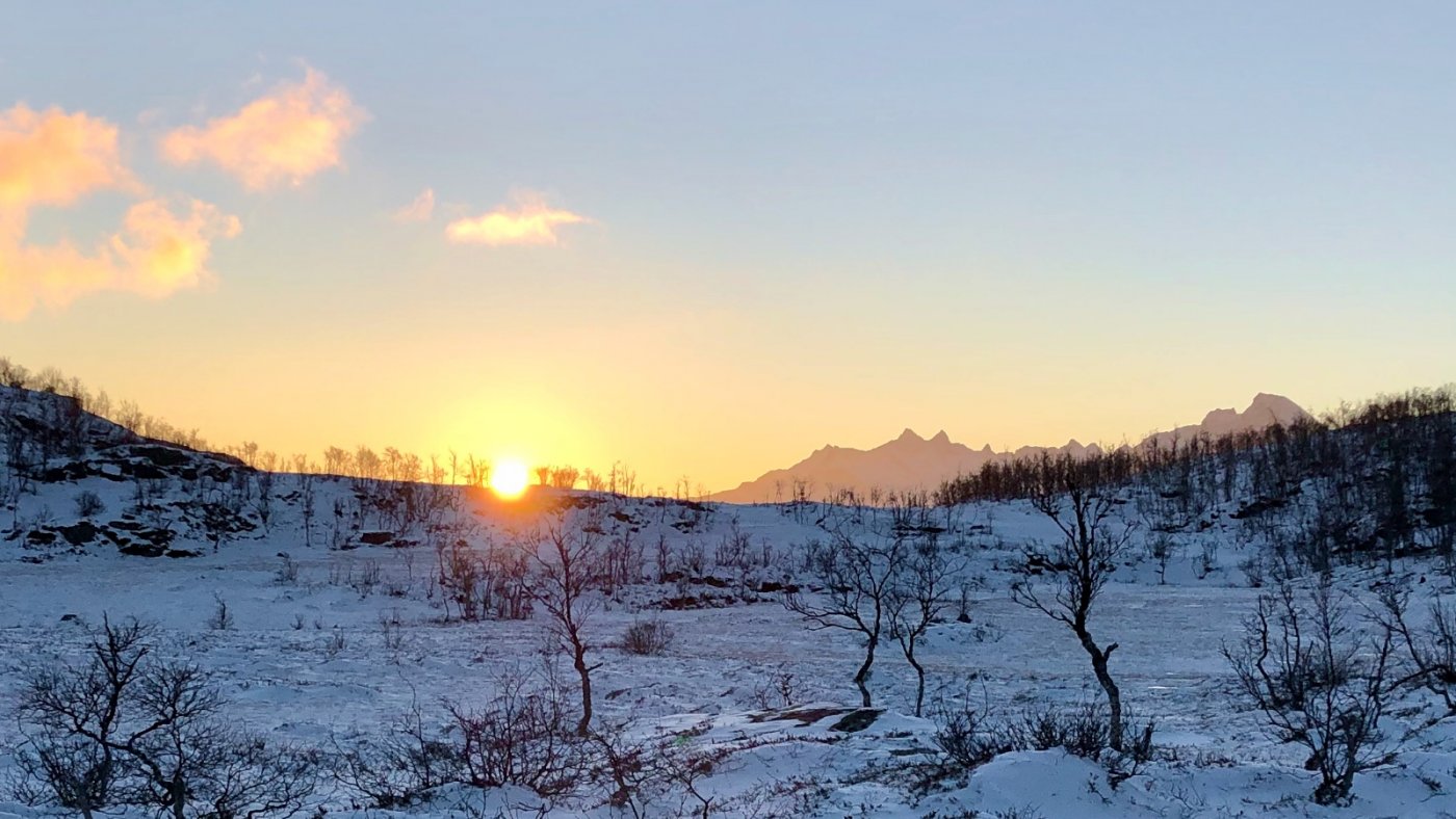 Det er tid for soltilbedelse! @TerjeH og jeg var på Landstedet i helga. Plan A var å gå på ski til et fjell der vi kunne se sola. Før vi kom så langt hadde Frank vært innom og sopt med seg alt som ikke var spikret fast (og en del av det som _var_ spikret fast). Over til plan B, broddetur til Dyrøygommen. Vi hadde ikke bedrevet nøye research før start. Ville vi komme opp i sola? Der var ho! Inn i skyggene igjen mens vi ser lyset i fjellene bak. Is og hardpakket fokksnø. Nødvendig med gode brodder. På toppen er det bare å innse at Norges mest fjellrike øy kaster skygge! Vi var nok en halvtime for seine. Vi får trøste oss med ei glinsende rekke av Senjafjell i stedet. Minus 12 grader og sniktrekk gjorde toppausen kort.