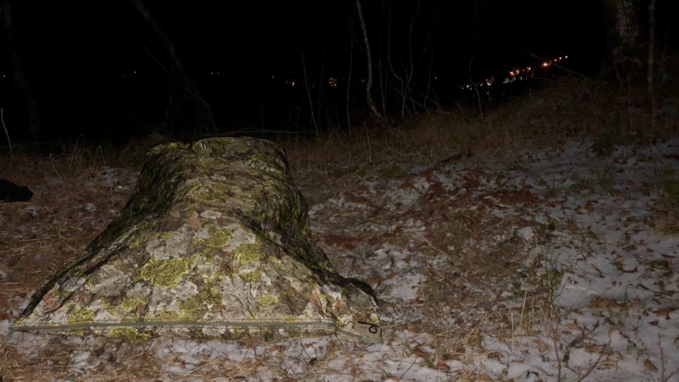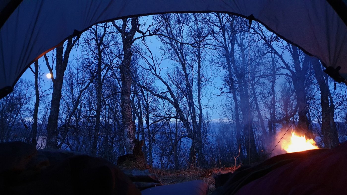 Overgangen fra 2020 til 2021 blei tilbragt sammen med @TerjeH under en tarp på «Lia» oppfor barndomsheimen min. Siden vi blei overraskende invitert på middag hos naboene om kvelden slapp vi å feire med Real turmat. I stedet måtte vi ta det litt rolig i bakkene for å slippe å svelge kalkunen fleire ganger. Under fullmåne og i le for vinden kunne vi bivåne lokale rakettutbrudd og ikke minst følge med når kommunens blålys rykket ut til det som viste seg å være gressbrann. Noen sto opp tidlig for å brenne kaffebål Andre ventet til det blei dagslys og kunne nyte utsikt til både måne og frokostbål. Barmark og tele, men med spiker i stede for plugger stod tarpen godt.